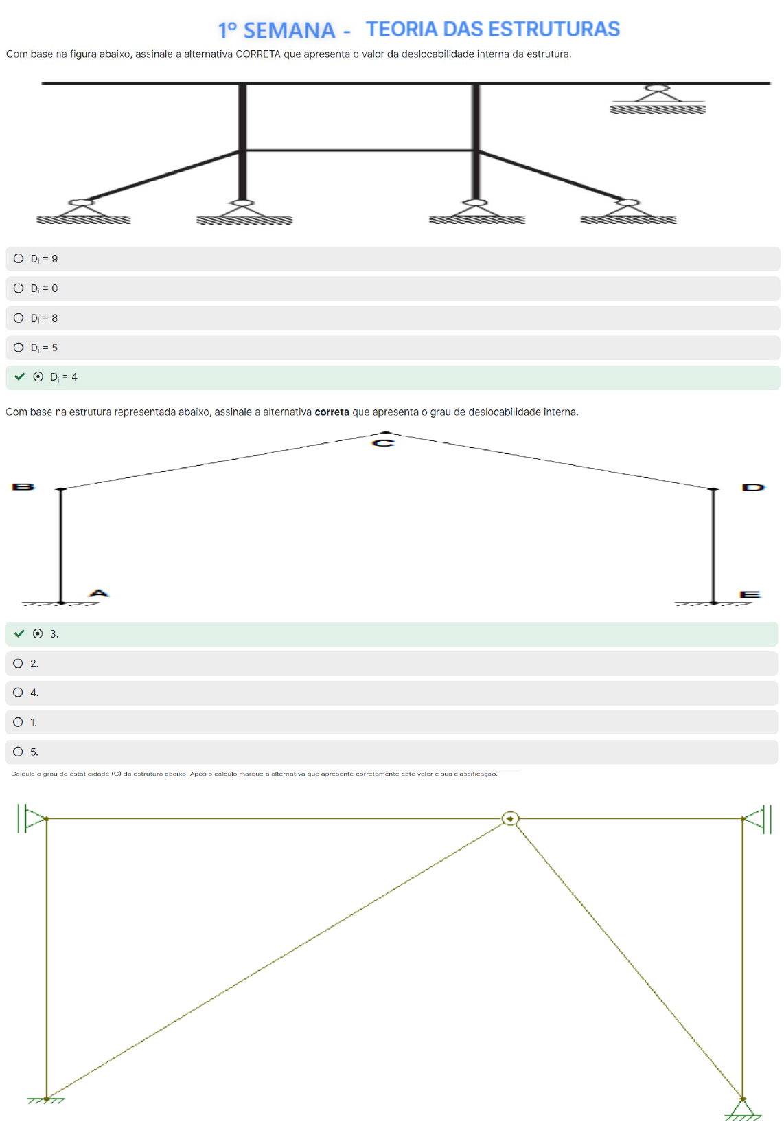 <p>Encontre o valor de Δ2 da equação geral : M [r] = M [0] + Δ1 x M [1] + Δ2 x M [2] + ...</p><p>+ Δi x M [i] , utilizando o método dos deslocamentos para a estrutura representada</p><p>na figura abaixo: obs: para fazer os cálculos com a calculadora deve ser utilizado</p><p>todas as casas sem aproximação. Considere também que esta estrutura tem</p><p>inércia constante da seguinte forma: Trecho AB = 5EI ; Trecho BC = 6EI ; Trecho CD</p><p>=8 EI ; Trecho BE = EI ;Trecho CF =3 EI.</p><p>Utilizando o processo de Cross, determine o coeficiente de distribuição do Nó C,</p><p>trecho CB</p><p>0,279.</p><p>0,450.</p><p>0,550.</p><p>0,433.</p><p>0,323.</p><p>Questão 3</p><p>Estou com dúvida</p><p>Utilizando o processo de Cross, determine o coeficiente de distribuição do Nó C,</p><p>trecho CD</p><p>0,293.</p><p>0,339.</p><p>0,330.</p><p>0,264.</p><p>0,397.</p><p>Questão 3</p><p>Estou com dúvida</p><p>Assinale a alternativa CORRETA que apresenta a reação de apoio vertical no ponto B</p><p>da viga representada na figura abaixo.</p><p>54,23 kN.</p><p>47,16 kN.</p>