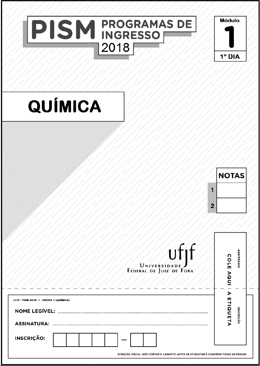 <p>ATENÇÃO:</p><p>1. Suas respostas devem estar escritas obrigatoriamente com caneta esferográfica azul ou preta, de corpo</p><p>transparente.</p><p>2. ESCREVA SEU NOME E ASSINE SOMENTE NO ESPAÇO PRÓPRIO DA CAPA.</p><p>3. NÃO FAÇA NAS DEMAIS PÁGINAS QUALQUER MARCA PARA ALÉM DO SEU TEXTO. Qualquer tipo de</p><p>identificação pessoal do candidato nas folhas de questões acarretará sua eliminação.</p><p>4. Não ultrapasse o espaço que está pautado nas questões.</p><p>Página 1 de 2</p><p>UNIVERSIDADE FEDERAL DE JUIZ DE FORA</p><p>PISM 2018 – Módulo I – Dia 1</p><p>PROVA DISCURSIVA DE QUÍMICA</p><p>QUESTÃO 1–Os compostos contendo cloreto estão entre os mais corriqueiros da química inorgânica. Dentre esses</p><p>compostos encontram-se o cloreto de potássio (A), tricloreto de boro (B), pentacloreto de antimônio (C) e cloreto</p><p>férrico (D).</p><p>a) Qual a fórmula química de cada cloreto citado no texto acima?</p><p>A B C D</p><p>KCl</p><p>(0,5 ponto)</p><p>BCl3</p><p>(0,5 ponto)</p><p>SbCl5</p><p>(0,5 ponto)</p><p>FeCl3</p><p>(0,5 ponto)</p><p>b) Qual a geometria molecular do composto B?</p><p>Trigonal planar (1,0 ponto)</p><p>c) Escreva a estrutura de Lewis para o composto C.</p><p>(1,0 ponto)</p><p>d) O composto A dissolvido em água constitui uma mistura homogênea ou heterogênea? Justifique sua resposta.</p><p>O composto A constitui uma mistura homogênea porque ocorre dissolução total do sólido, pois o mesmo é um</p><p>composto iônico.</p><p>(1,0 ponto)</p><p>Página 2 de 2</p><p>UNIVERSIDADE FEDERAL DE JUIZ DE FORA</p><p>PISM 2018 – Módulo I – Dia 1</p><p>PROVA DISCURSIVA DE QUÍMICA</p><p>QUESTÃO 2 – O gás liquefeito de petróleo (GLP) é uma mistura de gases de hidrocarbonetos utilizado como</p><p>combustível em aplicações de aquecimento e veículos. Os componentes do GLP, embora</p><p>à temperatura e pressão ambiente sejam gases, são fáceis de condensar (liquefazer). Esta propriedade facilita o</p><p>transporte dos mesmos através dos gasodutos. Considere uma mistura dos gases etano, propano e butano, com seus</p><p>respectivos pontos de ebulição e responda as questões a seguir:</p><p>Gás Ponto de ebulição (°C) a 1 atm</p><p>Etano -93</p><p>Propano -45</p><p>Butano 0,6</p><p>a) Qual dos gases estará na forma líquida a -10 °C e à pressão de 1 atm.</p><p>Butano</p><p>(1,0 ponto)</p><p>b) Na temperatura de 5 °C, qual será a composição da mistura gasosa?</p><p>Etano, propano e butano</p><p>(1,5 ponto)</p><p>c) Na temperatura de -5 °C, qual será a composição da fase gasosa da mistura?</p><p>Etano e propano</p><p>(1,5 ponto)</p><p>d) Abaixando-se gradativamente a temperatura a partir de 25</p><p>o</p><p>C, qual gás irá liquefazer primeiro?</p><p>Butano</p><p>(1,0 ponto)</p><p>COORDENAÇÃO GERAL DE PROCESSOS SELETIVOS – COPESE</p><p>MÓDULO I DO PISM – TRIÊNIO 2017-2019</p><p>INSTRUÇÕES PARA A REALIZAÇÃO DA PROVA DISCURSIVA</p><p>--------------------------------------------------------------------- CORTE AQUI -------------------------------------------------------------------</p><p>Antes de abrir esse caderno, leia atentamente as instruções.</p><p>Antes da prova:</p><p>� Não use em sala: boné, chapéu, chaveiros de qualquer tipo, óculos escuros, relógio e similares.</p><p>� Se você possui cabelos compridos, mantenha-os presos, deixando as orelhas descobertas.</p><p>� Mantenha com você somente materiais de escrita, documento de identificação, alimentos, água</p><p>(em garrafa transparente) e medicamentos, se necessário. Tudo o mais que trouxer deve ficar no</p><p>saco plástico que você recebeu, amarrado e colocado embaixo da cadeira.</p><p>� Assine a lista de presença com a assinatura idêntica à da sua identidade.</p><p>� Se solicitado pelo Fiscal, assine a Ata de Abertura do Lacre da pasta que contém as provas.</p><p>� Quando autorizado, vire o caderno e preencha os dados na capa.</p><p>� Abra seu caderno e confira se sua prova tem 2 questões. Caso haja algum problema, solicite</p><p>imediatamente a substituição de seu caderno de questões.</p><p>� Você terá 4 horas e 30 minpara fazer as provas de hoje.Você só pode sair da sala 1h e 30min depois</p><p>do início do exame.</p><p>� Será excluído do concurso o candidato que for flagrado portando ou mantendo consigo celular</p><p>e/ou aparelho e componente eletrônico.</p><p>Durante a prova:</p><p>� Suas respostas devem estar escritas obrigatoriamentecomcaneta esferográfica azul ou preta, de</p><p>corpo transparente.</p><p>� Devolva ao fiscal esse caderno de questões completo. Se não fizer isso, sua prova não será</p><p>corrigida.</p><p>� Se as folhas do seu caderno se soltarem, por algum motivo, peça ao fiscal que as grampeie</p><p>novamente.</p><p>� Os três últimos candidatos deverão permanecer até o final da prova para assinar a Ata de</p><p>Encerramento do exame.</p><p>� Comunique aos fiscais qualquer irregularidade observada durante a realização da prova. Se eles não</p><p>tomarem as devidas providências, solicite a presença do Coordenador do Setor ou fale com ele</p><p>depois que você sair da sala.</p>