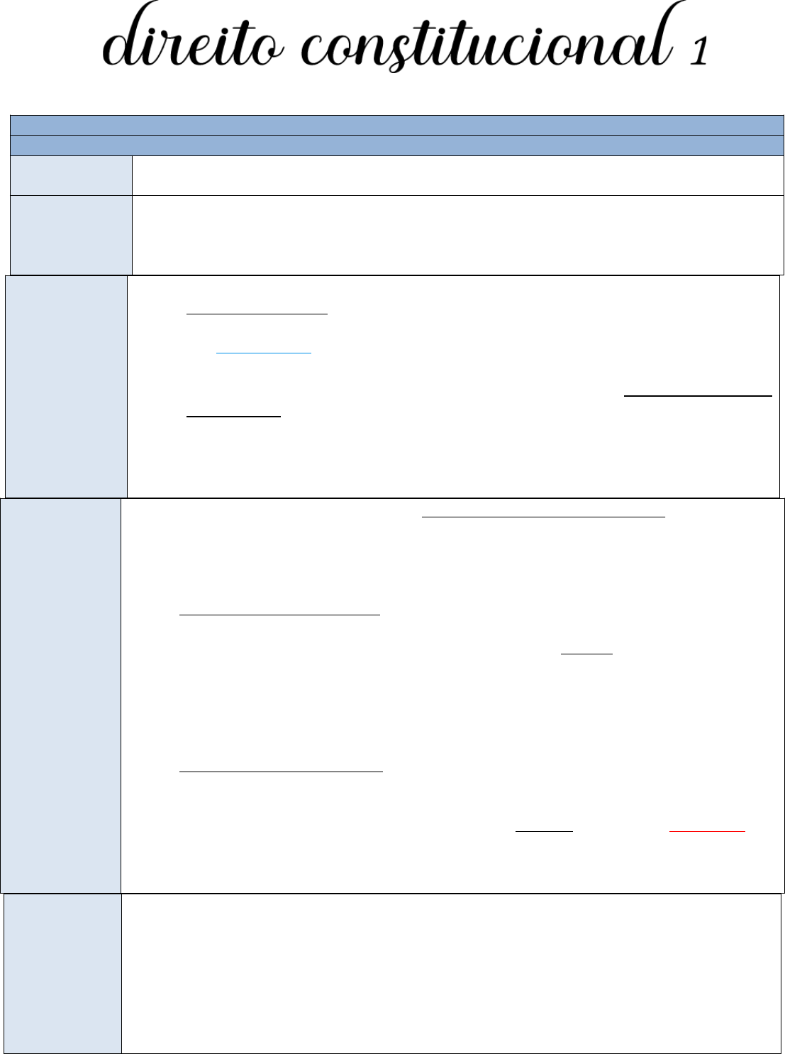 <p>Introdução ao direito Constitucional</p><p>Função da Constituição</p><p>Conceito de direito</p><p>Conjunto de normas emanadas do estado normas jurídicas positivas, para viabilizar a vida em sociedade.</p><p>Conceito de direito Constitucional</p><p>É o conhecimento sistematizado das regras jurídicas relativas a forma do estado, a forma do governo ao modo de aquisição e exercício do poder aos seus órgãos.</p><p>Quanto a Forma</p><p>· Escrita é formada por um conjunto de regras sistematizadas e organizadas em um único texto, estabelecendo as normas fundamentais de um estado.</p><p>Ex: Constituição de 88, portuguesa, espanhola.</p><p>· Não escrita (não-escrita ou consuetudinária) que não traz regras em um único texto solene e codificado. É formada por textos esparsos, reconhecidos pela sociedade como fundamentais, e baseia-se nos usos e costumes, jurisprudência, convenções.</p><p>Ex: Constituição inglesa.</p><p>Quanto à origem de sua posição</p><p>· Outorgada é a Constituição imposta de maneira unilateral, pelo agente revolucionário que não recebeu do povo a legitimidade para em nome dele atuar.</p><p>Ex: 1824 Imperial, 1937 Era Vargas, 1967 Ditadura Militar</p><p>Sem participação do povo</p><p>· Promulgada também chamada de democrática, votada ou popular é aquela fruto da Assembleia Nacional Constituinte, eleita diretamente pelo povo, para em nome dele atuar, nascendo da deliberação da representação legítima popular.</p><p>Ex: 1891 República, 1934 Social, 1946 e a atual de 1988.</p><p>Com Participação do povo</p><p>· Cesarista ou Bonapartista projeto elaborado por um Imperador ou um Ditador e subemetida a um referendo popular para dar aparência de legitimidade de democracia. A participação popular não é democrática, é uma CF outorgada pois visa apenas ratificar a vontade do imperador ou ditador do poder.</p><p>Quanto à extensão</p><p>· Constituição Analítica (expansiva) trata de todos os assuntos considerados fundamentais pelo povo. Há necessidade de modificações para atender as mutações sociais</p><p>Ex: Art. 226 paragrafo 3º</p><p>· Constituição Sintética ( Concisa) é muito enxuta e duradoura trás princípios estruturais do estado de acordo com anseios sociais.</p><p>Ex: CF da EUA promulgada em 1788 possui 7 artigos e 27 emendas= 236 anos</p><p>Quanto ao modo de elaboração</p><p>· C. Dogmatica: sempre escrita se constitui de dogmas estruturais e fundamentais do estado é escrita.</p><p>· C. Histórica (common law) é aquele que se constitui através de um lento e contínuo processo reunindo a história e as tradições de um povo. Aproximam-se da costumeira.</p><p>Ex: inglesa</p><p>Quanto da alterabilidade da Constituição</p><p>· Rígidas: são aquelas que exigem, para a sua alteração um processo legislativo mais árduo, mais solene, mais dificultoso do que o processo de alteração das normas não constitucionais.</p><p>Ex: Art.60, I,II,e III CF/88.</p><p>Quem pode propor uma PEC= projeto de emenda Constitucional?</p><p>Art. 60. A Constituição poderá ser emendada mediante proposta:</p><p>I - de um terço, no mínimo, dos membros da Câmara dos Deputados ou do Senado Federal;</p><p>II - do Presidente da República;</p><p>III - de mais da metade das Assembléias Legislativas das unidades da Federação, manifestando-se, cada uma delas, pela maioria relativa de seus membros.</p><p>Quorum de apresentação das EC</p><p>2 turnos</p><p>2 casas</p><p>3/5 em cada casa</p><p>Ex: PEC do voto empresso</p><p>(PEC – EC 131/ 2023 PEC das nacionalidades</p><p>· Semi-Rígida: É aquela que possui 2 procedimentos diferentes para modificação de suas regras.</p><p>Formal – texto da Constituição</p><p>Flexível – 4ºpoder moderador</p><p>Quanto a Função da Constituição</p><p>· Garantia: É aquela que vai garantir os direitos fundamentais da pessoa e dos limites do poder do estado.</p><p>· Balanço: Verificar de tempos em tempos a realidade social e adapta-la a CF</p><p>· Dirigente: Função de limitar e estruturar o poder, a atuação do governo por meio do programas sociais. E a CF “Dever-ser”. Pré-ordena programas e metas para o Estado alcançar.</p><p>Conceito de poder constituinte</p><p>O poder constituinte é a capacidade de elaborar e modificar normas constitucionais, estabelecendo uma organização jurídica fundamental e dando forma ao Estado. Em outras palavras, é o poder de definir uma nova Constituição ou de alterar uma já existente.</p><p>Assim, ele constitui poderes e cria normas de exercício de governo, bem como dos seus órgãos, os limites da sua ação e as bases do ordenamento econômico e social presentes.</p><p>O titular do poder constituinte é o povo, representado por um órgão colegiado, como uma Assembleia Constituinte. A legitimação desse poder é a representação da democracia de um Estado soberano, por meio das eleições, recebendo a atribuição de elaborar a Constituição. Pode ser estabelecido de forma originária ou derivada.</p><p>Exerce o poder constituinte</p><p>· Poder constituinte é exercido pelo povo, representado por um órgão colegiado, como uma Assembleia Constituinte.</p><p>Esse poder também representa a democracia de um Estado soberano, quando o povo faz suas escolhas de líderes e representantes por meio das eleições, pois é o Congresso Nacional — eleito pela maioria, em uma democracia — que representa a nação.</p><p>São características do poder constituinte originário:</p><p>I. É inicial: o resultado do seu trabalho, a Constituição, é a base do ordenamento jurídico, é o documento que inaugura juridicamente um novo Estado e ocasiona a ruptura total com a ordem anterior.</p><p>II. É ilimitado: as normas jurídicas anteriormente estabelecidas não são capazes de limitar a sua atividade nem restringem sua atuação.</p><p>III. É incondicionado: não se submete a qualquer regra ou procedimento, forma pré-fixada pelo 
