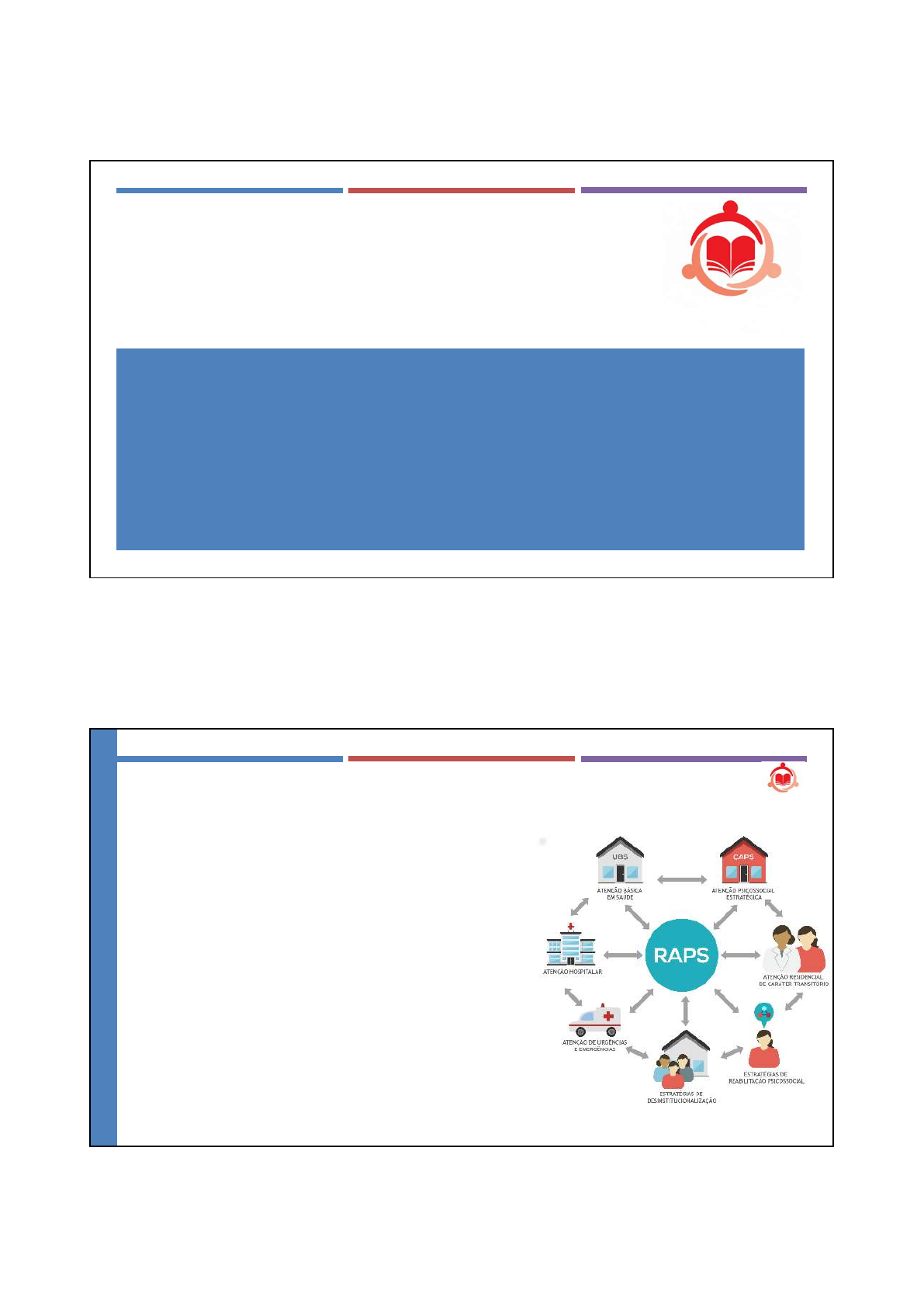 <p>01/11/2022</p><p>1</p><p>CEPROAL</p><p>CENTRO DE ENSINO PROFISSIONALIZANTE DE ALAGOAS</p><p>CURSO DE TÉCNICO DE ENFERMAGEM</p><p>ASSISTÊNCIA À SAÚDE MENTAL IV</p><p>COMPONENTES DA REDE DE ATENÇÃO PSICOSSOCIAL</p><p>Enf. Ademir Ferreira Júnior</p><p>COREN-AL-682.131-ENF</p><p>Especialista em Docência do Ensino Superior</p><p>Pós-graduando em Enfermagem em Saúde Mental e Psiquiátrica</p><p>Pós-graduando em Enfermagem do Trabalho</p><p>REDE DE ATENÇÃO PSICOSSOCIAL – RAPS</p><p> é um instrumento para o cuidado integral à saúde</p><p>mental da população brasileira. Pela diversidade dos</p><p>estabelecimentos e serviços, as diretrizes e princípios</p><p>da RAPS estão ancorados nos direitos humanos, e a</p><p>execução de ações acontece via meios intra e</p><p>intersetoriais, em redes capilarizadas nos territórios.</p><p>1</p><p>2</p><p>01/11/2022</p><p>2</p><p>REDE DE ATENÇÃO PSICOSSOCIAL – RAPS</p><p> A rede se apoia na Política Nacional de Saúde Mental do Ministério da Saúde, que</p><p>nacionalmente organiza as ações de promoção da saúde mental, prevenção de agravos,</p><p>assistência e cuidado, bem como reabilitação e reinserção das pessoas com transtornos</p><p>mentais, muitos dos quais envolvem, por exemplo, problemas com o uso de álcool e outras</p><p>drogas.</p><p> As diretrizes e ações da RAPS têm sido pautadas em evidências científicas, pelo Ministério,</p><p>buscando a implementação de ações, ancoradas nas melhores práticas, para disponibilizar,</p><p>de forma efetiva, cuidados adequados à população.</p><p>REDE DE ATENÇÃO PSICOSSOCIAL – RAPS</p><p> CUIDADO</p><p> Promove o cuidado às pessoas com sofrimento ou transtorno mental, e com necessidades</p><p>decorrentes do uso de drogas</p><p> ATENDIMENTO INTEGRAL</p><p> Visa o atendimento integral e humanizado, com foco no acolhimento, acompanhamento</p><p>contínuo e vinculação à rede.</p><p> SINGULARIDADE</p><p> Vai ao encontro dos sujeitos nos territórios, levando em conta toda</p><p>a singularidade do contexto e da pessoa.</p><p>3</p><p>4</p><p>01/11/2022</p><p>3</p><p>REDE DE ATENÇÃO PSICOSSOCIAL – RAPS</p><p> Levantamento atual mostra que o Brasil conta com 2.742 CAPS habilitados e estruturados</p><p>em 1.845 municípios ao redor do País, com unidades em todos os estados e no Distrito</p><p>Federal. Essa capacidade instalada soma investimento de incentivo de custeio anual de</p><p>R$ 1.234.308.138,00 nessa modalidade de serviço.</p><p>5</p><p>6</p><p>01/11/2022</p><p>4</p><p>REDE DE ATENÇÃO PSICOSSOCIAL – RAPS</p><p> Os principais serviços já implantados no estado são os Centros de Atenção Psicossocial</p><p>(CAPS), as Unidades de Acolhimentos (UA) e as Residências Terapêuticas. No estado de</p><p>Alagoas estão habilitados 55 CAPS, distribuídos ao longo de todo território, entre CAPS I,</p><p>CAPSII, CAPSad, CAPSi entre outros.</p><p>MAPA DA SAÚDE DE ALAGOAS – CAPS</p><p>7</p><p>8</p><p>01/11/2022</p><p>5</p><p>RESOLUÇÃO Nº 32, DE 14 DE DEZEMBRO DE 2017</p><p> Art. 1º - Estabelecer as diretrizes para o fortalecimento da RAPS. Considera-se como componentes da</p><p>RAPS os seguintes pontos de atenção:</p><p> 1. Atenção Básica;</p><p> 2. Consultório na Rua;</p><p> 3. Centros de Convivência;</p><p> 4. Unidades de Acolhimento (Adulto e Infanto-Juvenil);</p><p> 5. Serviços Residenciais Terapêuticos (SRT) I e II;</p><p>RESOLUÇÃO Nº 32, DE 14 DE DEZEMBRO DE 2017</p><p> 6. Hospital Dia;</p><p> 7. Unidades de Referência Especializadas em Hospitais Gerais;</p><p> 8. Centros de Atenção Psicossocial nas suas diversas modalidades;</p><p> 9. Equipe Multiprofissional de Atenção Especializada em Saúde Mental;</p><p> 10. Hospitais Psiquiátricos Especializados.</p><p>9</p><p>10</p><p>01/11/2022</p><p>6</p><p>OBJETIVOS GERAIS DA RAPS</p><p> Ampliar o acesso à atenção psicossocial da população em geral;</p><p> Promover o acesso das pessoas com transtornos mentais e com necessidades decorrentes do uso de</p><p>crack, álcool e outras drogas e suas famílias aos pontos de atenção;</p><p> Garantir a articulação e integração dos pontos de atenção das redes de saúde no território, qualificando</p><p>o cuidado por meio do acolhimento, do acompanhamento contínuo e da atenção às urgências.</p><p>OBJETIVOS ESPECÍFICOS DA RAPS</p><p>I - promover cuidados em saúde especialmente para grupos mais vulneráveis (criança, adolescente,</p><p>jovens, pessoas em situação de rua e populações indígenas);</p><p>II - prevenir o consumo e a dependência de crack, álcool e outras drogas;</p><p>III - reduzir danos provocados pelo consumo de crack, álcool e outras drogas;</p><p>11</p><p>12</p><p>01/11/2022</p><p>7</p><p>OBJETIVOS ESPECÍFICOS DA RAPS</p><p>IV - promover a reabilitação e a reinserção das pessoas com transtorno mental e com necessidades</p><p>decorrentes do uso de crack, álcool e outras drogas na sociedade, por meio do acesso ao trabalho,</p><p>renda e moradia solidária;</p><p>IV - promover a reabilitação e a reinserção das pessoas com transtorno mental e com necessidades</p><p>decorrentes do uso de crack, álcool e outras drogas na sociedade, por meio do acesso ao trabalho,</p><p>renda e moradia solidária;</p><p>V - promover mecanismos de formação permanente aos profissionais de saúde;</p><p>OBJETIVOS ESPECÍFICOS DA RAPS</p><p>VI - desenvolver ações intersetoriais de prevenção e redução de danos em parceria com organizações</p><p>governamentais e da sociedade civil;</p><p>VII - produzir e ofertar informações sobre direitos das pessoas, medidas de prevenção e cuidado e os</p><p>serviços disponíveis na rede;</p><p>VIII - regular e organizar as demandas e os fluxos assistenciais da Rede de Atenção Psicossocial;</p><p>IX - monitorar e avaliar a qualidade dos serviços por meio de indicadores de efetividade e</p><p>resolutividade da atenção.</p><p>13</p><p>14</p><p>01/11/2022</p><p>8</p>