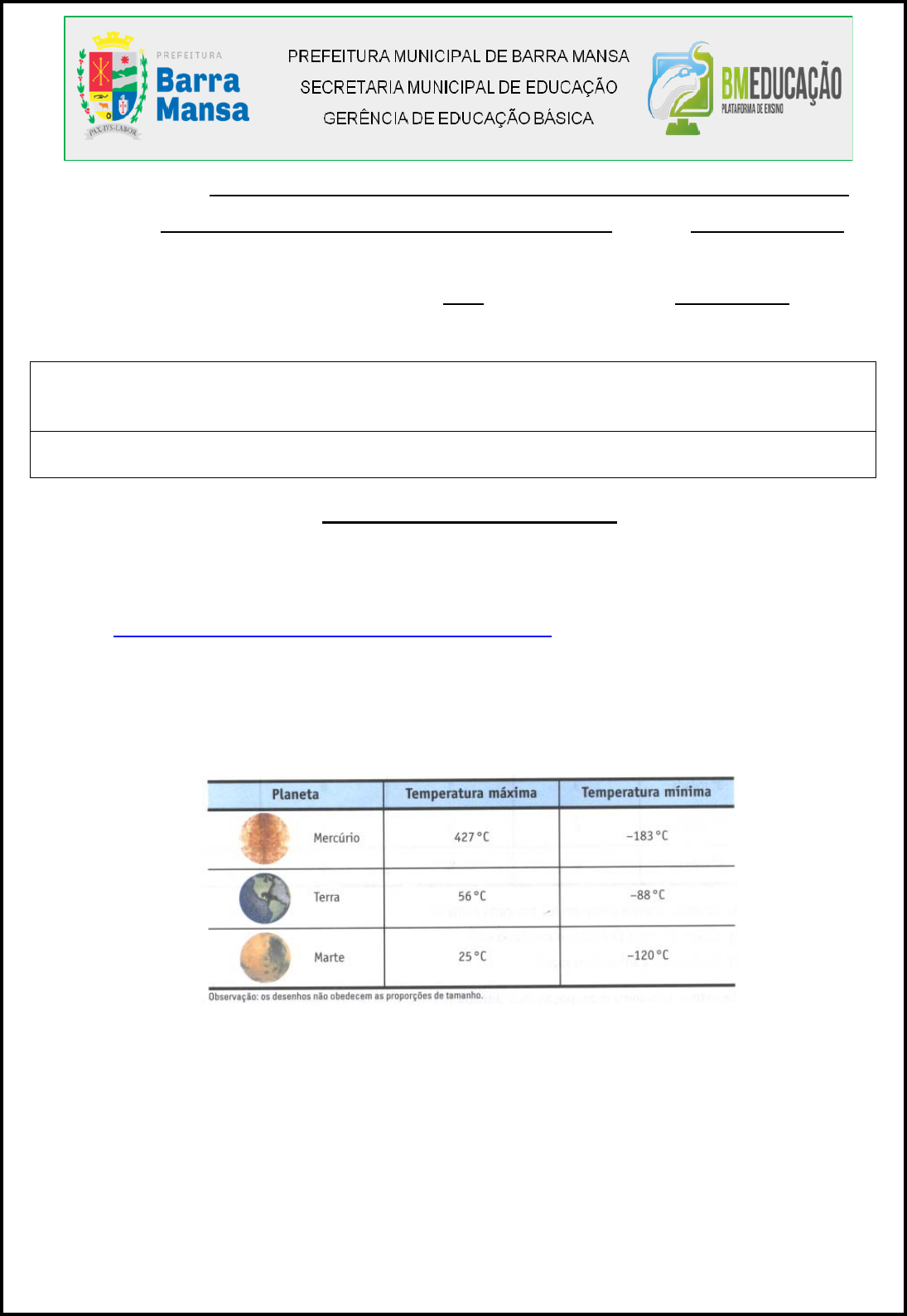 <p>Matemática- Profª Roberta Pires/ Prof. Euler- Semana 4</p><p>Unidade Escolar:</p><p>Nome: Data:</p><p>COMPONENTE CURRICULAR: MATEMÁTICA</p><p>ENSINO FUNDAMENTAL I -6º/ 7º ANO/CICLO - 2021 TURMA</p><p>SEMANA IV – 22 a 26/03/2021</p><p>Habilidades a serem desenvolvidas: (EF07MA03) Comparar, ordenar números inteiros em</p><p>diferentes contextos, incluíndo histórico, associá-los a pontos da reta numérica e utilizá-los</p><p>em situações que envolvam adição e subtração.</p><p>Orientações:</p><p>Ao terminar de fazer a atividade, cole em seu caderno. Tente ser o mais organizado possível.</p><p>ATIVIDADE REMOTO/ HIBRIDO</p><p>Olá Alunos e Alunas!</p><p>Prosseguindo com nossos estudos de números inteiros, vamos iniciar as operações</p><p>com eles adição e subtração. Assistindo ao vídeo e resolvendo os exercicios abaixo:</p><p>https://www.youtube.com/watch?v=2NKWfi942wg</p><p>Mãos na massa:</p><p>1 - Veja as temperaturas máximas e mínimas de alguns planetas:</p><p>Calcule a diferença entre a temperatura máxima e mínima de cada um desses</p><p>planetas:</p><p>a) Mercúrio: 427º – ( – 183º ) =</p><p>b) Terra: 56º – ( – 88º ) =</p><p>c) Marte: 25º – ( – 120º ) =</p><p>Matemática- Profª Roberta Pires/ Prof. Euler- Semana 4</p><p>2 - Movimentar uma conta bancária significa obter créditos (por meio de depósitos) ou fazer</p><p>débitos (por meio do pagamento de cheques ou contas, da retirada de dinheiro em caixas</p><p>eletrônicos, etc.). Para o cliente saber como “anda sua conta”, o banco lhe fornece um</p><p>informativo, denominado “extrato”. Observe, abaixo, um extrato bancário hipotético.</p><p>Imagine-se você o cliente do extrato apresentado...</p><p>a) Sua conta está, num primeiro momento, em débito de R$ 254,50. Com a movimentação</p><p>do dia 07/01, como fica sua situação?</p><p>__________________________________________________________________________</p><p>b) No dia 08/01 ocorrem novos débitos e créditos na conta. Qual o saldo final neste dia?</p><p>__________________________________________________________________________</p><p>c) Novamente houve movimentação na conta em 09/01. Qual seu saldo final neste dia?</p><p>__________________________________________________________________________</p><p>3 - Dona Vera sempre faz compras no armazém “Bom e Barato”. Seu José, dono do</p><p>armazém, marca tudo num caderno. Ele marcou os créditos com o sinal + e as dívidas com o</p><p>sinal –.</p><p>a) Observe o que aconteceu num certo mês e registre como você imagina que seu José fez</p><p>suas anotações:</p><p>- Ela fez uma compra de 18 reais e não pagou.</p><p>- Ela fez uma compra de 10 reais e também não pagou.</p><p>Matemática- Profª Roberta Pires/ Prof. Euler- Semana 4</p><p>- Ela foi ao armazém e pagou 20 reais ao seu José.</p><p>Dona Vera tem crédito ou dívida com o seu José? De que valor? __________________</p><p>b) No mês seguinte a esse, em 14 dias, dona Vera fez outras compras:</p><p>- Ela fez uma compra de 30 reais e não pagou. Seu José não se esqueceu da situação</p><p>de dona Vera no final do mês anterior e registrou tudo. Como ficou esse registro?</p><p>___________________________________________________________________________</p><p>- Ela fez uma compra de 15 reais e pagou 40 reais. Como foi registrado?</p><p>___________________________________________________________________________</p><p>- Ela foi ao armazém e pagou 20 reais para o seu José.</p><p>___________________________________________________________________________</p><p>- E agora, dona Vera tem crédito ou dívida com o seu José? De que valor?</p><p>___________________________________________________________________________</p><p>4 - Um mergulhador saltou de um ponto situado 6m acima do nível do mar e desceu 20m a</p><p>partir do ponto inicial.</p><p>a) Use um número inteiro positivo ou um número inteiro negativo para indicar a posição onde</p><p>ele se encontra em relação ao nível do mar. ______________________________________</p><p>b) Do ponto onde estava ele desceu, ainda, 5m. A que posição chegou em relação ao nível</p><p>do mar? ___________________________________________________________________</p><p>5 - Complete as sentenças, a fim de obter sentenças verdadeiras:</p><p>a) – 1 e +1 são números inteiros ________________</p><p>b) 7 e -7 também são números inteiros _______________.</p><p>c) O simétrico de 30 é ________.</p><p>d) O oposto de – 30 é ________.</p><p>6 - Complete com os símbolos < , > ou = :</p><p>a) 0 __ 1 b) 17 __ – 17 c) – 20 __ – 1 d) – 3 __ 6</p><p>e) – 8 __ 0 f) 0 __ – 50 g) – 14 __ – 61 h) – 26 __ – 95</p><p>Vamos pesquisar o</p><p>que é números</p><p>simétricos e</p><p>opostos.</p><p>Faça um pequeno</p><p>resumo em seu</p><p>caderno.</p>