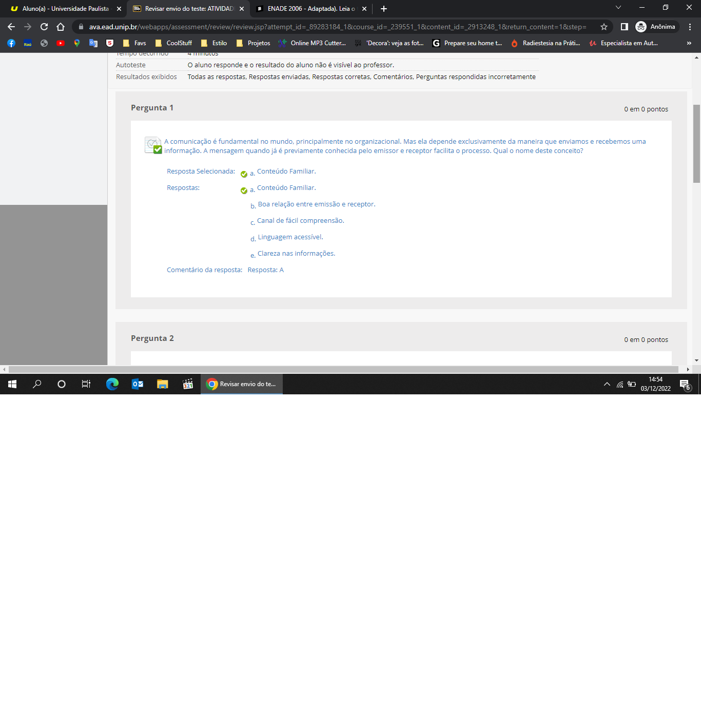 <p>Aluno(a) - Universidade Paulista Revisar envio do teste: ATIVIDAD ENADE 2006 Adaptada). Leia + X Anônima Itaú S CoolStuff Estilo Projetos Online MP3 Cutter... 'Decora's veja as fot... G Prepare seu home t... Radiestesia na Especialista em Aut... Autoteste o aluno responde e o resultado do aluno não é visível ao professor. Resultados exibidos Todas as respostas, Respostas enviadas, Respostas corretas, Comentários, Perguntas respondidas incorretamente Pergunta 1 0 em 0 pontos A comunicação é fundamental no principalmente no organizacional. Mas ela depende exclusivamente da maneira que enviamos e recebemos uma informação. A mensagem quando já é previamente conhecida pelo emissor e receptor facilita processo. Qual nome deste conceito? Resposta Selecionada: a. Conteúdo Familiar Respostas: a. Conteúdo Familiar. b. Boa relação entre emissão e receptor. Canal de fácil compreensão. d. Linguagem e. Clareza nas informações. Comentário da resposta: Resposta: A Pergunta 2 0 em 0 pontos 14:54 321 Revisar envio do te... 03/12/2022 6</p>