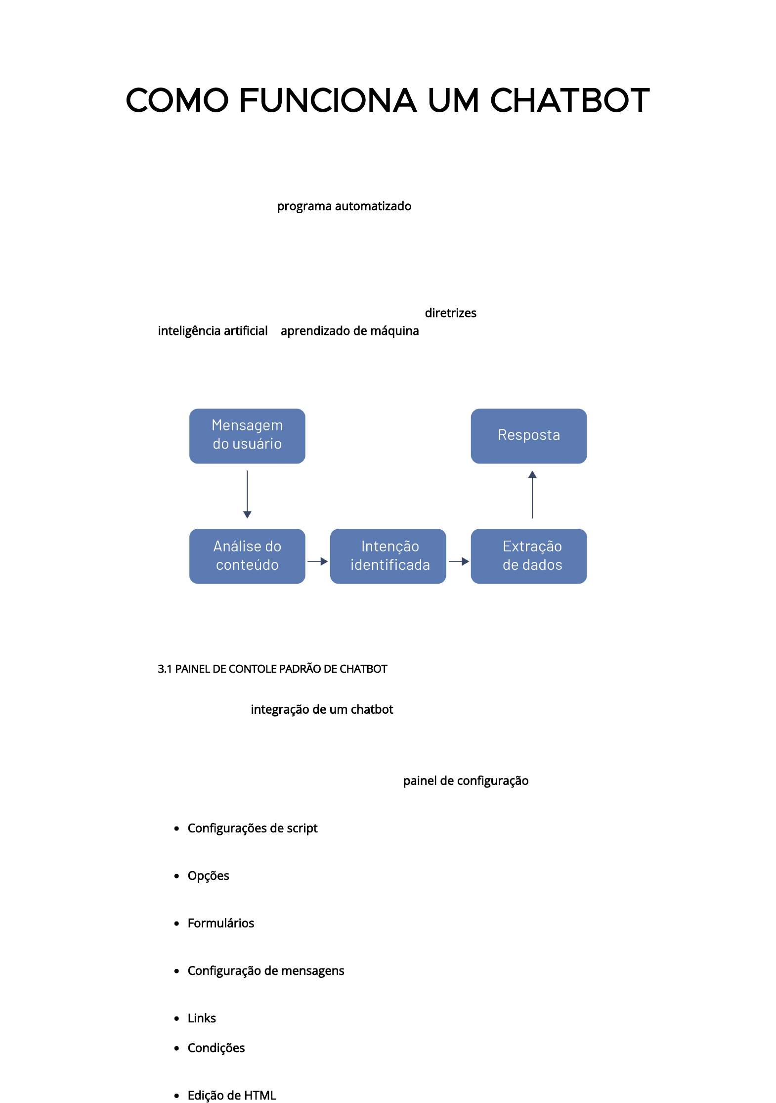 <p>28/06/2023, 23:11 Livro Digital - CHATBOTS</p><p>https://livrodigital.uniasselvi.com.br/livres/chatbots/conteudo.html?capitulo=3 1/3</p><p>COMO FUNCIONA UM CHATBOT</p><p>Con�gurações de script: área em que instâncias, nomes e scripts de execução</p><p>são criados.</p><p>Opções: seleção de respostas, produtos, links, QR codes e diversas outras</p><p>instâncias que podem ser utilizadas pelo usuário.</p><p>Formulários: podem ser criados e selecionados para capturar dados</p><p>imediatos do usuário.</p><p>Con�guração de mensagens: permite a criação de mensagens de texto para</p><p>os clientes, como mensagens de boas-vindas, perguntas ou despedida.</p><p>Links: direcionam o usuário a algum local no website.</p><p>Condições: através de palavras-chave determina condições de verdadeiro ou</p><p>falso em uma solicitação.</p><p>Edição de HTML: área de edição de marcação HTML para aplicações de</p><p>interface web.</p><p>Como se trata de um programa automatizado feito para interagir com clientes e</p><p>demais contatos de uma empresa, evento e a�ns, os chatbots não são limitados</p><p>por fatores como tempo ou localização geográ�ca. É por isso que a sua</p><p>implementação tem sido bastante atraente para diversas empresas e, embora os</p><p>chatbots estejam cada vez mais ligados à inteligência arti�cial (IA), nem todos estão</p><p>necessariamente baseados em IA. Há basicamente duas formas de chatbots</p><p>possíveis: os baseados pelo estabelecimento de diretrizes e os baseados em</p><p>inteligência arti�cial e aprendizado de máquina (machine learning) (RUSSEL, 2013).</p><p>FIGURA 2 - COMO FUNCIONA UM CHATBOT</p><p>Fonte: Elaborada pelo autor (2021).</p><p>3.1 PAINEL DE CONTOLE PADRÃO DE CHATBOT</p><p>Um processo de integração de um chatbot com um sistema qualquer necessita</p><p>que determinadas ações e scripts sejam con�gurados. A forma de organização</p><p>visual irá variar de acordo com cada plataforma, bem como certos comandos</p><p>adicionais também sofrerão essa variação. No entanto, existe uma quantidade</p><p>básica que constitui a espinha dorsal de um painel de con�guração de ações de</p><p>um bot. Veja a seguir essas funcionalidades básicas.</p><p>Capítulo 3 </p><p>28/06/2023, 23:11 Livro Digital - CHATBOTS</p><p>https://livrodigital.uniasselvi.com.br/livres/chatbots/conteudo.html?capitulo=3 2/3</p><p>Fotos e vídeos: con�guração de envio e recebimento de fotos e vídeos no bot.</p><p>Download: permissão para download de arquivos disponibilizados para os</p><p>clientes e usuários.</p><p>Transferência: redirecionamento de solicitações para outro serviço ou</p><p>plataforma.</p><p>Pagamentos: são integrados a funcionalidades de pagamento, como Pag</p><p>Seguro ou Pay Pal, que permitem pagamentos com auxílio do chatbot.</p><p>Conectar API: permite a inserção de scripts que integram APIs diversas ao</p><p>chatbot.</p><p>3.2 CHATBOT BASEADO EM UM CONJUNTO DE DIRETRIZES</p><p>O chatbot da modalidade que funciona por conjunto de diretrizes é mais limitado</p><p>do que o chatbot com inteligência arti�cial, pois ele só pode responder a um</p><p>número limitado de solicitações e compreende também um vocabulário já</p><p>prede�nido em sua programação, seguindo exatamente as normas que estão</p><p>inseridas em seu código fonte. Isso não signi�ca que seja uma opção ruim para um</p><p>determinado modelo de negócio, visto que é bastante utilizado por instituições</p><p>�nanceiras e operadoras de celular (RUSSEL, 2013).</p><p>Pensemos por um instante que um chatbot construído nessa técnica seja criado e,</p><p>ao interagir com o usuário, algumas perguntas determinadas já constam em sua</p><p>rotina, como a veri�cação de saldo, realização de transferências, pagamento de</p><p>contas, transferência via PIX etc. Nesse caso, se o cliente solicitar ou responder</p><p>algo diferente do que foi programado na rotina do chatbot, este não poderá</p><p>atender sua solicitação e, possivelmente, repetirá a mensagem anterior ou ainda</p><p>irá transferir o cliente para um assistente humano. Em outras palavras, ele é</p><p>indicado para tarefa objetivas, por isso deve contar com o auxílio de um assistente</p><p>humano para a realização de tarefas mais complexas (SOUZA, 2018).</p><p>3.3 CHATBOT BASEADO EM INTELIGÊNCIA ARTIFICIAL</p><p>Os chatbots baseados em inteligência arti�cial (IA) contam com o suporte de redes</p><p>neurais, inspiradas no funcionamento do cérebro humano. Esse tipo de bot é</p><p>desenvolvido para aprender ao mesmo tempo que interage com os usuários.</p><p>Sendo assim, quando um cliente estabelece uma conversa com um sistema dessa</p><p>natureza, o bot aprende padrões de linguagem e tenta buscar soluções para as</p><p>dúvidas que foram colocadas em questão.</p><p>Ao contrário do bot baseado em regras, o chatbot programado por IA funciona da</p><p>seguinte maneira: quanto mais interage, mais aprende e responde com maior</p><p>assertividade. Obviamente, como todo implemento de IA, é necessária uma</p><p>quantidade inicial de informações para oferecer um suporte mínimo como ponto</p><p>de partida. É preciso que alguns elementos façam parte de suas funcionalidades</p><p>para seu funcionamento e aprimoramento, como: classi�cadores de texto,</p><p>algoritmos especialmente desenvolvidos para esta tarefa, redes neurais arti�ciais e</p><p>entendimento de linguagem natural (RUSSEL, 2013).</p><p>No entanto, continua sendo indicado que se ofereça um atendimento híbrido para</p><p>esse tipo de bot, pois, embora ele seja mais inteligente do que o chatbot baseado</p><p>em regras, também é possível que haja a necessidade de encaminhar o usuário</p><p>para atendentes humanos, caso alguma solicitação ainda seja desconhecida. A</p><p>diferença é que após esse primeiro contato, o bot aprenderá com o que aconteceu</p><p>e reunirá um 