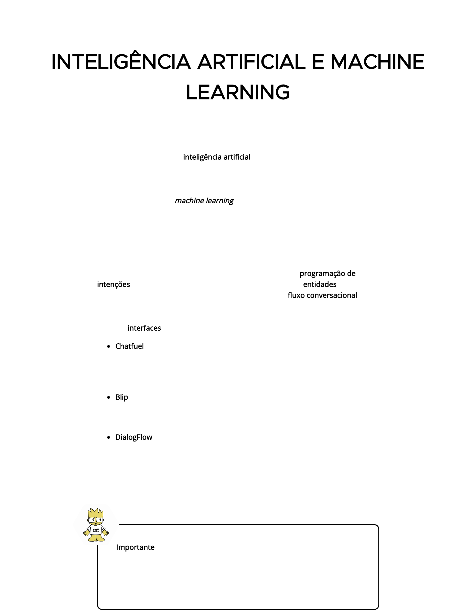 <p>28/06/2023, 23:12 Livro Digital - CHATBOTS</p><p>https://livrodigital.uniasselvi.com.br/livres/chatbots/conteudo.html?capitulo=5 1/2</p><p>INTELIGÊNCIA ARTIFICIAL E MACHINE</p><p>LEARNING</p><p>Chatfuel: plataforma de criação de chatbots considerada muito intuitiva e que</p><p>atua com inteligência arti�cial autônoma facilitando ao desenvolvedor a</p><p>criação de um chatbot. Está entre as mais utilizadas no mercado, integrando</p><p>sistemas em empresas de grande porte.</p><p>Blip: possui integração com todas as inteligências arti�ciais disponíveis e,</p><p>além disso, conta com uma comunidade de desenvolvedores muito ativa que</p><p>interage constantemente e aprimora práticas de utilização dessa ferramenta.</p><p>DialogFlow: é uma ferramenta completa de desenvolvimento, que foi</p><p>desenvolvida pelo Google e idealizada para criação e implementação de</p><p>interfaces conversacionais em websites, aplicativos e dispositivos</p><p>interagentes com a IOT (Internet das Coisas). Foi traduzida para 20 idiomas e</p><p>proporciona interações em linguagem natural entre usuários e corporações</p><p>por meio de canais de chatbot (KHURANA, 2017).</p><p>Segundo Russel (2013), a inteligência arti�cial é a capacidade de aprendizado</p><p>intuitivo de sistemas por meio da interação com humanos e outros sistemas</p><p>integrados. A partir de uma programação básica, a própria inteligência vai</p><p>preenchendo as lacunas do aprendizado por meio de tentativa e erro. Ligado à</p><p>inteligência arti�cial, o machine learning, ou aprendizado de máquina, proporciona</p><p>a entidades arti�ciais via IA (inteligência arti�cial) a expertise de aprendizado,</p><p>tomada de decisão e resolução de problemas (RUSSEL, 2013).</p><p>A integração com inteligência arti�cial e a vertente do machine learning são pontos</p><p>de grande atenção na criação de um chatbot. Essa sinergia promove melhores</p><p>experiências para o cliente e, consequentemente, oferece soluções de valor para</p><p>as corporações. Normalmente essa integração conta com a programação de</p><p>intenções, que são as ações que devem ser executadas; e as entidades, que são o</p><p>objeto dessas ações. Esses são os dois pilares de todo o �uxo conversacional de</p><p>um chatbot. Em certos casos, trabalham com inteligências arti�ciais autônomas;</p><p>em outros, trabalham integrados a bases externas de inteligência. Veja a seguir</p><p>algumas interfaces disponíveis para chatbots (BOZKURT, 2018).</p><p>Importante</p><p>A inteligência arti�cial e o machine learning em conjunto são muito</p><p>importantes para o desenvolvimento de um chatbot, pois promovem</p><p>melhores experiências para o usuário e soluções para a corporação.</p><p>Capítulo 5 </p><p>28/06/2023, 23:12 Livro Digital - CHATBOTS</p><p>https://livrodigital.uniasselvi.com.br/livres/chatbots/conteudo.html?capitulo=5 2/2</p><p>Capítulo 4 Capítulo 6</p><p>Conteúdo escrito por:Todos os direitos reservados ©</p><p>Capítulo 5 </p>