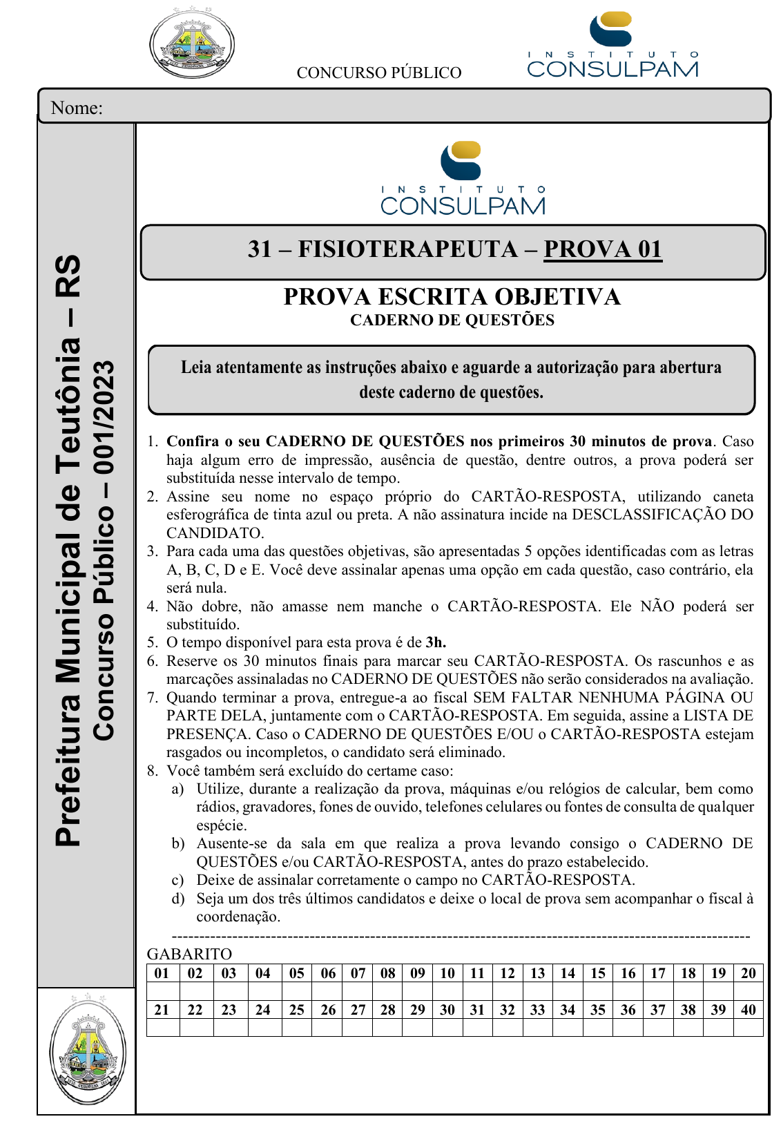 <p>pcimarkpci MDAwMDowMDAwOjAwMDA6MDAwMDowMDAwOmZmZmY6YWE5NjoyNjBm:V2VkLCAyMSBBdWcgMjAyNCAyMjo0NTowMyAtMDMwMA==</p><p>www.pciconcursos.com.br</p><p>1</p><p>CONCURSO PÚBLICO</p><p>PROVA ESCRITA OBJETIVA</p><p>CADERNO DE QUESTÕES</p><p>1. Confira o seu CADERNO DE QUESTÕES nos primeiros 30 minutos de prova. Caso</p><p>haja algum erro de impressão, ausência de questão, dentre outros, a prova poderá ser</p><p>substituída nesse intervalo de tempo.</p><p>2. Assine seu nome no espaço próprio do CARTÃO-RESPOSTA, utilizando caneta</p><p>esferográfica de tinta azul ou preta. A não assinatura incide na DESCLASSIFICAÇÃO DO</p><p>CANDIDATO.</p><p>3. Para cada uma das questões objetivas, são apresentadas 5 opções identificadas com as letras</p><p>A, B, C, D e E. Você deve assinalar apenas uma opção em cada questão, caso contrário, ela</p><p>será nula.</p><p>4. Não dobre, não amasse nem manche o CARTÃO-RESPOSTA. Ele NÃO poderá ser</p><p>substituído.</p><p>5. O tempo disponível para esta prova é de 3h.</p><p>6. Reserve os 30 minutos finais para marcar seu CARTÃO-RESPOSTA. Os rascunhos e as</p><p>marcações assinaladas no CADERNO DE QUESTÕES não serão considerados na avaliação.</p><p>7. Quando terminar a prova, entregue-a ao fiscal SEM FALTAR NENHUMA PÁGINA OU</p><p>PARTE DELA, juntamente com o CARTÃO-RESPOSTA. Em seguida, assine a LISTA DE</p><p>PRESENÇA. Caso o CADERNO DE QUESTÕES E/OU o CARTÃO-RESPOSTA estejam</p><p>rasgados ou incompletos, o candidato será eliminado.</p><p>8. Você também será excluído do certame caso:</p><p>a) Utilize, durante a realização da prova, máquinas e/ou relógios de calcular, bem como</p><p>rádios, gravadores, fones de ouvido, telefones celulares ou fontes de consulta de qualquer</p><p>espécie.</p><p>b) Ausente-se da sala em que realiza a prova levando consigo o CADERNO DE</p><p>QUESTÕES e/ou CARTÃO-RESPOSTA, antes do prazo estabelecido.</p><p>c) Deixe de assinalar corretamente o campo no CARTÃO-RESPOSTA.</p><p>d) Seja um dos três últimos candidatos e deixe o local de prova sem acompanhar o fiscal à</p><p>coordenação.</p><p>---------------------------------------------------------------------------------------------------------</p><p>GABARITO</p><p>01 02 03 04 05 06 07 08 09 10 11 12 13 14 15 16 17 18 19 20</p><p>21 22 23 24 25 26 27 28 29 30 31 32 33 34 35 36 37 38 39 40</p><p>Leia atentamente as instruções abaixo e aguarde a autorização para abertura</p><p>deste caderno de questões.</p><p>31 – FISIOTERAPEUTA – PROVA 01</p><p>P</p><p>re</p><p>fe</p><p>it</p><p>u</p><p>ra</p><p>M</p><p>u</p><p>n</p><p>ic</p><p>ip</p><p>a</p><p>l</p><p>d</p><p>e</p><p>T</p><p>e</p><p>u</p><p>tô</p><p>n</p><p>ia</p><p>–</p><p>R</p><p>S</p><p>C</p><p>o</p><p>n</p><p>c</p><p>u</p><p>rs</p><p>o</p><p>P</p><p>ú</p><p>b</p><p>li</p><p>c</p><p>o</p><p>–</p><p>0</p><p>0</p><p>1</p><p>/2</p><p>0</p><p>2</p><p>3</p><p>Nome:_________________________________________________________________</p><p>pcimarkpci MDAwMDowMDAwOjAwMDA6MDAwMDowMDAwOmZmZmY6YWE5NjoyNjBm:V2VkLCAyMSBBdWcgMjAyNCAyMjo0NTowMyAtMDMwMA==</p><p>www.pciconcursos.com.br</p><p>2</p><p>CONCURSO PÚBLICO</p><p>TEXTO</p><p>Para compreender a questão da grilagem, é</p><p>necessário conhecer as formas históricas de</p><p>distribuição e aquisição de terras no Brasil. No</p><p>período colonial, a divisão do território em sesmarias</p><p>(imensos lotes de terras virgens distribuídos em nome</p><p>do rei de Portugal para agricultura) criou problemas</p><p>que estão na origem da questão fundiária atual.</p><p>Um primeiro problema surge da dificuldade</p><p>em se mapear um território tão extenso. Além disso,</p><p>amplas áreas não eram utilizadas do ponto de vista</p><p>produtivo. Outro problema vem da escassez de</p><p>população, que limitava a ocupação do território e a</p><p>disponibilidade de força de trabalho no campo.</p><p>Estima-se que, até 1700, a população brasileira era de</p><p>apenas 300 mil habitantes, em boa medida</p><p>concentrados no litoral nordestino e nas regiões</p><p>mineradoras, segundo aponta Celso Furtado em seu</p><p>livro Formação Econômica Brasileira.</p><p>Por fim, somam-se a essas questões limitações</p><p>políticas de domínio territorial, já que muitas regiões,</p><p>principalmente no interior do país, não eram</p><p>administradas na prática pela coroa portuguesa ou</p><p>eram regiões em disputa com outros países. [...]</p><p>Com a independência do país em 1822 e a</p><p>revogação do regime das sesmarias, instaurou-se um</p><p>vazio jurídico que reforçou a ocupação espontânea. O</p><p>território em construção e seus confins alimentavam</p><p>os mais diversos anseios de apropriação e exploração,</p><p>tanto para os atores mais vulneráveis do campo</p><p>(camponeses, indígenas, caboclos, escravos libertos)</p><p>quanto para os mais providos. [...]</p><p>A Lei de Terras, de 1850, que dispõe sobre as</p><p>terras devolutas no Império, passa a ser um marco na</p><p>regulação fundiária nacional ao estipular que o acesso</p><p>à terra não mais se daria pela mera ocupação, e sim</p><p>por meio da sua compra. Ao instituir a propriedade</p><p>privada e o mercado de terras, a Lei de Terras</p><p>estabeleceu, ao mesmo tempo, a definição de terra</p><p>pública. Assim, todos os possuidores (sesmeiros e</p><p>posseiros) tinham um prazo estabelecido para</p><p>registrarem suas terras, sob pena de estas caírem em</p><p>comisso, isto é, de voltarem ao domínio público e</p><p>serem consideradas, portanto, terras devolutas. [...]</p><p>Ela é, ainda, interpretada como um texto</p><p>conservador, cuja preocupação foi garantir a</p><p>permanência de oferta de mão de obra barata ao setor</p><p>agropecuário e consolidar as elites agrárias num</p><p>momento em que o fim da escravatura estava se</p><p>desenhando. De fato, ela exclui do mercado fundiário</p><p>todos aqueles que não possu