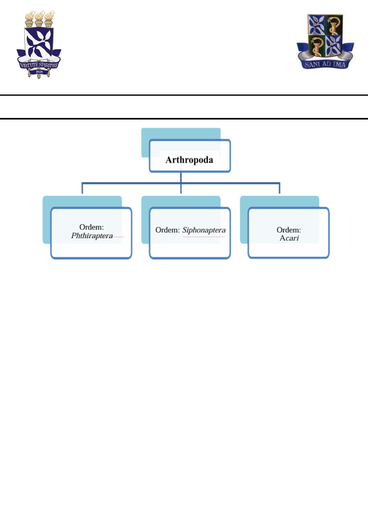 <p>UNIVERSIDADE FEDERAL DA BAHIA</p><p>INSTITUTO DE CIÊNCIAS DA SAÚDE</p><p>DEPARTAMENTO DE CIÊNCIAS DA BIOINTERAÇÃO</p><p>ICSB23 - PARASITOLOGIA HUMANA III</p><p>DISCENTE:___________________________ TURMA: ____________</p><p>ROTEIRO DE PRÁTICA - ARTRÓPODES</p><p>Características gerais do filo Arthropoda</p><p>O nome Arthropoda significa pés articulados (podos= pés; arthro= articulação). É o filo que apresenta</p><p>maior número de indivíduos do reino animal. Possuem simetria bilateral,com esqueleto externo</p><p>(exoesqueleto) formado pelo tegumento. Este, por sua vez, compreende a epiderme e a cutícula. O</p><p>tegumento, sendo a camada externa dos artrópodes, possui as funções de proteção, sustentação e impede a</p><p>perda de água. A cutícula é secretada pela epiderme que, quando recente, é flexível, mole; entretanto,</p><p>passando algum tempo após a secreção, torna-se esclerotisada, principalmente pelo enrijecimento da</p><p>quitina, que é a porção mais externa da cutícula. Os apêndices locomotores ou alimentares são articulados</p><p>e dispostos aos pares. O corpo é dividido em duas porções(cefalotórax e abdome,cabeça e tronco) ou</p><p>três(cabeça,tórax e abdome). A superfície do corpo dos artrópodes é formada pela união de várias placas</p><p>ou escleritos unidos por suturas ou sulcos. Apresentam numerosas cerdas, acúleos, tubérculos e esporões,</p><p>importantes na sistemática.</p><p>Classe Insecta</p><p>Também conhecida como Hexapoda. Pertencem todos os Arthropodas que apresentam o corpo</p><p>dividido em cabeça, tórax e abdome, e possuem três pares de patas. Podem ou não apresentar asas. A</p><p>cabeça que apresenta as estruturas: olhos, antenas e peças bucais; estando unida ao tórax. Este último é</p><p>formado por três metâmeros ou segmentos: protórax, mesotórax e metatórax, cada segmento possui um</p><p>par de pernas (formadas por: coxa, trocânter, fêmur, tíbia, tarsos e garras); asas são formadas por várias</p><p>nervuras de sustentação e células. Abdome é formado pela união de oito a dez anéis, sendo que o oitavo e</p><p>o nono são adaptados para a função reprodutora; o ânus abre-se no último segmento.</p><p>Subordem anoplura</p><p>A ordem Anoplura compreende grande número de espécies de pequenos artrópodes adaptados para viver</p><p>em permanência sobre determinados hospedeiros.</p><p>OVOS : são colocados aderidos aos pêlos ou às fibras e são</p><p>conhecidos por lêndeas. Medem aproximadamente</p><p>0,8mm/0,3mm Elas são operculadas, de coloração</p><p>branco-amarelada (fig.6).</p><p>ADULTOS : se caracterizam por ter o corpo achatado dorso ventralmente e os segmentos do tórax</p><p>fundidos, os olhos reduzidos ou ausentes, as antenas com 3 a 5 segmentos e as peças bucais muito</p><p>modificadas, de modo a constituírem em estilete pungitivo e retrátil. Tanto os machos quanto as fêmeas</p><p>são hematófagas.</p><p>→ As 3 espécies que parasitam o homem, com exclusividade, estão incluídas na família</p><p>Pediculidae e dos gêneros Pediculus e Pthirus:</p><p>Pediculus humanus (=P.humanuscorporis) vive nas partes cobertas do corpo e cola seus ovos às fibras</p><p>das vestes. Tem dimensões que oscilam entre 2 e 3,5mm de comprimento, sendo pouco maiores que o</p><p>P.capitis.Os machos são menores que as fêmeas.Cabeça pequena,ovóide e bem destacada do corpo;</p><p>contém as antenas com cinco segmentos, um par de olhos simples e o aparelho bucal picador sugador.</p><p>Tórax não apresenta segmentação nítida, com presença de um par de espiráculos e nele se implantam as</p><p>seis pernas.(Fig.7)</p><p>Pediculus capitis (= P. humanus capitis) habita a cabeça das</p><p>pessoas e seus ovos ficam cimentados na base dos fios de</p><p>cabelo.</p><p>Pthirus pubis ou piolho do púbis é menor que os outros,</p><p>localizando-se na região pubiana e perineal. É conhecido</p><p>como “chato”. Menor que os demais; o macho mede 1 mm de</p><p>comprimento e a fêmea 1,5mm, em média. Tórax e abdome e</p><p>encontram-se fundidos em uma só peça, mais larga ao nível</p><p>do tórax, não havendo também a independência dos</p><p>segmentos abdominais (Fig.8).</p><p>Siphonaptera</p><p>VOCÊ SABIA QUE…?.</p><p>● As pulgas são agentes espoliadores sanguíneos (machos e fêmeas), com várias espécies continuando a</p><p>exercer a hematofagia, mesmo após repletas.</p><p>● A maioria das espécies de pulgas vivem sobre a pelagem dos hospedeiros e neles alimentam-se</p><p>intermitentemente (Xenopsylla spp, e Ctenocephalides spp,) ou então, penetrando sob a pele dos</p><p>hospedeiros, aí se alimentando permanentemente (Tunga spp).</p><p>A ordem possui insetos sem asas e com aparelho bucal de tipo picador-sugador. A grande</p><p>maioria das pulgas são pequenos organismos que medem 1 a 3 mm de comprimento, sendo os machos um</p><p>pouco menores que as fêmeas. Cor castanho-escura; o corpo é achatado no sentido látero-lateral. As</p><p>pernas estão adaptadas para o salto. Na fase adulta são hematófagos.</p><p>A cabeça é uma cápsula quitinosa que além do achatamento lateral, está dividida por um sulco</p><p>oblíquo onde se alojam as antenas. O sulco antenal separa, na cabeça, as regiões frontal e genal da região</p><p>occipital. As antenas são curtas e têm apenas 3 segmentos (escapo, pedicelo e clava). Um par de olhos</p><p>simples pode estar presente adiante do sulco antenal. O conjunto das peças bucais compreende: um par de</p><p>mandíbulas, um par de maxilas, com os respectivos palpos maxilares e palpos labiais. Diversas cerdas</p><p>implantadas na cabeça servem, com outros detalhes para a sistemática desses insetos. São importantes,</p><p>nesse sentido alguns espinhos muito quitinizados e dispostos em fila como os dentes de um pente: são os</p><p>ctenídios frontal, genal e pronotal. No tórax, cada segmento conserva sua independência, podendo