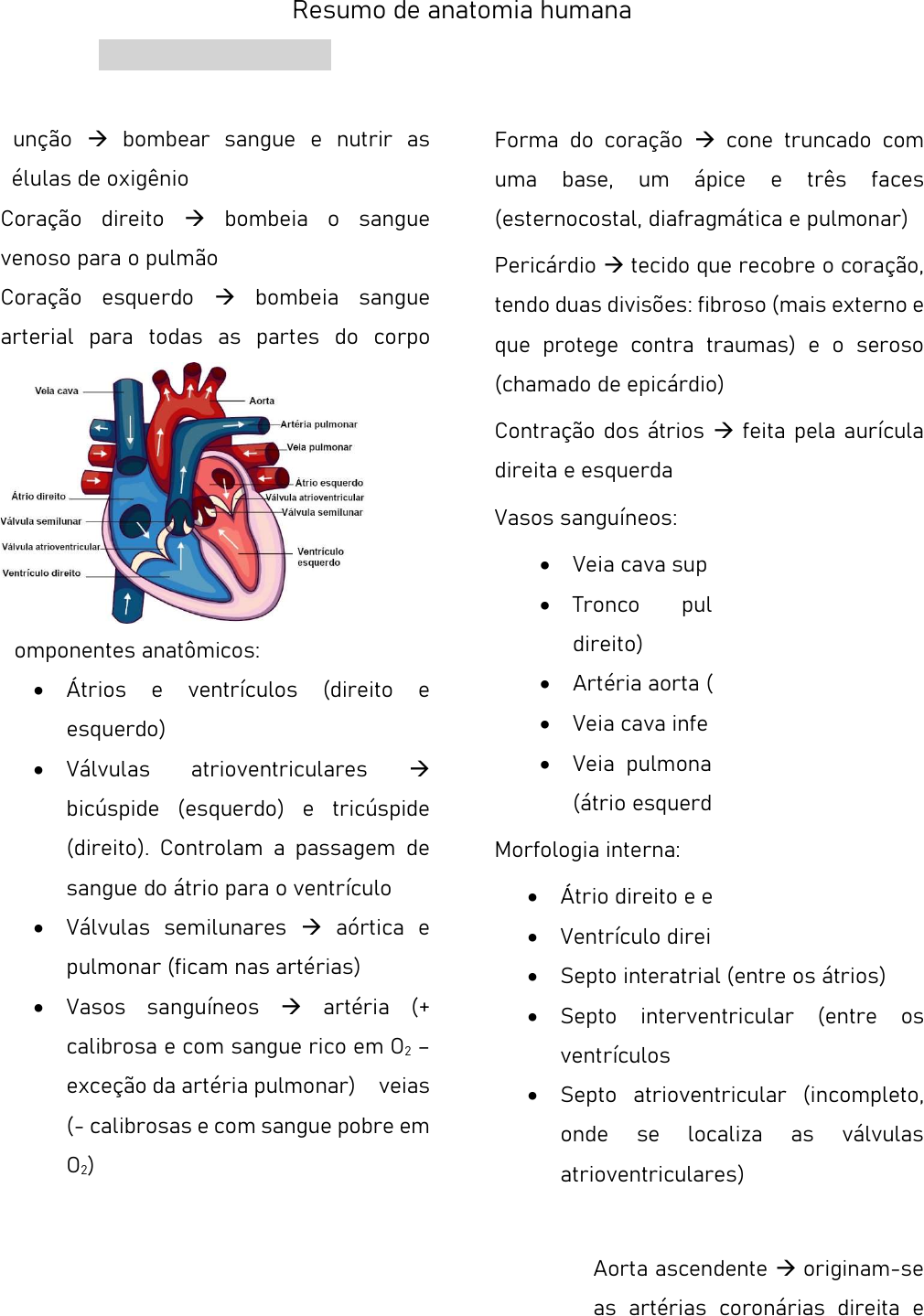 <p>Resumo de anatomia humana</p><p>Sistema circulatório</p><p>Órgãos do sistema coração</p><p>Função bombear sangue e nutrir as</p><p>células de oxigênio</p><p>Coração direito bombeia o sangue</p><p>venoso para o pulmão</p><p>Coração esquerdo bombeia sangue</p><p>arterial para todas as partes do corpo</p><p>Componentes anatômicos:</p><p> Átrios e ventrículos (direito e</p><p>esquerdo)</p><p> Válvulas atrioventriculares </p><p>bicúspide (esquerdo) e tricúspide</p><p>(direito). Controlam a passagem de</p><p>sangue do átrio para o ventrículo</p><p> Válvulas semilunares aórtica e</p><p>pulmonar (ficam nas artérias)</p><p> Vasos sanguíneos artéria (+</p><p>calibrosa e com sangue rico em O2 –</p><p>exceção da artéria pulmonar) e veias</p><p>(- calibrosas e com sangue pobre em</p><p>O2)</p><p>Anatomia do coração situado</p><p>posteriormente ao osso esterno, repousa</p><p>no músculo diafragma e está no espaço</p><p>entre dois sacos pleurais (mediastino)</p><p>Forma do coração cone truncado com</p><p>uma base, um ápice e três faces</p><p>(esternocostal, diafragmática e pulmonar)</p><p>Pericárdio tecido que recobre o coração,</p><p>tendo duas divisões: fibroso (mais externo e</p><p>que protege contra traumas) e o seroso</p><p>(chamado de epicárdio)</p><p>Contração dos átrios feita pela aurícula</p><p>direita e esquerda</p><p>Vasos sanguíneos:</p><p> Veia cava superior (átrio direito)</p><p> Tronco pulmonar (ventrículo</p><p>direito)</p><p> Artéria aorta (ventrículo esquerdo)</p><p> Veia cava inferior (átrio direito)</p><p> Veia pulmonar inferior e superior</p><p>(átrio esquerdo)</p><p>Morfologia interna:</p><p> Átrio direito e esquerdo</p><p> Ventrículo direito e esquerdo</p><p> Septo interatrial (entre os átrios)</p><p> Septo interventricular (entre os</p><p>ventrículos</p><p> Septo atrioventricular (incompleto,</p><p>onde se localiza as válvulas</p><p>atrioventriculares)</p><p>Vasos:</p><p> Aorta ascendente originam-se</p><p>as artérias coronárias direita e</p><p>Mobile User</p><p>Mobile User</p><p>Mobile User</p><p>Mobile User</p><p>Mobile User</p><p>Mobile User</p><p>Mobile User</p><p>Mobile User</p><p>Mobile User</p><p>Mobile User</p><p>esquerda (sistema de irrigação</p><p>cardíaco)</p><p> Arco aórtico tronco</p><p>braquioefálico (artéria carótida</p><p>comum esquerda – irriga pescoço</p><p>e cabeça; artéria subclávia</p><p>esquerda - irriga os membros</p><p>superiores)</p><p> Arco descendente ramos</p><p>parietais e viscerais (irriga a</p><p>cavidade abdominal e membros</p><p>inferiores)</p><p>Sistema elétrico do coração:</p><p> Nodo sinoatrial inicia os</p><p>batimentos cardíacos e</p><p>determina a frequência</p><p>cardíaca</p><p> Nodo atrioventricular </p><p>recebe os estímulos elétricos</p><p>dos átrios e retarda a</p><p>propagação para o feixe</p><p>atrioventricular</p><p> Feixe atrioventricular </p><p>transfere os estímulos para os</p><p>ramos direito e esquerdo</p><p> Ramos direito e esquerdo </p><p>recebe os estímulos e</p><p>transfere para as fibras de</p><p>purkinje</p><p> Fibras subendocárdicas </p><p>distribui para as células do</p><p>miocárdio ventricular</p><p>Sistema respiratório</p><p>Tipos de respiração sistêmica</p><p>e celular</p><p>Funções conduzir ar até os</p><p>alvéolos pulmonares, hematose</p><p>(troca gasosa), fonação, olfação e</p><p>regulação de temperatura,</p><p>equilíbrio ácido-base,</p><p>umidificação e depuração do ar</p><p>(muco + pelos)</p><p>Nariz externo raiz, dorso e</p><p>ápice</p><p>Mobile User</p><p>Mobile User</p><p>Mobile User</p><p>Cavidade nasal:</p><p> Vestíbulo</p><p> Concha nasal superior, media e</p><p>inferior</p><p> Meato nasal superior, inferior e</p><p>médio</p><p>Seio paranasais:</p><p> Seio maxilar</p><p> Vômer (osso do nariz)</p><p> Maxila</p><p> Osso esfenoide</p><p> Medianos: frontal e esfenoidal</p><p> Paramedianos: maxilares e</p><p>etmoidais</p><p>Faringe: condução do ar e do alimento, a</p><p>separação é controlada por estímulos</p><p>nervosos. Dividida em parte nasal, oral e</p><p>laríngea</p><p>Divisão da faringe:</p><p> Parte nasal da faringe (nasofaringe):</p><p>* Óstio faríngeo da tuba auditiva</p><p>* Tonsila faríngea</p><p> Parte oral da faringe (orofaringe):</p><p>* Tonsilas palatinas (amigdalas)</p><p>* Istmo orofaríngeo</p><p> Parte laríngea da faringe</p><p>(laringofaringe)</p><p>* Cartilagem epiglote</p><p>* Adito da laringe</p><p>* Abertura esofágica</p><p>Cartilagens da laringe impares (tireoide,</p><p>cricoide, epiglote), pares (aritenoides e</p><p>corniculadas)</p><p>Mobile User</p><p>Mobile User</p><p>Mobile User</p><p>Glote prega vestibular, ventrículo, prega</p><p>vocal</p><p>Traqueia: conduz o ar até os pulmões, parte</p><p>cartilaginosa e parte membranácea</p><p>Brônquios responsáveis pela hematose</p><p>Brônquio principal direito (mais curto e</p><p>mais calibroso que o esquerdo) brônquio</p><p>lobar superior direito, brônquio lobar médio</p><p>direito e brônquio lobar inferior direito</p><p>Brônquio principal esquerdo brônquio</p><p>lobar superior esquerdo e brônquio lobar</p><p>inferior esquerdo</p><p>Pulmão faces: costal, mediastinal e</p><p>diafragmática.</p><p>Pulmão direito 3 lobos (inferior, médio e</p><p>superior). Fissuras: oblíqua (lobo médio</p><p>com lobo inferior), horizontal (lobo superior</p><p>com o lobo médio).</p><p>Pulmão esquerdo 2 lobos (inferior e</p><p>superior), fissura obliqua</p><p>Hilo pulmonar brônquio lobar superior</p><p>direito, artéria pulmonar direita, artéria</p><p>bronquial direita, brônquio intermediário,</p><p>veia pulmonar direita superior, linfonodos</p><p>broncopulmonares, veia pulmonar direita</p><p>inferior.</p><p>Pleura protege de traumas e choques,</p><p>parietal (só identificada no tórax) e visceral</p><p>(protegendo o tecido pulmonar)</p><p>Sistema digestório</p><p>Peritônio membrana que recobre a</p><p>c
