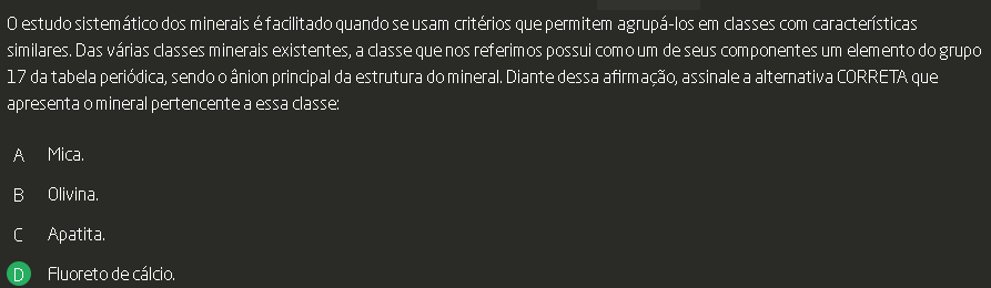 <p>estudo sistemático dos minerais é facilitado quando se usam critérios que permitem agrupá-los em classes com características similares. Das várias classes minerais existentes, a classe que nos referimos possui comoum de seus componentes um elemento do grupo 17 da tabela periódica, sendo ânion principal da estrutura do mineral. Diante dessa afirmação, assinale a alternativa CORRETA que apresenta mineral pertencente a essa classe: A Mica. B Olivina. C Apatita. D Fluoreto de cálcio.</p>