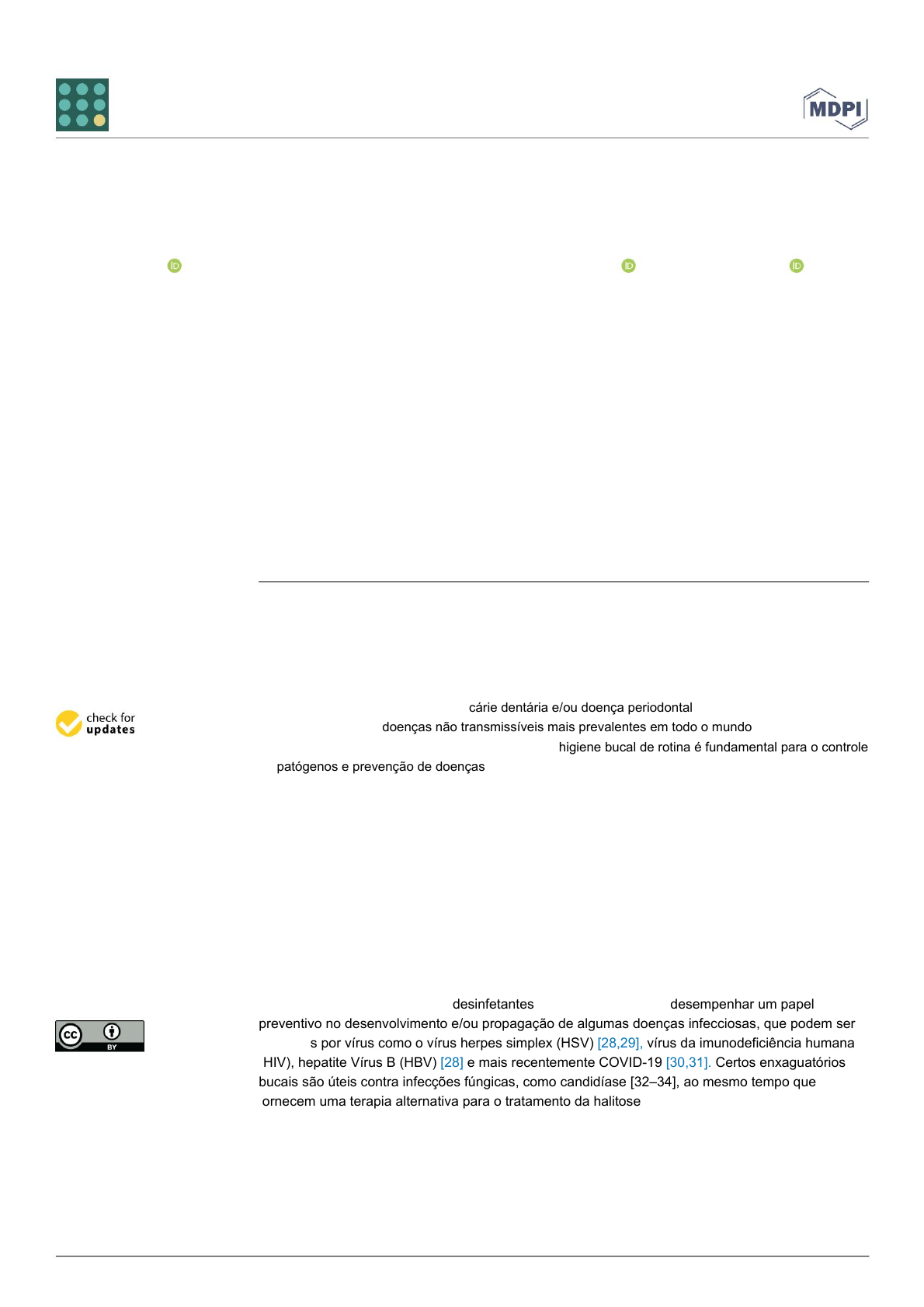 <p>Resumo: Um bom estado de saúde oral depende maioritariamente de bons hábitos de higiene oral, que</p><p>sabidamente têm impacto na saúde sistémica. Embora controversos, os antissépticos orais químicos podem</p><p>ser úteis como complemento às técnicas mecânicas de controle da placa dentária na prevenção e tratamento</p><p>da saúde e bem-estar local e geral. Esta revisão tem como objetivo revisitar, reunir e atualizar indicações</p><p>clínicas baseadas em evidências para o uso dos antissépticos orais mais populares, considerando diferentes</p><p>tipos, alvos de microrganismos e eficácia, a fim de estabelecer recomendações clínicas atualizadas.</p><p>Palavras-chave: antissépticos; microbiota oral; biofilmes orais; prática Dental</p><p>* Correspondência: mhbarroso@egasmoniz.edu.pt</p><p>J. Pers. Med. 2023, 13, 1332. https://doi.org/10.3390/jpm13091332</p><p>Centro Egas Moniz de Investigação Interdisciplinar (CiiEM), Escola Superior de Saúde e Ciências Egas Moniz,</p><p>Caparica, 2829-511 Almada, Portugal; plyra@egasmoniz.edu.pt (PL); jpm.viana.1@gmail.com</p><p>(JV); jmendes@egasmoniz.edu.pt (JJM)</p><p>https://www.mdpi.com/journal/jpm</p><p>A cavidade oral é um sistema complexo com uma vasta e complexa biodiversidade, contendo até</p><p>800 espécies microbianas [1]. Esta microbiota oral comensal está presente ao longo da vida e pode ser</p><p>perturbada de forma disbiótica, com certas espécies crescendo excessivamente e aumentando o risco</p><p>de doenças bucais, particularmente cárie dentária e/ou doença periodontal [2–4]. Ambas as condições</p><p>são consideradas as doenças não transmissíveis mais prevalentes em todo o mundo [5]. Portanto, o</p><p>controle mecânico do biofilme dentário por meio da higiene bucal de rotina é fundamental para o controle</p><p>de patógenos e prevenção de doenças [6–9]. O controle químico da placa bacteriana com enxaguatórios</p><p>bucais antibacterianos pode ser uma alternativa aos métodos mecânicos quando estes são ineficazes</p><p>[7,10–14]. Assim, recomenda-se o uso de controle químico e mecânico de forma sincronizada para</p><p>garantir uma boa higiene bucal e potencializar um bom estado de saúde bucal [7,15–22].</p><p>Publicado: 29 de agosto de 2023</p><p>Recebido: 31 de julho de 2023</p><p>Aceito: 27 de agosto de 2023</p><p>Licenciado MDPI, Basileia, Suíça.</p><p>Michele Inchingolo</p><p>Revisado: 24 de agosto de 2023</p><p>Editor Acadêmico: Angelo</p><p>Citação: Garrido, L.; Lira, P.;</p><p>Rodrigues, J.; Viana, J.; Mendes, JJ;</p><p>Barroso, H. Revisitando anti-</p><p>sépticos orais, alvos de microrganismos e</p><p>eficácia. J. Pers. Med. 2023, 13, 1332. https://</p><p>doi.org/10.3390/ jpm13091332</p><p>Este artigo é um artigo de acesso aberto</p><p>condições do Creative Commons</p><p>distribuído nos termos e</p><p>4,0/).</p><p>Direitos autorais: © 2023 dos autores.</p><p>1. Introdução</p><p>Além disso, a condição da cavidade oral está intimamente ligada à saúde geral e ao bem-estar</p><p>[26,27]. Consequentemente, os desinfetantes orais também podem desempenhar um papel</p><p>preventivo no desenvolvimento e/ou propagação de algumas doenças infecciosas, que podem ser</p><p>causadas por vírus como o vírus herpes simplex (HSV) [28,29], vírus da imunodeficiência humana</p><p>(HIV), hepatite Vírus B (HBV) [28] e mais recentemente COVID-19 [30,31]. Certos enxaguatórios</p><p>bucais são úteis contra infecções fúngicas, como candidíase [32–34], ao mesmo tempo que</p><p>fornecem uma terapia alternativa para o tratamento da halitose [35,36].</p><p>,</p><p>Licença de atribuição (CC BY) ( https://</p><p>creativecommons.org/licenses/by/</p><p>Patrícia Lyra, Joana Rodrigues, João Viana, José João Mendes e Helena Barroso *</p><p>Existe uma ampla gama de enxaguatórios bucais disponíveis comercialmente com propriedades</p><p>antimicrobianas eficazes para o tratamento de doenças bucais [17,22,23]. Esses produtos químicos</p><p>inibem a proliferação bacteriana ou previnem a adesão bacteriana às superfícies dos dentes [24] e</p><p>removem parte da placa durante o enxágue, evitando a formação de biofilme [17,25]. Clorexidina</p><p>(CHX), triclosan (TRC), cloreto de cetilpiridínio (CPC) e alguns óleos essenciais (EOs) (eucaliptol,</p><p>timol, mentol, etc.) estão entre os ingredientes ativos comumente encontrados em formulações de</p><p>enxaguatórios bucais [12].</p><p>Lisetty Garrido</p><p>Análise</p><p>Revisitando antissépticos orais, alvos e eficácia de</p><p>microrganismos</p><p>Medicamento</p><p>Personalizado</p><p>Diário de</p><p>Além disso, os antissépticos orais também parecem ser uma opção viável quando utilizados como</p><p>complemento aos antibióticos, tanto para a prevenção como para o tratamento de infecções bacterianas,</p><p>como a pneumonia associada à ventilação mecânica (PAV) [37,38], uma vez que a microflora orofaríngea</p><p>desempenha um papel na o desenvolvimento de infecções nosocomiais, como PAV [39–41]. Esta forma de</p><p>pneumonia é a infecção nosocomial mais comum em terapia intensiva, afetando 10 a 30% dos pacientes mecanicamente.</p><p>Machine Translated by Google</p><p>https://doi.org/10.3390/jpm13091332</p><p>https://www.mdpi.com/journal/jpm</p><p>https://doi.org/10.3390/jpm13091332</p><p>https://doi.org/10.3390/jpm13091332</p><p>https://creativecommons.org/licenses/by/4.0/</p><p>https://creativecommons.org/licenses/by/4.0/</p><p>https://www.mdpi.com/journal/jpm</p><p>Highlight</p><p>Highlight</p><p>Este estudo revisita as indicações clínicas baseadas em evidências do uso de antissépticos orais,</p><p>considerando diferentes tipos, alvos de microrganismos e eficácia.</p><p>pacientes ventilados [42,43]. Além disso, tanto os profissionais de odontologia quanto os pacientes correm maior</p><p>risco de infecção cruzada na prática clínica [12,17,20,22,44]. As principais vi