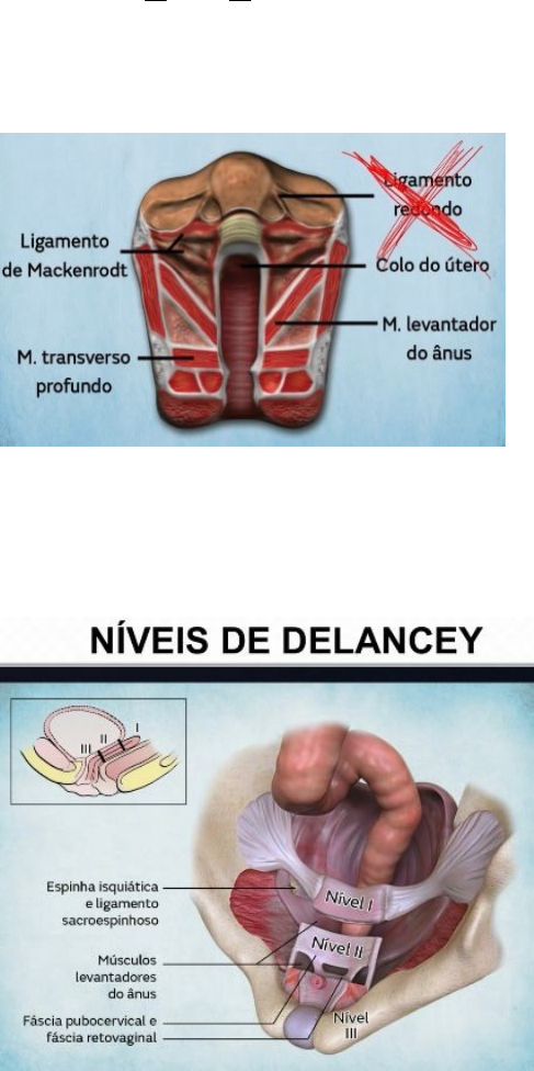 <p>DISTOPIA GENITAL</p><p>APARELHO DE SUSPENSÃO (SÓ LIGAMENTOS, NÃO TEM MÚSCULO)</p><p>· ANTERIORES: PUBOVESICUTERINOS</p><p>· LATERAIS: CARDINAIS OU PARAMÉTRIOS OU MACKENRODT (IMPORTANTE EM FIXAÇÃO DE CUPULA PÓS HISTERECTOMIA)</p><p>· POSTERIORES: UTEROSSACROS (TAMBÉM PODE SER USADO PARA FIXAÇÃO DE CÚPULA VAGINAL)</p><p>APARELHO DE SUSTENTAÇÃO (MÚSCULOS)</p><p>· DIAFRAGMA PÉLVICO: ELEVADOR DO ÂNUS 90% (PUBORRETAL, ILEOCOCCIGEA E PUBOCOCCIGEA) E COCCÍGEO 10%</p><p>· DIAFRAGMA UROGENITAL: OUTROS MÚSCULOS COMO TRANSVERSO DO PERÍNEO, ESFINCTER URETRAL</p><p>· FÁSCIA ENDOPÉLVICA</p><p>·</p><p>· ** LIGAMENTO REDONDO NÃO É APARELHO DE SUSTENTAÇÃO</p><p>NÍVEIS DE DELANCEY</p><p>· DEPENDENDO DO NÍVEL DO PROBLEMA NOS TEMOS UM NIVEL DE DISTOPIA/PROLAPSO ESPECÍFICO</p><p>·</p><p>· NÍVEL 1 / APICAL: LIGAMENTOS UTEROSSACROS E CARDINAIS - RELAÇÃO COM PROLAPSO UTERINO, DE CÚPULA E ENTEROCELE</p><p>· NÍVEL 2 / LATERAL: FASCIAS PUBOCERVICAL E RETOVAGINAL - RELAÇÃO COM CISTOCELE E RETOCELE (PAREDE ANTERIOR E POSTERIOR)</p><p>· NÍVEL 3 / FUSÃO / DISTAL: RELAÇÃO COM HIPERMOBILIDADE URETRAL, INCONTINENCIA URINARIA, HIPERMOBILIDADE E ROTURA PERINEAL</p><p>DISTOPIAS GENITAIS</p><p>PROLAPSO UTERINO</p><p>· ALONGAMENTO HIPERTROFICO COLO X PROLAPSO</p><p>·</p><p>· TRATAMENTO – PACIENTE SINTOMATICA COM CONDIÇÕES CIRURGICAS:</p><p>· HISTERECTOMIA VAGINAL COM RECONSTRUÇÃO DE ASSOALHO PÉLVICO (PAREDE VAGINAL ANTERIOR E POSTERIOR)</p><p>· MANCHESTER (AMPUTAÇÃO PARCIAL DE COLO + CERVICOFIXAÇÃO NO PARAMÉTRIO): SE ALONGAMENTO HIPERTROFICO OU CASOS LEVES DE PROLAPSO UTERINO COM DESEJO REPRODUTIVO</p><p>· TRATAMENTO – PACIENTE COM ALTO RISCO CIRURGICO:</p><p>· COLPOCLEISE (LEFORT): FECHAMENTO DO CANAL VAGINAL, CI SE PACIENTE TIVER VIDA SEXUAL ATIVA, DEVE TER CO RECENTE SEM ALTERAÇÕES, TERMO DE CONSENTIMENTO ASSINADO</p><p>· PESSÁRIOS + FISIOTERAPIA</p><p>PROLAPSO DE CÚPULA</p><p>· MESMO FAZENDO A TECNICA CORRETA, PODEMOS TER PROLAPSO DE CUPULA, POIS TODO TECIDO DO ASSOALHO PÉLVICO PODE ESTAR ENFRAQUECIDO</p><p>· REFAZER ANGULO DA VAGINAL</p><p>· TRATAMENTO:</p><p>· FIXAR CÚPULA VAGINAL AO PROMONTÓRIO OU SACROESPINHOSO OU FAZER COLPOCLEISE (LE FORT)</p><p>PROLAPSO VAGINAL ANTERIOR</p><p>CISTOCELE</p><p>·</p><p>· COMO DIFERENCIAR CISTOCELE DE RETOCELE: COMPRESSÃO COM PÁ UNICA DO ESPECULO EM PAREDE ANTERIOR E POSTERIOR</p><p>· 80% É DEFEITO PARAVAGINAL, ASSOCIAÇÃO COM IUE</p><p>· TRATAMENTO:</p><p>· COLPORRAFIA (COLPOPERINEOPLASTIA) COM REINSERÇÃO DA FÁSCIA PUBOVESICOCERVICAL AO ARCO TENDÍNEO DA FÁSCIA ENDOPÉLVICA</p><p>PROLAPSO VAGINAL POSTERIOR</p><p>RETOCELE</p><p>· TOQUE RETAL: SE DUVIDA QUANTO AO PROLAPSO SER RETOCELE OU ENTEROCELE</p><p>· SE ENTEROCELE AO TOQUE DA PARA PERCEBER PERISTALSE</p><p>· TRATAMENTO:</p><p>· COLPORRAFIA POSTERIOR CORRIGINDO FÁSCIA RETOVAGINAL</p><p>ENTEROCELE</p><p>· HERNIAÇÃO DO INTESTINO DELGADO, ASSOCIAÇÃO FREQUENTE COM RETOCELE</p><p>·</p><p>· TRATAMENTO:</p><p>· EXÉRESE DO SACO HERNIÁRIO E OBLITERAÇÃO DO FUNDO DE SACO</p><p>CLASSIFICAÇÃO POP-Q</p><p>·</p><p>· Aa/Ba: PAREDE ANTERIOR</p><p>· Ap/Bp: PAREDE POSTERIOR</p><p>· C: COLO OU CÚPULA</p><p>· D: FUNDO DE SACO DE DOUGLAS</p><p>· CVT: COMPRIMENTO VAGINAL TOTAL</p><p>· AUSENCIA DE PONTO D: PACIENTE COM HISTERECTOMIA, SEM COLO E A LETRA C SE REFERE A CÚPULA</p><p>· NEGATIVO: DENTRO DO CANAL VAGINAL</p><p>· POSITIVO: ALÉM DO HÍMEN</p><p>· EM PACIENTE SEM PROLAPSO É COMUM QUE O PONTO D SEJA MAIS NEGATIVO QUE O PONTO C (FUNDO DE SACO DE DOUGLAS MAIS NEGATIVO QUE O COLO DO UTERO)</p><p>· SE VALOR POSITIVO EU TENHO PROLAPSO, O NEGATIVO EU POSSO TER PROLAPSO, GERALMENTE NÃO GRAVE</p><p>· ESTADIAMENTO:</p><p>·</p><p>· I: <-1</p><p>· II: ENTRE –1 E +1</p><p>· III: > +1 MAS NÃO TOTAL</p><p>· IV: MAIOR/IGUAL CVT –2</p><p>· ALONGAMENTO HIPERTROFICO DO COLO: C-D>4</p><p>EXEMPLOS:</p><p>·</p><p>·</p><p>image6.png</p><p>image7.jpeg</p><p>image8.png</p><p>image9.png</p><p>image1.png</p><p>image2.png</p><p>image3.png</p><p>image4.png</p><p>image5.png</p>