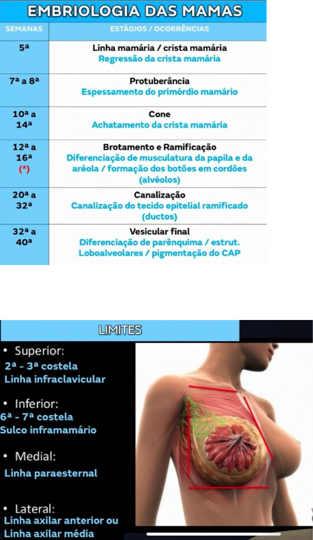 <p>MASTOLOGIA – SEMIOLOGIA DAS MAMAS</p><p>EMBRIOLOGIA DAS MAMAS</p><p>·</p><p>ANATOMIA DAS MAMAS</p><p>LIMITES</p><p>·</p><p>·</p><p>· LIMITES: DEVO PALPAR TODOS OS LIMITES</p><p>· QSL (EXTERNO): PREDOMINANCIA DE PARENQUIMA MAMÁRIO, ONDE SE DEVE INICIAR A PALPAÇÃO NO EF</p><p>SUPRIMENTO ARTERIAL</p><p>·</p><p>· A. TORACICA/MAMARIA INTERNA (RAMO DA A. SUBCLÁVIA): 60%</p><p>· A. TORACICA LATERAL (RAMO DA A. AXILAR OU A. TORACOACROMIAL OU A. SUBESCAPULAR): 30%</p><p>· AA. INTERCOSTAIS (RAMOS ANTERIORES E LATERAIS): 10%</p><p>SUPRIMENTO VENOSO</p><p>·</p><p>DRENAGEM LINFÁTICA</p><p>·</p><p>SEMIOLOGIA DAS MAMAS</p><p>EXAME FÍSICO</p><p>· INSPEÇÃO ESTATICA: SENTADA, COLO DESNUDO, BRAÇOS AO LONGO DO CORPO. DETECTAR ABAULAMENTOS OU RETRAÇÕES</p><p>· INSPEÇÃO DINAMICA: PRESSIONA CINTURA (CONTRAI MUSCULO PEITORAL) E ELEVA BRAÇOS ACIMA DA CABEÇA (TRABALHA O LIGAMENTO DE COOPER – LIGAMENTO SUSPENSOR DA MAMA). DETECTAR ABAULAMENTOS OU RETRAÇÕES, REALÇANDO POSSIVEIS ALTERAÇÕES</p><p>· PALPAÇÃO DE LINFONODOS SUPRA/INFRA CLAVICULARES E AXILARES</p><p>· PALPAÇÃO DO PARENQUIMA MAMARIO: PACIENTE DEITADA, BRAÇOS ELEVADOS SOB A CABEÇA, PALPAÇÃO DO PARENQUIMA MAMÁRIO NO SENTIDO HORARIO, INÍCIO PELO QSL OU QSE. SE NODULO PALPÁVEL DESCREVER: LOCALIZAÇÃO, LIMITES, CONSISTENCIA, MOBILIDADE, DIÂMETRO, SENSIBILIDADE</p><p>· TECNICA DE VELPEAUX: USA 2 A 3 DEDOS, FAZ MOVIMENTOS CIRCULARES</p><p>· TECNICA DE BLOODGOOD: TECNICA DEDILHANDO. DA INFORMAÇÕES COMO: TAMANHO DE NODULO, CONSISTENCIA, ADERENCIA A PLANO PROFUNDO, SENSIBILIDADE DOLOROSA. TECNICA MAIS DETALHISTA (TECNICA DO PIANO)</p><p>· VIDA PRÁTICA: TECNICAS COMPLEMENTARES, REALIZAR AS DUAS</p><p>· ORDENHA E EXPRESSÃO PAPILA</p><p>· MANOBRA DE GATILHO SE SAIDA DE SECREÇÃO A EXPRESSÃO PAPILAR: COM INDICADOR COMPRIMIR TODA CIRCUNFERENCIA AREOLAR PARA IDENTTIFICAR SE A DESCARGA É UNI OU MULTIDUCTAL</p><p>·</p><p>·</p><p>·</p><p>·</p><p>· ERRO DO EF DAS FOTOS: PACIENTE DESNUDA, NÃO HÁ NECESSIDADE</p><p>ACHADOS PATOLÓGICOS A INSPEÇÃO</p><p>·</p><p>image8.png</p><p>image9.png</p><p>image7.png</p><p>imageb.png</p><p>imagea.png</p><p>image4.png</p><p>image5.png</p><p>image.png</p><p>image3.png</p><p>image6.png</p><p>imagec.png</p><p>image2.png</p>