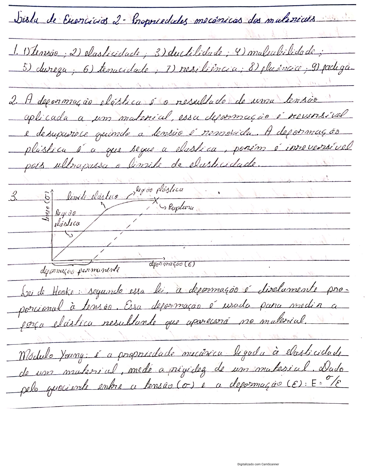 <p>de - dos materials 1. 3) 4) 5) 6) 7) 8) g) 2. A elastica I de uma aplicada a um essa reversival l a lensio A I a a inreversivel pois ultrapassa da 3. limits plastica elistica permanente de Hooks essa a pro- a Essa deformação usada medin a forca elastica que material. Modulo I a propriedade a elasticidade de um mede a de um material Dado pelo entre a (o) a Digitalizado com CamScanner</p><p>4. cm F = 6500 Ky f 21000.10 kyf A= 2 6500 = N/m2 A E = = 53.27.10 N/m2 E 21000.10 5. 01 A 122.66 A 122,66 = 2700 = 22, 01/N/mm2 3600 = N/mm2 122,66 50,05-50 = - 50 A 50 50 = 50 50 7,33 = 14,67 . 2 20,35 F Digitalizado com CamScanner</p><p>6. a i como a cia que a do material apresenta a do material material Antes a de um material riscar de 7. i a que material de em was sem sends a de i a dade do material de se a de Essas tim granche importancia ma a Ma de a em laminados de 8. a medida da energia para e de um material Sendo da ou 9. A i a capacidade do material absorver yia devolver essa energia a I ambito da essa propriedade I aplicada em para de Digitalizado com CamScanner</p><p>10. 1000N mm N/m2 2 N/m2 A 50,26.10 = =) ER = 35.10 -6 l 8 Ea=ER Ea= 0,3 E= Ea Digitalizado com CamScanner</p>