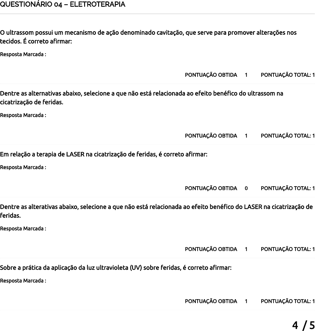 <p>4 / 5</p><p>QUESTIONÁRIO 04 – ELETROTERAPIA</p><p>PONTUAÇÃO TOTAL: 1PONTUAÇÃO OBTIDA 1</p><p>O ultrassom possui um mecanismo de ação denominado cavitação, que serve para promover alterações nos</p><p>tecidos. É correto a�rmar:</p><p>Resposta Marcada :</p><p>Cavitação transitória é a formação de microbolhas de ar e gases que implodem.</p><p>PONTUAÇÃO TOTAL: 1PONTUAÇÃO OBTIDA 1</p><p>Dentre as alternativas abaixo, selecione a que não está relacionada ao efeito bené�co do ultrassom na</p><p>cicatrização de feridas.</p><p>Resposta Marcada :</p><p>Redução da angiogênese.</p><p>PONTUAÇÃO TOTAL: 1PONTUAÇÃO OBTIDA 0</p><p>Em relação a terapia de LASER na cicatrização de feridas, é correto a�rmar:</p><p>Resposta Marcada :</p><p>A aplicação de doses inferiores a 1 J/cm2 é considerada efetiva.</p><p>PONTUAÇÃO TOTAL: 1PONTUAÇÃO OBTIDA 1</p><p>Dentre as alterativas abaixo, selecione a que não está relacionada ao efeito bené�co do LASER na cicatrização de</p><p>feridas.</p><p>Resposta Marcada :</p><p>Redução da fagocitose pelos leucócitos.</p><p>PONTUAÇÃO TOTAL: 1PONTUAÇÃO OBTIDA 1</p><p>Sobre a prática da aplicação da luz ultravioleta (UV) sobre feridas, é correto a�rmar:</p><p>Resposta Marcada :</p><p>A pele periúlcera deve ser protegida durante essa técnica, utilizando, por exemplo, um pano ao redor da ferida.</p><p>Total de Pontos</p><p>28/08/2024, 22:02 Course Status – AVA Saúde Unifaveni</p><p>https://ava.saude.unifaveni.com.br/course-status/ 1/1</p>