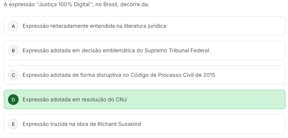 <p>A expressão "Justiça 100% no Brasil, decorre da: A Expressão reiteradamente entendida na literatura jurídica B Expressão adotada em decisão emblemática do Supremo Tribunal Federal C Expressão adotada de forma disruptiva no Código de Processo Civil de 2015 D Expressão adotada em resolução do CNJ E Expressão trazida na obra de Richard Susskind</p>