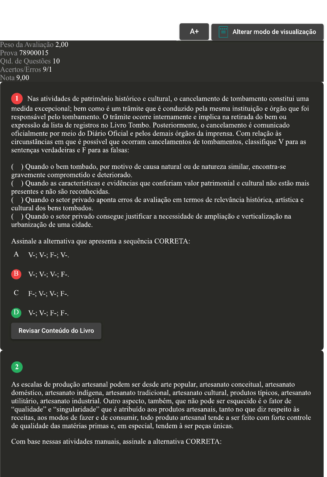 <p>A+ Alterar modo de visualização Peso da Avaliação 2,00 Prova 78900015 Otd. de Questões 10 Acertos/Erros 9/1 Nota 9,00 1 Nas atividades de patrimônio histórico e cultural, cancelamento de tombamento constitui uma medida excepcional; bem como é um trâmite que é conduzido pela mesma instituição e órgão que foi responsável pelo tombamento. O trâmite ocorre internamente e implica na retirada do bem ou expressão da lista de registros no Livro Posteriormente. cancelamento é comunicado oficialmente por meio do Diário Oficial e pelos demais órgãos da imprensa. Com relação às circunstâncias em que é possível que ocorram cancelamentos de tombamentos, classifique V para as sentenças verdadeiras e F para as falsas: ( ) Quando bem tombado, por motivo de causa natural ou de natureza similar, encontra-se gravemente comprometido e deteriorado. ( ) Quando as características e evidências que conferiam valor patrimonial e cultural não estão mais presentes e não são reconhecidas. ( ) Quando setor privado aponta erros de avaliação em termos de relevância histórica, artística e cultural dos bens tombados. ( ) Quando setor privado consegue justificar a necessidade de ampliação e verticalização na urbanização de uma cidade. Assinale a alternativa que apresenta a sequência CORRETA: A V-: V- B V-; V-: C D Revisar Conteúdo do Livro 2 As escalas de produção artesanal podem ser desde arte popular, artesanato conceitual, artesanato doméstico, artesanato indígena, artesanato tradicional, artesanato cultural, produtos típicos, artesanato utilitário, artesanato industrial. Outro aspecto, também, que não pode ser esquecido é fator de "qualidade" e "singularidade" que é atribuído aos produtos artesanais, tanto no que diz respeito às receitas, aos modos de fazer e de consumir, todo produto artesanal tende a ser feito com forte controle de qualidade das matérias primas e, em especial, tendem à ser peças únicas. Com base nessas atividades manuais, assinale a alternativa CORRETA:</p><p>A Prática Esportiva. B Prática Artesanal. C Prática egoísta. D Prática Literal. 3 Patrimônio constitui um conjunto determinado de bens tangíveis, intangíveis e naturais, envolvendo saberes e práticas sociais, a que se atribui determinados valores e desejos de partilha (perspectiva sincrônica) entre contemporâneos e de transmissão (perspectiva diacrônica) de uma geração para outra. A definição para referências culturais descritas pelo Iphan (2000) contribui no sentido de ampliar as denominações. Com base no exposto, assinale a alternativa INCORRETA: A São as festas e os lugares a que a memória e a vida social atribuem sentido diferenciado: são as consideradas mais são as mais lembradas, as mais querida. B São as artes, os ofícios, as formas de expressão e os modos de fazer. C Referências são edificações e são paisagens naturais. São expressões de exaltação de sua cultura como representatividade de sua superioridade ou inferioridade perante a sociedade que são identificada na arte, na dança e modo de vida. 4 O Congresso Nacional cogita uma definição conceitual para os povos/populações tradicionais que é a de: grupos humanos culturalmente diferenciados, que estão vivendo há, no mínimo, três gerações em um determinado ecossistema, historicamente reproduzindo seu modo de em estreita dependência para com meio natural, do qual obtém a própria subsistência e que fazem uso dos recursos naturais de modo sustentável. Sobre Populações Tradicionais, analise as sentenças a seguir: Referem-se aos saberes que são manejados, manipulados e que estão sob domínio das populações, comunidades, famílias e indivíduos pertencentes aos povos indígenas, remanescentes de quilombos, pescadores artesanais, ribeirinhos, seringueiros, quebradeiras de coco, caiçaras e inúmeros</p><p>outros, cujos conhecimentos, hábitos, costumes, modos de viver, fazer, tradições, festas, rituais estão profundamente relacionados com a terra, com mar, as plantas, os animais, em fim com ambiente, a natureza que os circunda. As comunidades tradicionais são consideradas sociedades que vivem em culturas particulares e são denominadas de "povos dos pois vivem no seu ambiente imediato, utilizam-se de recursos retirados apenas do ambiente no qual se encontram inseridos, que em sua maioria não é provido de confortos e tecnologias que estão disponíveis nos centros urbanos. III- Trata-se de populações que detém saberes que os identificam, os diferenciam, representando um nicho cultural no qual encontram as condições de perpetuar suas crenças, valores e formas de vida. Assinale a alternativa CORRETA: A Somente a sentença III está correta. B As sentenças I, II e III estão corretas. C Somente a sentença II está correta. D Somente a sentença I está correta. 5 O patrimônio é responsável por possibilitar a solidariedade entre os que se identificam em determinados bens e práticas e que, por outro lado, costuma ser local em que se forjam e amparam as cumplicidades sociais que se encontram fortemente estratificadas mediante a existência de classes e grupos. Com base no patrimônio cultural, assinale a alternativa CORRETA: A Como uma representação de uma história factual. B Um espaço de monumentos históricos que foram preservados ao longo da história. C Como uma espécie de referencia social. D Um lugar de espaço arquitetônico que deve ser preservado.</p><p>6 Na Conferência Geral da Organização das Nações Unidas para a Educação, a Ciência e a Cultura (Unesco), em 2001, por meio da Declaração Universal sobre a Diversidade e Plano de Ação, foi defendido que a diversidade cultural contribui para uma existência intelectual, afetiva, moral e espiritual satisfatória e constitui um dos elementos essenciais de transformação da realidade urbana e social, que a diversidade cultural é fonte de intercâmbios, de inovação e de criatividade; qu