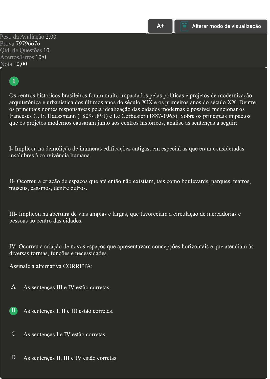 <p>A+ Alterar modo de visualização Peso da Avaliação 2,00 Prova 79796676 Qtd. de Questões 10 Acertos/Erros 10/0 Nota 10,00 1 Os centros históricos brasileiros foram muito impactados pelas políticas e projetos de modernização arquitetônica e urbanística dos últimos anos do século XIX e os primeiros anos do século XX. Dentre os principais nomes responsáveis pela idealização das cidades modernas é possível mencionar os franceses Haussmann (1809-1891) e Le Corbusier (1887-1965). Sobre os principais impactos que os projetos modernos causaram junto aos centros históricos, analise as sentenças a seguir: I- Implicou na demolição de inúmeras edificações antigas, em especial as que eram consideradas insalubres à convivência humana II- Ocorreu a criação de espaços que até então não existiam, tais como boulevards, parques, teatros, museus, cassinos, dentre outros. III- Implicou na abertura de vias amplas e largas, que favoreciam a circulação de mercadorias e pessoas ao centro das cidades. IV- Ocorreu a criação de novos espaços que apresentavam concepções horizontais e que atendiam às diversas formas, funções e necessidades. Assinale a alternativa CORRETA: A As sentenças III e IV estão corretas. B As sentenças I, II e III estão corretas. C As sentenças I e IV estão corretas. D As sentenças II, III e IV estão corretas.</p><p>2 A arqueologia constitui uma ciência que se preocupa com os vestígios e evidências que foram utilizadas pelos seres humanos e as respectivas sociedades. Para favorecer detalhamento e a especificação das atividades, a arqueologia encontra-se subdividida em várias áreas. Dentre elas, pode-se mencionar a arqueologia de ambientes aquáticos, arqueologia da paisagem, arqueologia urbana, arqueologia egípcia, arqueologia amazônica dentre outras. Sobre as especificidades da arqueologia, analise as sentenças a seguir: I- A arqueologia Amazônica se destina a estudar os grupos humanos que residiram e residem na região amazônica. II- A arqueologia de ambientes aquáticos se dedica a estudos em regiões úmidas e submersas, ocupados por rios e mares. III- A arqueologia urbana realiza estudos e pesquisas no interior das cidades, em meio à monumentos, praças, ruas e prédios. IV- A arqueologia da paisagem preocupa-se com as fundações e com a expansão urbana das cidades. Assinale alternativa CORRETA: A Somente as alternativas III e IV estão corretas. B As alternativas II, III e IV estão corretas. C As alternativas I, II, III estão corretas. D Somente as alternativas I e II estão corretas. 3 O colecionismo é uma prática que acompanha a trajetória humana desde a mais longa data. Em cada época e sociedade, a prática do colecionismo ganhou uma importância específica. Ao longo do século XX, ocorreu a proliferação do colecionismo, ao ponto de que foram criadas associações de colecionadores, antiquários, brechós e feiras especializadas, nas quais ocorriam trocas e vendas dos bens colecionáveis. A relação que homem estabeleceu e estabelece com os objetos que guarda sugere inúmeras questões e reflexões que envolvem muitas áreas do conhecimento. Sobre a prática do colecionismo, analise as sentenças a seguir: I- As coleções podem ser realizadas e guardadas apenas de modo privado e pelos respectivos colecionadores. II- A previsão de orçamento pessoal/familiar, bem como a existência de espaço e condições específicas de manutenção das coleções, fez com que elas deixassem de existir no final do século XIX. III- As coleções possibilitaram a criação de inúmeros museus, assim como gabinetes de curiosidades. galerias de ciências, artes, história. dentre outros.</p><p>IV- As coleções nada mais são do que objetos que foram retirados e que pertenceram a uma determinada realidade e contexto. Assinale a alternativa CORRETA: A As sentenças III e IV estão corretas. B As sentenças II, III e IV estão corretas. C As sentenças I, II e III estão corretas. D As sentenças I e II estão corretas. 4 Os sambaquis constituem sítios monticulares. Isso se deve ao fato que resultaram do acúmulo materiais sobrepostos e que tendiam à verticalização. Os estudos revelam que os sambaquis fazem parte de processos de longa duração, gradualmente edificados por diferentes e sucessivas gerações e que podem datar de até 10 mil anos antes do presente. As pesquisas e os estudos sobre os sambaquis e suas populações são pouco conclusivos e ainda estão em desenvolvimento. Com relação aos sambaquis, classifique V para as sentenças verdadeiras e F para as falsas: ( ) A palavra "Sambaqui" é de origem Tupi e lhe é atribuído o significado de amontoado de conchas. ( ) As conchas utilizadas na edificação dos sambaquis são oriundas de crustáceos e moluscos marinhos. ( ) A maior parte dos sambaquis brasileiros encontram-se às margens de rios e lagos do Alto ( ) O desaparecimento das populações sambaquianas brasileiras se deve ao processo de colonização europeia. Agora assinale a alternativa que apresenta a sequencia CORRETA: A V-V-F-F B F-F-V-V</p><p>C F-V-F-V D V-F-V-F 5 Essas definições perduraram, pelo menos, até os anos de 1960. Após os anos de 1960, consenso entre os pesquisadores e especialistas sobre conceitos e definições sobre a arqueologia foram revisados e reescritos, a partir de então a arqueologia passou a designar uma ciência que investiga e estuda vestígios, pistas, evidências, registros humanos que datam de períodos anteriores a presença dos registros escritos e tem como finalidade explicar a origem, desenvolvimento e desaparecimento de grupos humanos e de civilizações. De que profissional estamos falando? A Arquivista. B Arqueólogo. C Pintor. D Biólogo. 6 Os mestres artesãos são reconhecidos em meio à comunidade e junto ao profissionais do ramo pela notoriedade de seu ofício. Costumam se dedicar profundamente e geralmente envolvem outros membros da família. As ativida