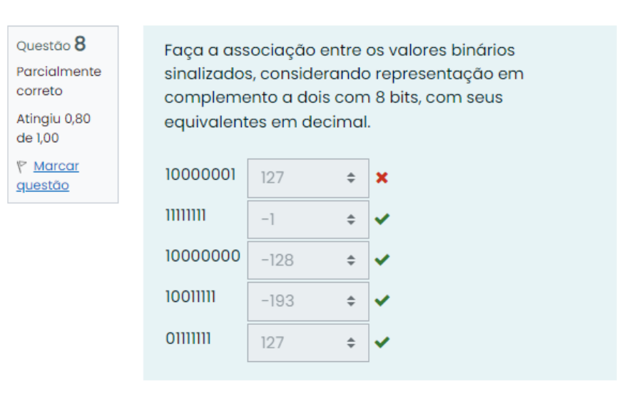 <p>Questão 8 Faça a associação entre os valores binários Parcialmente sinalizados, considerando representação em correto complemento a dois com 8 bits, com seus Atingiu 0,80 equivalentes em decimal. de 1,00 P Marcar 10000001 127 x questão -1 10000000 -128 10011111 -193 127</p>