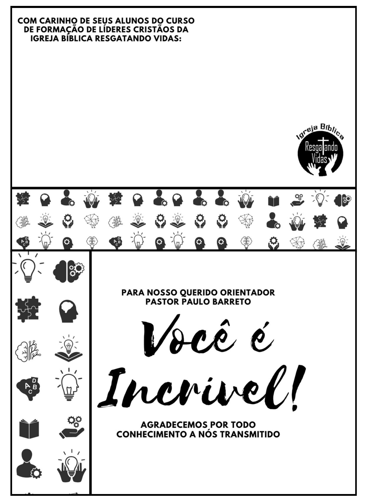 <p>COM CARINHO DE SEUS ALUNOS DO CURSO DE FORMAÇÃO DE LÍDERES CRISTÃOS DA IGREJA BIBLICA RESGATANDO VIDAS: Vidas PARA NOSSO QUERIDO ORIENTADOR PASTOR PAULO BARRETO Voce D A C Incrivel! AGRADECEMOS POR TODO CONHECIMENTO A NOS TRANSMITIDO</p><p>É COM IMENSA GRATIDÃO QUE QUEREMOS DEDICAR ESSE PRESENTE A VOCÊ PASTOR PAULO BARRETO POR TER DEDICADO SEU TEMPO A NOS TRANSMITIR CONHECIMENTO E SABEDORIA, DOM DE ENSINAR QUE DEUS LHE DEU. CUMPRINDO SEMPRE ESCRITO EM PROVÉRBIOS 31: 26 - COM SABEDORIA E ENSINA COM AMOR" E COLOCANDO EM PRATICA SEU DOM ESCRITO EM ROMANOS 12: 07 - "SE SEU DOM E SERVIR, SIRVA; SE ENSINAR, ENSINE." Biblic UM FORTE ABRAÇO E DEUS TE</p>
