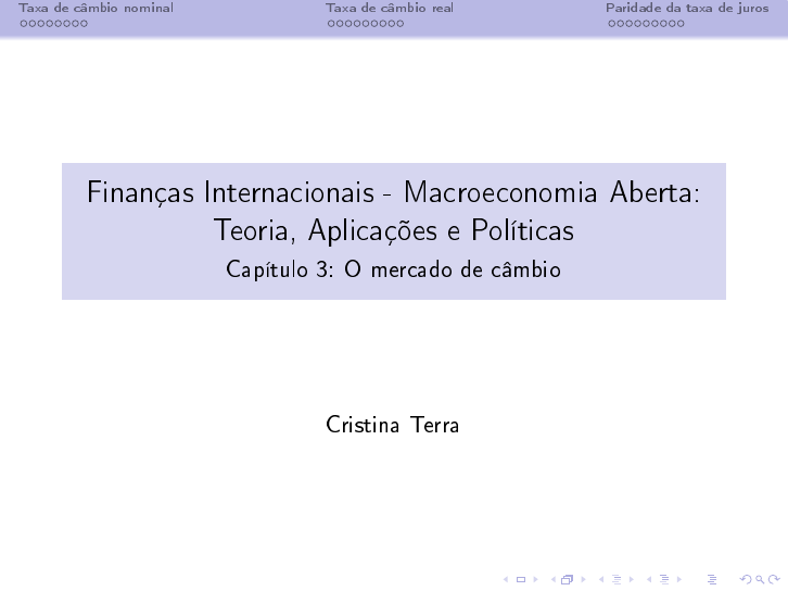<p>Taxa de câmbio nominal Taxa de câmbio real Paridade da taxa de juros</p><p>Finanças Internacionais - Macroeconomia Aberta:</p><p>Teoria, Aplicações e Políticas</p><p>Capítulo 3: O mercado de câmbio</p><p>Cristina Terra</p><p>Taxa de câmbio nominal Taxa de câmbio real Paridade da taxa de juros</p><p>Roteiro</p><p>1 Taxa de câmbio nominal</p><p>De�nições</p><p>Condição de não-arbitragem</p><p>2 Taxa de câmbio real</p><p>De�nições</p><p>Paridade do poder de compra</p><p>3 Paridade da taxa de juros</p><p>De�nições</p><p>Paridade da taxa de juros</p><p>Taxa de câmbio nominal Taxa de câmbio real Paridade da taxa de juros</p><p>Outline</p><p>1 Taxa de câmbio nominal</p><p>De�nições</p><p>Condição de não-arbitragem</p><p>2 Taxa de câmbio real</p><p>De�nições</p><p>Paridade do poder de compra</p><p>3 Paridade da taxa de juros</p><p>De�nições</p><p>Paridade da taxa de juros</p><p>Taxa de câmbio nominal Taxa de câmbio real Paridade da taxa de juros</p><p>Introdução</p><p>A taxa nominal de câmbio é um dos preços mais importantes de</p><p>uma economia, pois serve de referência para todas as transações</p><p>comerciais e �nanceiras com o resto do mundo.</p><p>O câmbio é uma variável de interesse para um amplo conjunto de</p><p>agentes, tais como importadores, exportadores, investidores</p><p>internacionais, turistas, entre outros.</p><p>Uma das primeiras relações que aprendemos em um curso de</p><p>economia é que o preço de um produto afeta os incentivos</p><p>individuais dos produtores e consumidores.</p><p>No capítulo 2 estudamos o balanço de pagamentos, que nada mais</p><p>é do que um registro contábil das relações comerciais/�nanceiras de</p><p>um país com o resto do mundo, e portanto, um registro das ofertas</p><p>e demandas por moeda estrangeira.</p><p>Neste capítulo, veremos como a taxa de cambio e outras variáveis</p><p>relevantes interagem para determinar a oferta e demanda por moeda</p><p>estrangeira.</p><p>Taxa de câmbio nominal Taxa de câmbio real Paridade da taxa de juros</p><p>Taxa de câmbio nominal</p><p>Taxa de câmbio nominal: É o preço relativo de duas moedas. Ao</p><p>longo de todo o curso, a taxa nominal de câmbio será denotada por</p><p>S .</p><p>A taxa de câmbio nominal pode ser cotada de duas formas:</p><p>1 Preço da moeda estrangeira em termos de unidades da moeda</p><p>doméstica. Ex: O câmbio real/dólar de 1,8 signi�ca que são</p><p>necessários R$1,80 para comprar US$1. Denotamos essa taxa como</p><p>SBRL/USD .</p><p>2 Preço da moeda doméstica em termos de unidades da moeda</p><p>estrangeira. Ex. O câmbio dólar/real de 0,56 signi�ca que são</p><p>necessários US$0,560 para comprar R$1. Denotamos essa taxa</p><p>como SUSD/BRL.</p><p>Claramente, as duas de�nições devem estabelecer a mesma taxa de</p><p>troca entre as duas moedas, ou seja:</p><p>SBRL/USD =</p><p>1</p><p>SUSD/BRL</p><p>.</p><p>Taxa de câmbio nominal Taxa de câmbio real Paridade da taxa de juros</p><p>Taxa de câmbio nominal</p><p>Por convenção, o câmbio é sempre cotado como o preço da moeda</p><p>estrangeira em termos da moeda doméstica.</p><p>Desvalorização do câmbio: Ocorre quando a moeda doméstica</p><p>passa a valer menos, isto é, quando a taxa de câmbio, que é o preço</p><p>da moeda estrangeira, S sobe.</p><p>Valorização do câmbio: Acontece quando a moeda doméstica</p><p>passa a valer mais, ou seja, quando a taxa de câmbio S cai.</p><p>A taxa de câmbio é o preço que equilibra as ofertas e demandas por</p><p>moeda estrangeira no mercado de divisas internacionais.</p><p>Quando há excesso de moeda estrangeira no mercado, seu preço</p><p>cai, isto é, a moeda doméstica se valoriza. A desvalorização da</p><p>moeda doméstica acontece quando há escassez de moeda</p><p>estrangeira no mercado.</p><p>Taxa de câmbio nominal Taxa de câmbio real Paridade da taxa de juros</p><p>Taxa de câmbio nominal</p><p>Taxa de câmbio nominal Taxa de câmbio real Paridade da taxa de juros</p><p>Política cambial</p><p>O governo pode intervir diretamente no mercado de câmbio</p><p>comprando ou vendendo moeda estrangeira, e com isso afetar o seu</p><p>preço.</p><p>As transações em moeda estrangeira do governo são resumidas na</p><p>conta de reservas internacionais.</p><p>O governo pode sustentar a taxa de câmbio em nível sobreapreciado</p><p>vendendo (ofertando) moeda estrangeira no mercado, o que</p><p>representa uma redução do volume de reservas internacionais.</p><p>O governo pode sustentar a taxa de câmbio em nível subvalorizado,</p><p>comprando (demandando) moeda estrangeira no mercado, o que</p><p>representa um aumento do volume de reservas internacionais.</p><p>Em geral, o período no qual o governo pode in�uenciar a taxa de</p><p>câmbio é limitado, pois no longo prazo a moeda tende a voltar para</p><p>o equilíbrio compatível com a restrição externa intertemporal da</p><p>economia.</p><p>Taxa de câmbio nominal Taxa de câmbio real Paridade da taxa de juros</p><p>Múltiplas taxas de câmbio</p><p>Existem cerca de 164 moedas no mundo, no entanto, cada</p><p>país transaciona com um número restrito de moedas, o que</p><p>por sua vez, implica na existência de um elevado número de</p><p>taxas de câmbio (uma para cada moeda).</p><p>Em geral, operacionalizar a conversão física de moeda</p><p>doméstica em moeda estrangeira pode ser algo difícil de se</p><p>fazer, na prática.</p><p>Isso ocorre, pois os países costumam transacionar as moedas</p><p>dos principais parceiros comerciais e moedas comumente</p><p>usadas em todo o mundo.</p><p>Moeda-veículo: É uma moeda de grande circulação</p><p>internacional que serve como meio intermediário para</p><p>transações entre duas moedas distintas.</p><p>As principais moedas-veículo são o dólar, o euro, o iene e a</p><p>libra esterlina.</p><p>Taxa de câmbio nominal Taxa de câmbio real Paridade da taxa de juros</p><p>Condiç