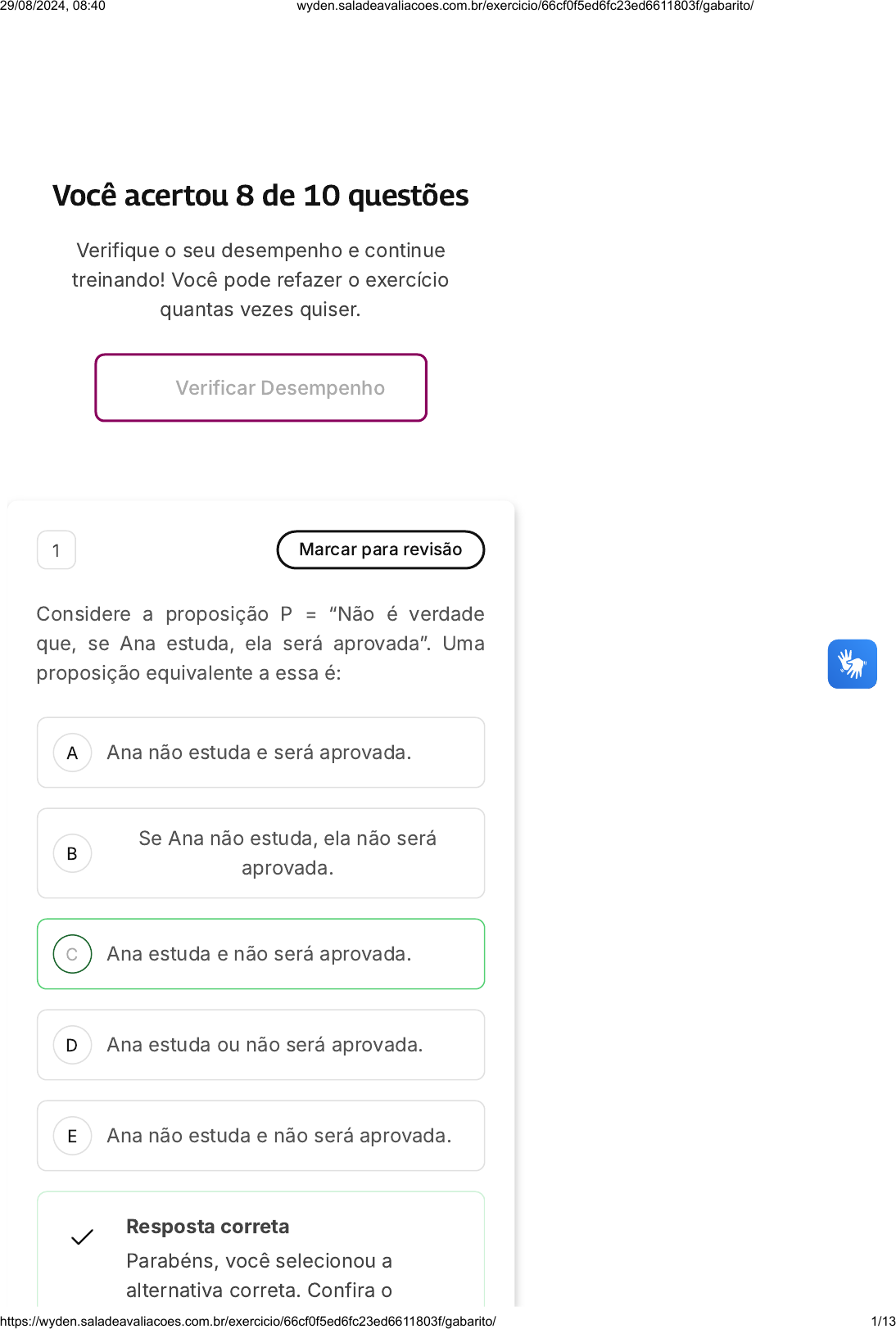 <p>Você acertou 8 de 10 questões</p><p>Verifique o seu desempenho e continue</p><p>treinando! Você pode refazer o exercício</p><p>quantas vezes quiser.</p><p>Verificar Desempenho</p><p>A</p><p>B</p><p>C</p><p>D</p><p>E</p><p>1 Marcar para revisão</p><p>Considere a proposição P = “Não é verdade</p><p>que, se Ana estuda, ela será aprovada”. Uma</p><p>proposição equivalente a essa é:</p><p>Ana não estuda e será aprovada.</p><p>Se Ana não estuda, ela não será</p><p>aprovada.</p><p>Ana estuda e não será aprovada.</p><p>Ana estuda ou não será aprovada.</p><p>Ana não estuda e não será aprovada.</p><p>Resposta correta</p><p>Parabéns, você selecionou a</p><p>alternativa correta. Confira o</p><p>29/08/2024, 08:40 wyden.saladeavaliacoes.com.br/exercicio/66cf0f5ed6fc23ed6611803f/gabarito/</p><p>https://wyden.saladeavaliacoes.com.br/exercicio/66cf0f5ed6fc23ed6611803f/gabarito/ 1/13</p><p>A</p><p>B</p><p>C</p><p>gabarito comentado!</p><p>Gabarito Comentado</p><p>Sabemos que \(\sim(p \rightarrow q)</p><p>\Leftrightarrow(p \wedge \sim q)\). Logo,</p><p>"Não é verdade que, se Ana estuda, ela</p><p>será aprovada", pode ser reescrita como</p><p>"Ana estuda e não será aprovada".</p><p>2 Marcar para revisão</p><p>Considere o seguinte exemplo:</p><p>Proposição O cachorro é um animal</p><p>ou a alface é um vegetal.</p><p>Negação dessa</p><p>proposição</p><p>O cachorro não é um</p><p>animal e a alface não é</p><p>um vegetal.</p><p>Assinale a alternativa que apresenta a negação</p><p>da seguinte proposição:</p><p>Maria não faz o curso de Polímeros ou Júlia</p><p>faz o curso de Silvicultura.</p><p>Maria faz o curso de Polímeros e Júlia</p><p>faz o curso de Silvicultura.</p><p>Maria faz o curso de Polímeros e Júlia</p><p>não faz o curso de Silvicultura.</p><p>Maria faz o curso de Polímeros ou</p><p>Júlia não faz o curso de Silvicultura.</p><p>29/08/2024, 08:40 wyden.saladeavaliacoes.com.br/exercicio/66cf0f5ed6fc23ed6611803f/gabarito/</p><p>https://wyden.saladeavaliacoes.com.br/exercicio/66cf0f5ed6fc23ed6611803f/gabarito/ 2/13</p><p>D</p><p>E</p><p>A</p><p>B</p><p>Maria não faz o curso de Polímeros e</p><p>Júlia não faz o curso de Silvicultura.</p><p>Maria não faz o curso de Polímeros ou</p><p>Júlia não faz o curso de Silvicultura.</p><p>Resposta correta</p><p>Parabéns, você selecionou a</p><p>alternativa correta. Confira o</p><p>gabarito comentado!</p><p>Gabarito Comentado</p><p>Sabendo que a negação de \(p \vee q\) é \</p><p>(\sim(p \vee q) \Leftrightarrow \sim p</p><p>\wedge \sim q\), tem-se que a negaçäo da</p><p>disjunçảo "Maria não faz o curso de</p><p>Polímeros ou Júlia faz o curso de</p><p>Silvicultura" é "Maria faz o curso de</p><p>Polimeros e Júlia năo faz o curso de</p><p>Silvicultura</p><p>3 Marcar para revisão</p><p>As proposições lógicas são fundamentais na</p><p>lógica formal e na matemática. Dentre as frases</p><p>apresentadas, assinale aquela que pode ser</p><p>classificada como uma proposição lógica.</p><p>Como é bom estudar matemática!</p><p>O estudo da matemática é essencial.</p><p>29/08/2024, 08:40 wyden.saladeavaliacoes.com.br/exercicio/66cf0f5ed6fc23ed6611803f/gabarito/</p><p>https://wyden.saladeavaliacoes.com.br/exercicio/66cf0f5ed6fc23ed6611803f/gabarito/ 3/13</p><p>C</p><p>D</p><p>E</p><p>Quanta dificuldade na prova de</p><p>matemática!</p><p>Quem gosta de estudar matemática?</p><p>Estude Matemática e Ciência.</p><p>Resposta correta</p><p>Parabéns, você selecionou a</p><p>alternativa correta. Confira o</p><p>gabarito comentado!</p><p>Gabarito Comentado</p><p>A alternativa "O estudo da matemática é</p><p>essencial" é uma proposição lógica, pois</p><p>expressa uma afirmação que pode ser</p><p>avaliada como verdadeira ou falsa. Ela</p><p>declara que o estudo da matemática é algo</p><p>considerado essencial, podendo ser</p><p>considerada uma proposição lógica.</p><p>4 Marcar para revisão</p><p>Imagine que você está acompanhando a</p><p>performance da Seleção Brasileira de Futebol</p><p>em uma Copa do Mundo e durante a fase</p><p>classificatória, você ouve a seguinte afirmação</p><p>de um comentarista esportivo:</p><p>"A Seleção Brasileira de Futebol classificou-se</p><p>para a Copa do Mundo e não jogou bem."</p><p>Com base nessa afirmação, assinale abaixo a</p><p>alternativa que representa corretamente a</p><p>negação dessa proposição.</p><p>A negação da proposição “A Seleção Brasileira</p><p>de Futebol classificou-se para a Copa do</p><p>29/08/2024, 08:40 wyden.saladeavaliacoes.com.br/exercicio/66cf0f5ed6fc23ed6611803f/gabarito/</p><p>https://wyden.saladeavaliacoes.com.br/exercicio/66cf0f5ed6fc23ed6611803f/gabarito/ 4/13</p><p>A</p><p>B</p><p>C</p><p>D</p><p>E</p><p>Mundo e não jogou bem” é:</p><p>A Seleção Brasileira de Futebol não se</p><p>classificou para a Copa do Mundo e</p><p>não jogou bem.</p><p>A Seleção Brasileira de Futebol</p><p>classificou-se para a Copa do Mundo</p><p>ou não jogou bem.</p><p>A Seleção Brasileira de Futebol não se</p><p>classificou para a Copa do Mundo,</p><p>mas não jogou bem.</p><p>A Seleção Brasileira de Futebol não se</p><p>classificou para a Copa do Mundo ou</p><p>jogou bem.</p><p>A Seleção Brasileira de Futebol</p><p>classificou-se para a Copa do Mundo</p><p>e não jogou bem.</p><p>Resposta incorreta</p><p>Opa! A alternativa correta é a letra</p><p>D. Confira o gabarito comentado!</p><p>Gabarito Comentado</p><p>A negação da proposição original é</p><p>alcançada ao inverter o "e" lógico para</p><p>"ou" lógico e também negar cada uma das</p><p>partes individuais. Isso porque a negação</p><p>de uma conjunção (e) é uma disjunção (ou)</p><p>das negações das partes individuais.</p><p>29/08/2024, 08:40 wyden.saladeavaliacoes.com.br/exercicio/66cf0f5ed6fc23ed6611803f/gabarito/</p><p>https://wyden.saladeavaliacoes.com.br/exercicio/66cf0f5ed6fc23ed6611803f/gabarito/ 5/13</p><p>A</p><p>