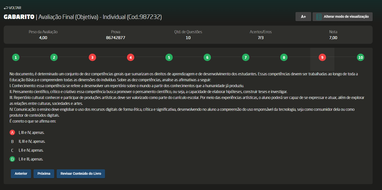 <p>VOLTAR GABARITO Avaliação Final (Objetiva) - Individual (Cod.:987232) A+ Alterar modo de visualização Peso da Avaliação Prova Qtd. de Questões Acertos/Erros Nota 4,00 86742877 10 7/3 7,00 1 2 3 5 6 7 8 9 10 No documento, é determinado um conjunto de dez competências gerais que sumarizam os direitos de aprendizagem e de desenvolvimento dos estudantes. Essas competências devem ser trabalhadas ao longo de toda a Educação Básica e compreendem todas as dimensões do indivíduo. Sobre as dez competências, analise as afirmativas a I. Conhecimento: essa competência se refere a desenvolver um repertório sobre mundo a partir dos conhecimentos que a humanidade já produziu. II. Pensamento científico, crítico e criativo: essa competência busca promover pensamento científico, ou seja, a capacidade de elaborar hipóteses, construir teses e investigar. III. Repertório cultural: conhecer e participar de produções artísticas deve ser valorizado como parte do currículo escolar. Por meio das experiências artísticas, aluno poderá ser capaz de se expressar e atuar, além de explorar as relações entre culturas, sociedades e artes. IV. Comunicação: ensino deve englobar dos recursos digitais de forma ética, crítica e significativa, desenvolvendo no aluno a compreensão do USO responsável da tecnologia, seja como consumidor dela ou como produtor de conteúdos digitais. É correto que se afirma em: I, III e IV, apenas. II, III e apenas. I, e apenas. D I, e III, apenas. Anterior Próxima Revisar Conteúdo do Livro</p>