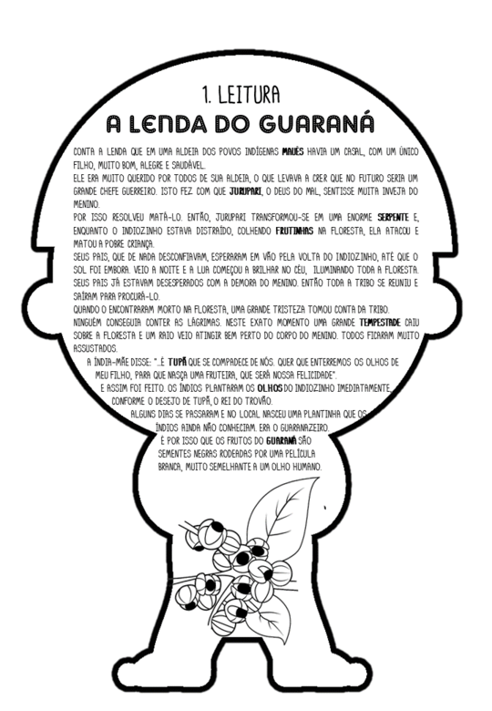 <p>1. LEITURA A LENDA DO GUARANÁ CONTA A LENDA QUE EM UMA ALDEIA DOS POVOS HAVIA UM COM UM FILHO, MUITO BOM ALEGRE E ELE ERA MUITO QUERIDO POR TODOS DE ALDEIA 0 QUE LEVAVA A CRER QUE NO FUTURO SERIA UM GRANDE CHEFE GUERREIRO ISTO FEZ COM QUE 0 DO SENTISSE MUITA INVEJA DO POR ISSO RESOLVEU JURUPARI TRANSFORMOU-SE EM UMA ENORME SERPENTE E, ENQUANTO 0 INDIOZINHO ESTAVA COLHENDO NA ELA ATACOU E MATOU A POBRE CRIANÇA SEUS QUE DE NADA EM VAO PELA VOLTA DO ATÉ QUE 0 SOL FOI EMBORA VEIO A NOITE E A LUA A BRILHAR NO ILUMINANDO TODA A FLORESTA SEUS PAIS JA ESTAVAM DESESPERADOS COM A DEMORA DO MENINO TODA A TRIBO SE REUNIU E PARA PROCURA-LO QUANDO 0 ENCONTRARAM MORTO NA FLORESTA UMA GRANDE TRISTEZA TOMOU CONTA DA TRIBO CONSEGUIA CONTER AS LAGRIMAS NESTE EXATO MOMENTO UMA GRANDE TEMPESTADE CAIU SOBRE A FLORESTA E UM RAIO ATINGIR BEM PERTO DO CORPO DO MENINO TODOS FICARAM MUITO ASSUSTADOS A INDIA-MAE TUPA QUE SE COMPADECE DE QUER QUE ENTERREMOS OLHOS DE PARA QUE NASCA UMA QUE SERA NOSSA FELICIDADE" E ASSIM FOI FEITO INDIOS PLANTARAM OS OLHOSDO INDIOZINHO IMEDIATAMENTE CONFORME 0 DESEJO DE 0 REI DO DIAS SE PASSARAM E NO LOCAL NASCEU UMA PLANTINHA QUE INDIOS AINDA CONHECIAM ERA 0 GUARANAZEIRO E POR ISSO QUE FRUTOS DO SEMENTES NEGRAS RODEADAS POR UMA MUITO SEMELHANTE A UM OLHO HUMANO</p>