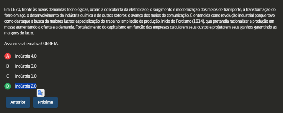 <p>Em 1870, frente às novas demandas tecnológicas, ocorre a descoberta da eletricidade, surgimento e modernização dos meios de transporte, a transformação do ferro em aço, desenvolvimento da indústria química e de outros setores, avanço dos meios de comunicação. É entendida como revolução industrial porque teve como destaque a busca de maiores lucros: especialização do trabalho; ampliação da produção. Início do Fordismo (1914), que pretendia racionalizar a produção em massa aumentando a oferta e a demanda. Fortalecimento do capitalismo em função das empresas calcularem seus custos e projetarem seus ganhos garantindo as margens de lucro. Assinale a alternativa CORRETA: A Indústria 4.0 B Indústria 3.0 Indústria 1.0 D Indústria 2.0 Anterior Próxima</p>