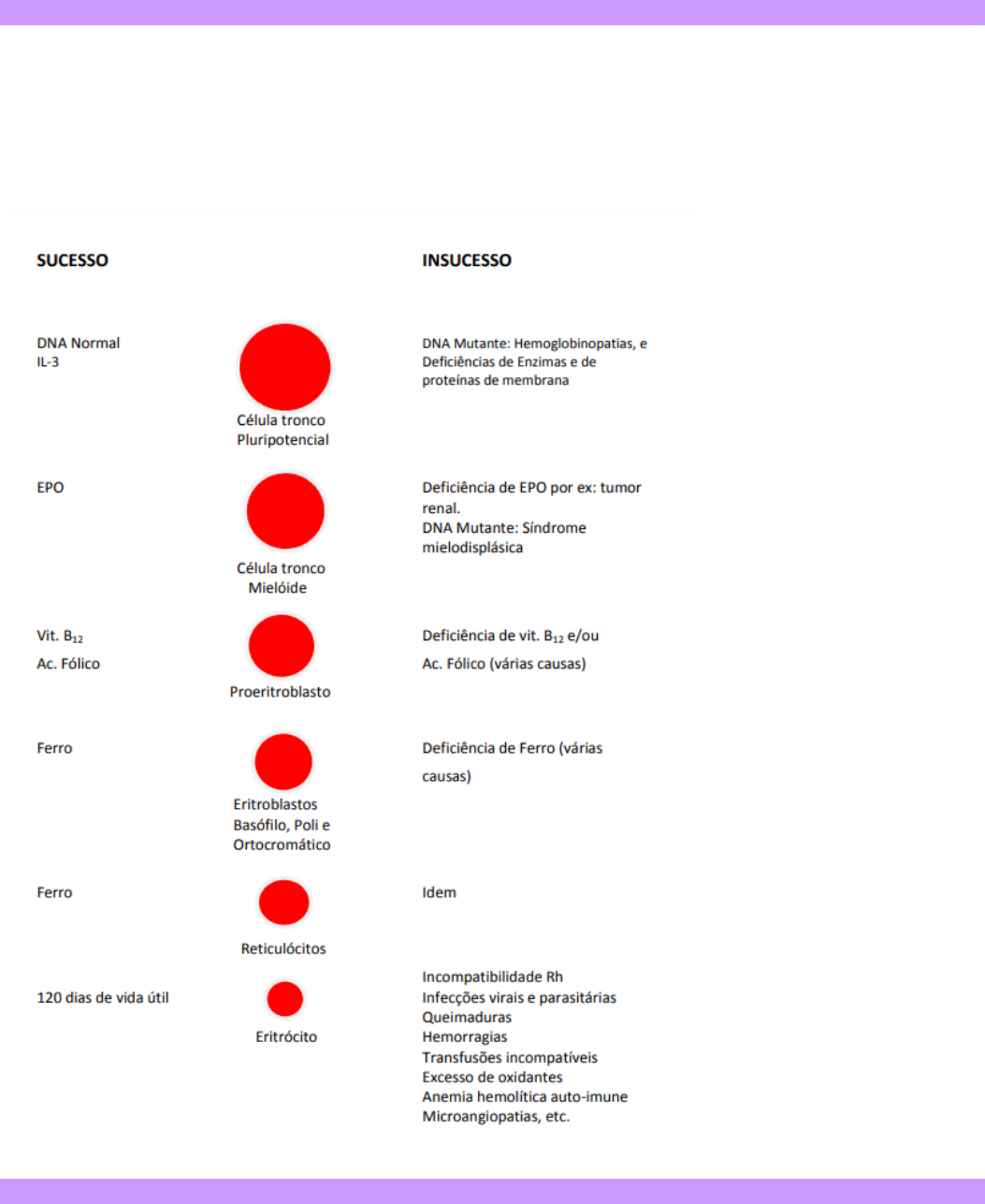 <p>ANEMIAS -Aspectos clínicos</p><p>REVISAR ERITROPOIESE:</p><p>-Essa terminologia se refere exclusivamente à formação dos eritrócitos, desde a célula tronco</p><p>pluripotencial primitiva, das células nucleadas intermediárias (eritroblastos), reticulócitos, eritrócitos,</p><p>fatores da eritropoiese (eritropoietina ou EPO, vitamina B12, ácido fólico e ferro), fatores genéticos, fatores</p><p>ambientais (infecção, queimadura, etc). Portanto a eritropoiese não se refere apenas ao desenvolvimento</p><p>morfológico e funcional dos eritrócitos e de seus precursores, mas também são dependentes de situações</p><p>inesperadas, por exemplo: incompatibilidade materno-fetal de Rh, entre outras</p><p>DEFINIÇÃO DE ANEMIA:</p><p>A anemia é definida como a diminuição das hemácias e da hemoglobina circulantes. É um sinal</p><p>secundário de alguma doença de base, podendo ser decorrente de múltiplas causas, sendo a mais</p><p>frequente a ferropriva ou ferropênica. Por esse motivo, deve-se investigar a causa base da anemia, a fim</p><p>de escolher a melhor medida terapêutica.</p><p>De acordo com a OMS, anemia é quando a taxa de hemoglobina se encontra abaixo de 13,5 g/dL em</p><p>homens e 11,5 g/dL em mulheres não grávidas.</p><p>A anemia pode ser classificada em aguda ou crônica. A aguda é decorrente principalmente de hemorragia</p><p>ou hemólise, que pode se manifestar com quadro clínico de hipotensão arterial sistêmica e perfusão</p><p>orgânica reduzida. A crônica possui sintomas diversos, de acordo com a idade e a adequação do</p><p>suprimento sanguíneo para os diversos órgãos.</p><p>→Redução da massa eritrocitária</p><p>→Consequência: redução da capacidade de transporte de O2</p><p>→Parâmetro: baseada na concentração de hemoglobina (HB)</p><p>QUADRO CLÍNICO- SINTOMAS:</p><p>O quadro clínico da anemia é bastante variável, existindo desde pacientes assintomáticos até sinais e</p><p>sintomas de choque hipovolêmico em decorrência de um sangramento excessivo. Muitas vezes o paciente</p><p>manifesta apenas fadiga.</p><p>Os sintomas são mais intensos na anemia aguda do que na anemia crônica, pois esta última utiliza de</p><p>mecanismos compensatórios, como a taquicardia, que promovem a adaptação à queda da oferta tecidual</p><p>de oxigênio.</p><p>A manifestação clínica ocorre quando a anemia contribui para a redução da oferta de oxigênio,</p><p>principalmente ao cérebro e ao coração, o que ocasiona, como forma de compensação, aumento da</p><p>frequência cardíaca e da volemia.</p><p>Caso esses mecanismos sejam insuficientes para compensar a queda na oferta de oxigênio aos tecidos,</p><p>os pacientes passam a manifestar sintomatologia.</p><p>A condição clínica de cada paciente varia de acordo com os seguintes fatores:</p><p>• Capacidade compensatória de cada paciente</p><p>• Gravidade do déficit de eritrócitos</p><p>• Velocidade de instalação da anemia: rapidamente (horas) ou gradualmente (meses ou anos) Esses</p><p>fatores justificam o fato de alguns pacientes com anemia acentuada não apresentarem sinais nem</p><p>sintomas, enquanto outros com anemia leve podem manifestar grande incapacidade</p><p>Observa-se que pacientes com anemia podem apresentar os seguintes sinais e sintomas gerais: palidez</p><p>cutâneo-mucosa, fadiga, astenia, dores musculares, unhas quebradiças, dispneia, taquicardia aos</p><p>esforços, palpitações, insuficiência cardíaca congestiva, sopro cardíaco, sonolência, irritabilidade,</p><p>náuseas, perda da libido e impotência. Em casos mais graves, pode haver edema de membros</p><p>inferiores e sintomas decorrentes da hipóxia cerebral (cefaleia, vertigem e escotomas).</p><p>QUADRO CLÍNICO – SINAIS:</p><p>A palidez é melhor avaliada nas conjuntivas e mucosas, pois os revestimentos são mais constantes, e as</p><p>variações de fluxo sanguíneo menos acentuadas. A palidez associada à anemia pode ser detectada mais</p><p>constantemente na membrana mucosa da boca e orofaringe, conjuntiva, leito ungueal e lábios.</p><p>No paciente com anemia, é necessária a realização de um exame físico minuncioso, buscando possíveis</p><p>causas base para a anemia.</p><p>Exame físico geral:</p><p>Estado geral, palidez cutâneo-mucosa, icterícia e fâneros.</p><p>Cardiopulmonar: Taquipneia, taquicardia, sopros.</p><p>Abdome: Víscero-megalias e tumorações</p><p>Linfático: Linfadenopatias</p><p>Sistema nervoso: principalmente na suspeita de anemias carenciais decorrentes de deficiência de vitamina</p><p>B12. Deve-se incluir o tempo de relaxamento do reflexo dos tendões que pode sugerir hipotireoidismo em</p><p>pacientes pouco sintomáticos.</p><p>Mamas: Nodulações</p><p>Próstata: Tamanho e textura</p><p>Quadros crônicos que apresentem febre, icterícia, petéquias, telangiectasias (capilares vermelhos ou</p><p>acastanhados que se adensam debaixo da pele), presença de artrite crônica ou ativa, aumento dos</p><p>gânglios linfáticos, dor óssea, queilite e estomatite sugerem deficiência de ferro.</p><p>Os achados semiológicos não são suficientes para estabelecer as causas da anemia, sendo</p><p>indispensável a solicitação de um hemograma em todos os casos.</p><p>EXAME FÍSICO RELACIONADO AO DIAGNÓSTICO DIFERENCIAL</p><p>De acordo com o tipo de anemia, encontram-se sinais específicos no exame físico:</p><p>• Na deficiência de ferro observa-se coiloníquia (unhas em colher), queilite angular, glossite, atrofia papilar,</p><p>disfagia e perversão do apetite.</p><p>• Na anemia hemolítica há icterícia e esplenomegalia.</p><p>• Úlceras de perna aparecem na anemia de células falciforme e outras anemias hemolíticas, e</p><p>deformidades ósseas acontecem na talassemia maior.</p><p>• Dispepsia, pirose e dor epigástrica estão presentes na anemia ferropriva secundária a hemorragia</p><p>crônica de úlcera péptica.</p><p>• Na anemia aplásica ou
