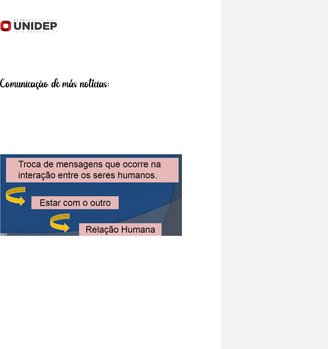 <p>Ana Julia Carlet Aquino</p><p>3º período</p><p>HAM III CLM</p><p>→A informação que carrega carga emocional possui potencial de mudar a vida de alguém: perda familiar,</p><p>amputação de membros, doenças crônicas ou degenerativas</p><p>→Difíceis de ouvir e dizer: provavelmente uma das tarefas mais difíceis a um profissional de saúde=</p><p>impacto psicológico do paciente e sua rede de apoio</p><p>→A maneira como se diz deve ser elevado em consideração</p><p>→Comunicação é a base das relações humanas: ferramenta indispensável no contato médico paciente</p><p>→Relação precisa ser verdadeira, mas é necessário saber os limites diante de questões de terminalidade,</p><p>precisa progredir de acordo com as condições emocionais do paciente → gerar um ambiente onde exista</p><p>conforto emocional</p><p>→Necessário saber se de fato o paciente compreendeu a informação. Ex: ao prescrever um medicamento</p><p>para tratamento de diabetes, pergunte ao final da consulta qual o nome da medicação indicada e como</p><p>deverá fazer uso → reassegurar que está compreendido</p><p>DIFICULDADES:</p><p>-Confrontar sentimentos de ambos os lados da comunicação:</p><p>-Paciente ou a família, que tem que lidar com a tristeza e o desespero da informação,</p><p>-Profissional, que tem que lidar com:</p><p>– autoconfiança</p><p>– próprios sentimentos</p><p>Ana Julia Carlet Aquino</p><p>3º período</p><p>– reação do ouvinte</p><p>-Perda pode ser vista, pelo médico, como um fracasso.</p><p>-Médicos:</p><p>– incapazes de comunicar más notícias</p><p>– comunicar com a família</p><p>– dificuldades para entender como fazê-lo</p><p>– sentindo medo e ansiedade impactos físicos</p><p>→Há uma dificuldade nas equipes de saúde, de forma geral, para lidar com habilidades gerais de</p><p>comunicação</p><p>→Fatores necessários: competência, honestidade, atenção, tempo para perguntas, diagnostico direto e</p><p>compreensível fazendo uso de linguajar claro= empatia, compreensão e desejo de ajuda</p><p>→No caso de más notícias previstas (antecipadas), pergunte antes quem ele quer que esteja presente e</p><p>o quanto ele gostaria que os outros fossem envolvidos, pois é direito do paciente escolher quem</p><p>poderá ouvir a noticia junto, tanto que podem ocorrer implicações legais caso pessoas não autorizadas</p><p>acabem ouvindo a notícia</p><p>→É necessário conhecer cuidadosamente a história médica do paciente: consistência às decisões clínicas</p><p>e comunicação fluirá mais claramente</p><p>→Deve-se prestar atenção na família, como ela irá reagir e necessidades particulares de cada um</p><p>→Validar e encorajar as emoções de cada paciente, assim sentem-se acolhidos</p><p>→Estar atento no quanto o paciente quer saber: perguntar antes e assim proceder, pois é direito de cada</p><p>um escolher até onde deseja saber; caso não queira saber, pergunte se há algum familiar ou pessoa de</p><p>confiança a quem deseja que médico conte</p><p>1) Protocolo SHARE:</p><p>-4 etapas:</p><p>(1) criar um ambiente de apoio,</p><p>(2) considerar como dar a notícia,</p><p>(3) discutir informações adicionais que os pacientes gostariam de saber, e</p><p>(4) fornecer segurança e emoções suporte.</p><p>2) Preparação antecipada ABCDE:</p><p>Construir um ambiente\relacionamento terapêutico,</p><p>Comunicar bem</p><p>Comentado [U1]:</p><p>Ana Julia Carlet Aquino</p><p>3º período</p><p>Lidar com reações do paciente e da família</p><p>Encorajar e validar emoções</p><p>Introdução antes da notícia, a notícia em si, e um tempo para as reações do paciente e da família</p><p>3) Protocolo SPIKES: geralmente é mais utilizado</p><p>S: preparando-se para o encontro: o próprio profissional deve planejar o que será dito, criar um</p><p>ambiente apropriado, saber quem são pessoas que paciente quer presente</p><p>P: percebendo o paciente: investigar o quanto ele quer saber → perguntar= usar perguntas abertas:</p><p>como você tem se sentido? O que seu medico te disse? O que ele sabe sobre sua doença e situação</p><p>I: convidar para diálogo: convidar paciente a procurar entender o quanto deseja saber sobre doença,</p><p>como está se sentindo, expectativas; Quais suas expectativas e dúvidas com relação à..? Como você</p><p>gostaria que eu te desse a informação sobre seus exames? Prefere informações detalhadas?</p><p>cuidar a linguagem verbal e não verbal</p><p>K: transmitindo informações: transmitir a informação propriamente dita, não fazer de forma brusca,</p><p>procurar introduzir o paciente que más notícias virão,</p><p>E: expressando emoções: diferentes pacientes possuem diferentes formas de expressar suas emoções,</p><p>cabe ao médico saber lidar com cada uma</p><p>S: resumindo e organizando estratégias: traçar um plano terapêutico de cuidado, perguntar se paciente</p><p>compreendeu o que será feito em relação ao seu diagnostico, explicar possíveis soluções, identificar</p><p>mecanismo de rede de apoio, sempre dar uma esperança</p><p>Ana Julia Carlet Aquino</p><p>3º período</p><p>→Evitar dureza excessiva, evitar frases “não há mais o que fazer” lembrar que sempre há opções como</p><p>controle da dor, oferecer conforto, paciente já esta em uma situação difícil, o papel do médico NÃO é</p><p>desesperar</p><p>Ana Julia Carlet Aquino</p><p>3º período</p>