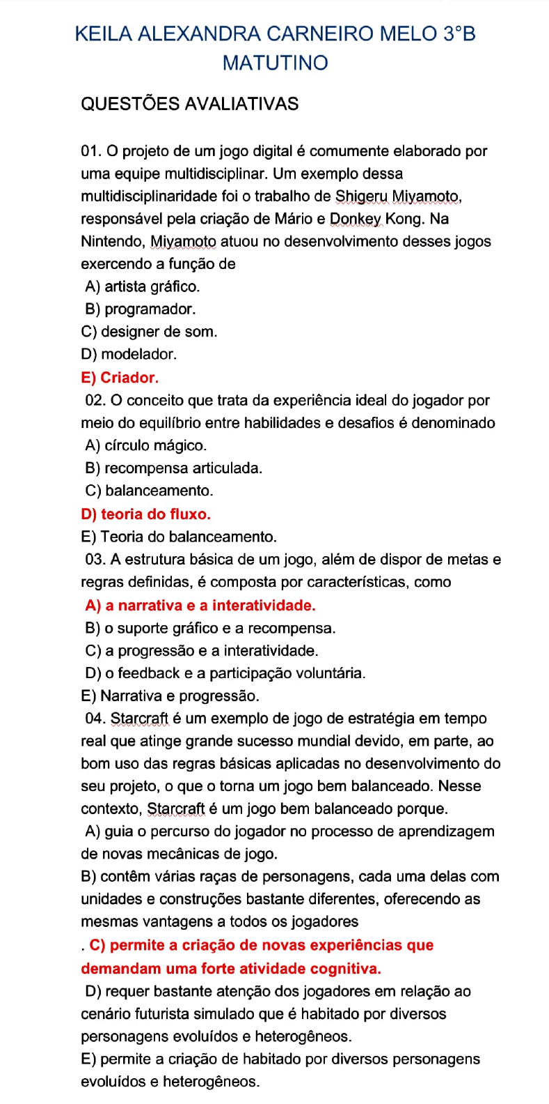 <p>KEILA ALEXANDRA CARNEIRO MELO 3°B</p><p>QUESTÖES AVALIATIVAS</p><p>01. O projeto de um jogo digital é comumente elaborado por</p><p>uma equipe multidisciplinar. Um exemplo dessa</p><p>multidisciplinaridade foi o trabalho de Shigeru Miyamoto,</p><p>responsável pela criação de Mário e Donkey Kong. Na</p><p>Nintendo, Miyamoto atuou no desenvolvimento desses jogos</p><p>exercendo a função de</p><p>A) artista gráfico.</p><p>B) programador.</p><p>C) designer de som.</p><p>D) modelador.</p><p>E) Criador.</p><p>MATUTINO</p><p>02. O conceito que trata da experiência ideal do jogador por</p><p>meio do equilíbrio entre habilidades e desafios é denominado</p><p>A) círculo mágico.</p><p>B) recompensa articulada.</p><p>C) balanceamento.</p><p>D) teoria do fluxo.</p><p>E) Teoria do balanceamento.</p><p>03. A estrutura básica de um jogo, além de dispor de metas e</p><p>regras definidas, é composta por características, como</p><p>A) a narrativa e a interatividade.</p><p>B) o suporte gráfico ea recompensa.</p><p>C) a progressão e a interatividade.</p><p>D) o feedback e a participação voluntária.</p><p>E) Narrativa e progressão.</p><p>04. Starcraft é um exemplo de jogo de estratégia em tempo</p><p>real que atinge grande sucesso mundial devido, em parte, ao</p><p>bom uso das regras básicas aplicadas no desenvolvimento do</p><p>seu projeto, o que o torna um jogo bem balanceado. Nesse</p><p>contexto, Starcraft é um jogo bem balanceado porque.</p><p>A) guia o percurso do jogador no processo de aprendizagem</p><p>de novas mecânicas de jogo.</p><p>B) contêm várias raças de personagens, cada uma delas com</p><p>unidadese construções bastante diferentes, oferecendo as</p><p>mesmas vantagens a todos os jogadores</p><p>. C) permite a criação de novas experiências que</p><p>demandam uma forte atividade cognitiva.</p><p>D) requer bastante atenção dos jogadores em relação ao</p><p>cenário futurista simulado que é habitado por diversos</p><p>personagens evoluídos e heterogêneos.</p><p>E) permite a criação de habitado por diversos personagens</p><p>evoluídos e heterogêneos.</p><p>05. O componente emocional da experiência de um jogador é</p><p>um ponto importante a ser considerado pelo game designer na</p><p>criação de um jogo. Trata-se de um componente responsável</p><p>por fazer os jogos se tornarem envolventes, engajando</p><p>verdadeiramente os jogadores no ambiente projetado e</p><p>proporcionando-Ihes uma boa experiência. Esse componente</p><p>emocional é denominado</p><p>A) motivação.</p><p>B) diversão.</p><p>C) imaginação.</p><p>D) interação.</p><p>E) Cognitivo.</p><p>Brincadeiras e jogos</p><p>06. Jogos populares são aqueles que foram passados de geração a</p><p>geração, isto é, aprendemos com nossa família. Alguns brinquedos,</p><p>jogos e brincadeiras conhecidos pelos adultos e crianças brasileiras</p><p>têm origens surpreendentes. Vêm tanto dos povos que deram</p><p>origem à nossa civilização: o índio, o europeu eo africano; como até</p><p>mesmo do longínquo Oriente. Assinale a questão que apresenta</p><p>jogos e brincadeiras tradicionais:</p><p>a) Peteca, taco, pular corda e esconde-esconde.</p><p>b) Natação, atletismo, tênis e basquetebol.</p><p>c) Bambolê, pipa, futebol e bolinha de gude.</p><p>d) Amarelinha, passa anel, pega-pega, e vôlei.</p><p>e) Natação ,passa anel, pega-pega, e vôlei.</p><p>07. Leia as frases abaixo e responda a questão correta.</p><p>|- No esporte as regras são fixas e preestabelecidas pelas</p><p>federações, confederações, ligas e comitês que regem as</p><p>modalidades.</p><p>I-No jogo as regras são flexÍveis e adaptadas.</p><p>Il|- No esporte é necessário um espaço físico adequado para sua</p><p>pratica e os jogos podem ser praticados nas ruas, campinhos,</p><p>praias, etc.</p><p>a)) Somente a frase I esta correta.</p><p>b) As frases Il e I|l estão corretas.</p><p>c)Todas as frases estão corretas.</p><p>d) Todas as frases estão incorretas.</p><p>e) somente a ll esta correta.</p><p>08. Cite uma brincadeira que você gosta e a explique de forma</p><p>detalhadamente.</p><p>Esconde-esconde, é bastante interativo e não exclui ninguém fazendo com que</p><p>todos participe e se divirtam por horas, trata-se de se esconder enquanto um</p><p>pessoa procura todos que estão participando.</p><p>09. Os jogos e as brincadeiras constituem atividades</p><p>fundamentais na educação infantil, constituindo-se em</p><p>atividades básicas para proporcionar a aprendizagem e o</p><p>desenvolvimento das crianças. Em relação a essas atividades,</p><p>avalie as afirmações a seguir.</p><p>- Na brincadeira do faz-de-conta, o jogo simbólico é uma</p><p>atividade que contribui para desenvolver, nas crianças, a</p><p>capacidade de representação essencial para o</p><p>desenvolvimento da linguagem.</p><p>I|- Nas brincadeiras, as crianças transformam o conhecimento</p><p>que já possuíam em conceitos cientificos.</p><p>IlI- A brincadeira é uma linguagem infantil que mantém um</p><p>vínculo essencial com aquilo que é o não-brincar.</p><p>IV- Na educação infantil, as brincadeiras e os jogos devem se</p><p>basear no princípio da espontaneidade, o que não exige</p><p>planejamento por parte do professor.</p><p>Das afirmações, estão corretas</p><p>a) ll e ll.</p><p>b) l e IV.</p><p>c) le ll.</p><p>d) Il e IV.</p><p>e) IVe ll.</p><p>10. O ato de brincar está presente na história da humanidade,</p><p>ligando as diferentes gerações. Em relação à criança e ao brincar, é</p><p>correto afirmar que:</p><p>a) O ato de brincar não desenvolvee não educa a atenção de</p><p>uma criança.</p><p>b) O brincar não tem relação com o que é desenvolvido no curriculo</p><p>das escolas.</p><p>c) O ato de brincar promove aquisições de suporte para a</p><p>apropriação da leitura e da escrita.</p><p>d) .As decisões para a realização das brincadeiras pelas crianças</p><p>devem ser dos a