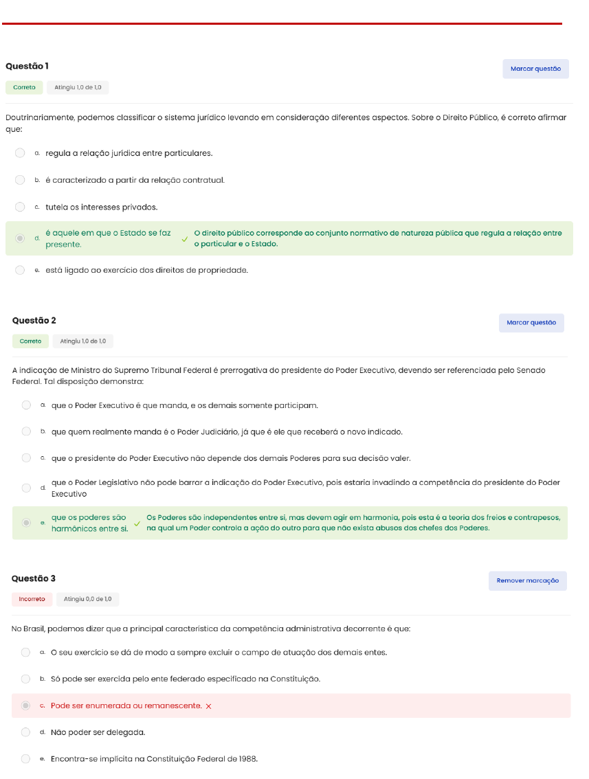 <p>Avaliação Final - Introdução ao Direito Constitucional</p><p>Avaliação Final - Introdução ao</p><p>Direito Constitucional</p><p>Blocos</p><p>Situação</p><p>Finalizada</p><p>Nota</p><p>9,0 de um máximo de 10,0(90%)</p><p>Questão 1</p><p>Correto</p><p>Atingiu 1,0 de 1,0</p><p>Marcar questão</p><p>Doutrinariamente, podemos classificar o sistema jurídico levando em consideração diferentes</p><p>aspectos. Sobre o Direito Público, é correto afirmar que:</p><p>Questão 1Resposta</p><p>a.regula a relação jurídica entre particulares.</p><p>b.é caracterizado a partir da relação contratual.</p><p>c.</p><p>tutela os interesses privados.</p><p>d.é aquele em que o Estado se faz presente.</p><p>O direito público corresponde ao conjunto normativo de natureza pública que regula a relação</p><p>entre o particular e o Estado.</p><p>e.está ligado ao exercício dos direitos de propriedade.</p><p>Questão 2</p><p>Correto</p><p>Atingiu 1,0 de 1,0</p><p>Marcar questão</p><p>A indicação de Ministro do Supremo Tribunal Federal é prerrogativa do presidente do Poder</p><p>Executivo, devendo ser referenciada pelo Senado Federal. Tal disposição demonstra:</p><p>Questão 2Resposta</p><p>a.</p><p>que o Poder Executivo é que manda, e os demais somente participam.</p><p>b.</p><p>que quem realmente manda é o Poder Judiciário, já que é ele que receberá o novo indicado.</p><p>c.</p><p>que o presidente do Poder Executivo não depende dos demais Poderes para sua decisão valer.</p><p>d.</p><p>que o Poder Legislativo não pode barrar a indicação do Poder Executivo, pois estaria invadindo</p><p>a competência do presidente do Poder Executivo</p><p>e.</p><p>que os poderes são harmônicos entre si.</p><p>Os Poderes são independentes entre si, mas devem agir em harmonia, pois esta é a teoria dos</p><p>freios e contrapesos, na qual um Poder controla a ação do outro para que não exista abusos</p><p>dos chefes dos Poderes.</p><p>Questão 3</p><p>Incorreto</p><p>Atingiu 0,0 de 1,0</p><p>Remover marcação</p><p>No Brasil, podemos dizer que a principal característica da competência administrativa</p><p>decorrente é que:</p><p>Questão 3Resposta</p><p>a.</p><p>O seu exercício se dá de modo a sempre excluir o campo de atuação dos demais entes.</p><p>b.</p><p>Só pode ser exercida pelo ente federado especificado na Constituição.</p><p>c.</p><p>Pode ser enumerada ou remanescente.</p><p>d.</p><p>Não poder ser delegada.</p><p>e.</p><p>Encontra-se implícita na Constituição Federal de 1988.</p><p>Questão 4</p><p>Correto</p><p>Atingiu 1,0 de 1,0</p><p>Marcar questão</p><p>O controle social “[...] é entendido como a participação do cidadão na gestão pública, na</p><p>fiscalização, no monitoramento e no controle das ações da Administração Pública. Trata-se de</p><p>um importante mecanismo de fortalecimento da cidadania” (BRASIL, 2011, p. 16). Avalie as</p><p>afirmativas sobre o controle social e as políticas públicas:</p><p>I- Não há coerência e respaldo com os instrumentos governamentais existentes em relação ao</p><p>atendimento dos requisitos mínimos para a promoção e formulação de uma política pública.</p><p>II - As políticas públicas devem estar fundamentadas em análises de viabilidade física e</p><p>financeira para a sua implantação.</p><p>III- As políticas públicas deverão possuir os instrumentos de monitoramento, avaliação e</p><p>aferição dos resultados, visando assegurar a efetividade do programa das políticas públicas.</p><p>É correto o que se afirma em:</p><p>Questão 4Resposta</p><p>a.</p><p>I, apenas</p><p>b.</p><p>I e II, apenas</p><p>c.</p><p>I, II e III, apenas</p><p>d.</p><p>I e III, apenas</p><p>e.</p><p>II e III, apenas</p><p>As afirmativas II e III estão corretas, já que são etapas necessárias a concretização de uma</p><p>política pública. As políticas públicas devem ter coerência e respaldo com os instrumentos</p><p>governamentais existentes, assim como o atendimento dos requisitos mínimos para a sua</p><p>promoção e formulação.</p><p>Questão 5</p><p>Correto</p><p>Atingiu 1,0 de 1,0</p><p>Marcar questão</p><p>Para Alexandre de Moraes, “controlar a constitucionalidade significa verificar a adequação</p><p>(compatibilidad~de uma lei ou de um ato normativo com a Constituição, verificando seus</p><p>requisitos formais e materiais” (MORAES, 2005, p. 627). Avalie as afirmativas a seguir em</p><p>relação ao controle de constitucionalidade:</p><p>I- Controle pode ser preventivo quando realizado durante o processo legislativo de formação</p><p>do ato normativo e antes do projeto de lei ingressar no ordenamento jurídico.</p><p>II- Controle pode ser repressivo, que será realizado sobre a lei e não mais sobre o projeto de</p><p>lei, após o término de seu processo legislativo e seu ingresso no ordenamento jurídico.</p><p>III- Controle concentrado ou abstrato de constitucionalidade que é exercido por qualquer juiz</p><p>ou tribunal, todas as esferas normativas (leis ou atos normativos federais, estaduais, distritais</p><p>e municipais).</p><p>IV- Controle difuso ou concreto, onde se procura obter a declaração de inconstitucionalidade</p><p>de lei ou de ato normativo em tese.</p><p>Avalie as afirmativas a seguir com base nas ações que integram o “controle concentrado” de</p><p>constitucionalidade. É correto no que se afirma em:</p><p>Questão 5Resposta</p><p>a.</p><p>I e II</p><p>No controle concentrado ou abstrato de constitucionalidade, busca-se a declaração de</p><p>inconstitucionalidade e no controle difuso ou concreto o juiz da causa irá analisar a ação e o</p><p>incidente proposto.</p><p>b.</p><p>II e III</p><p>c.</p><p>I, II, III e IV</p><p>d.</p><p>I, II e III</p><p>e.</p><p>II, III e IV</p><p>Questão 6</p><p>Correto</p><p>Atingiu 1,0 de 1,0</p><p>Marcar questão</p><p>Os Estados são figuras centrais para a construção de um ordenamento jurídico. Sobre essa</p><p>f