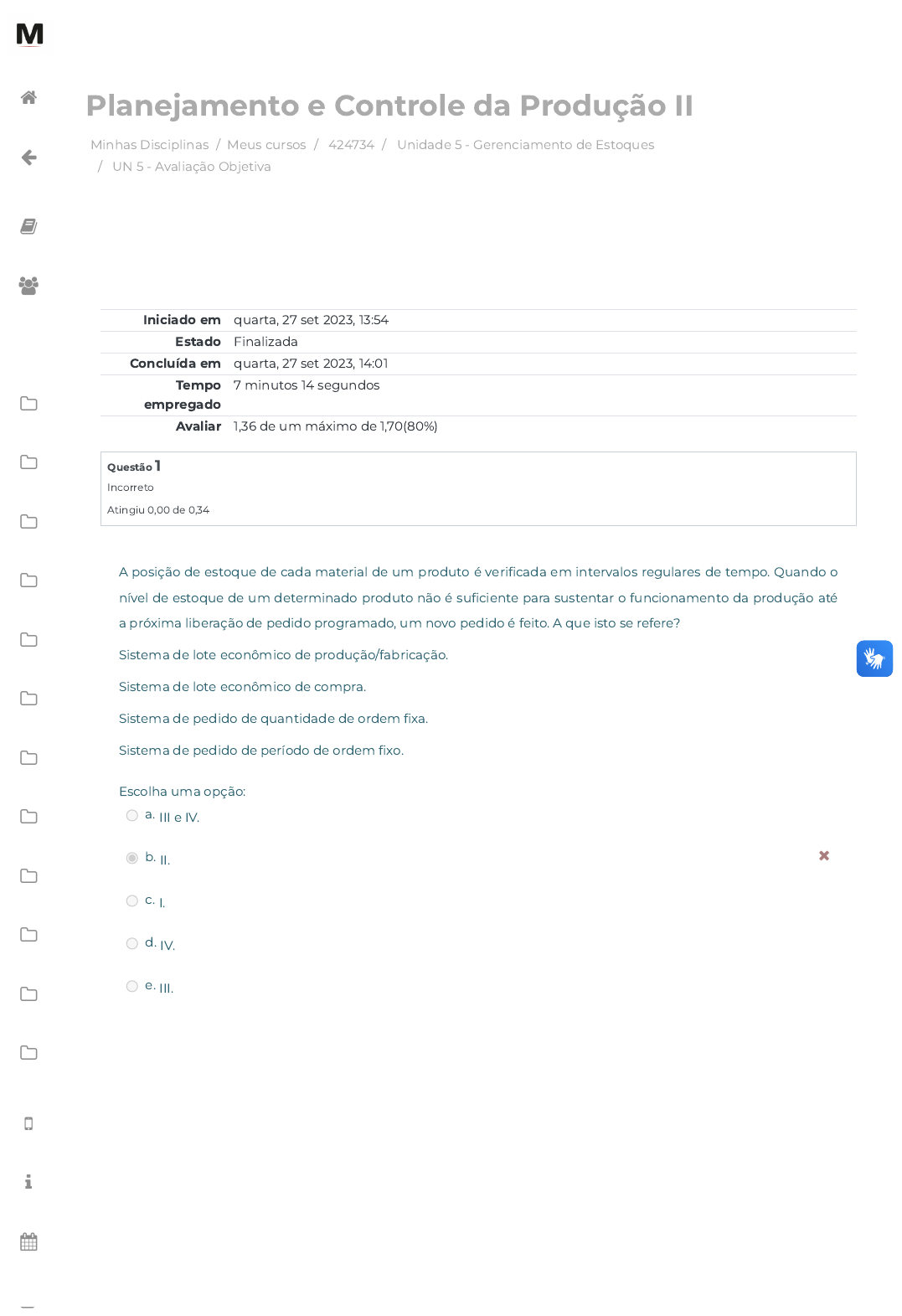 27/09/2023, 14:02 UN 5 - Avaliação Objetiva: Revisão da tentativa https://avap.multivix.edu.br/mod/quiz/review.php?attempt=3959668&cmid=1531916 1/5 Minhas Disciplinas / Meus cursos / 424734 / Unidade 5 - Gerenciamento de Estoques / UN 5 - Avaliação Objetiva Planejamento e Controle da Produção II Iniciado em quarta, 27 set 2023, 13:54 Estado Finalizada Concluída em quarta, 27 set 2023, 14:01 Tempo empregado 7 minutos 14 segundos Avaliar 1,36 de um máximo de 1,70(80%) Questão 1 Incorreto Atingiu 0,00 de 0,34 A posição de estoque de cada material de um produto é veri�cada em intervalos regulares de tempo. Quando o nível de estoque de um determinado produto não é su�ciente para sustentar o funcionamento da produção até a próxima liberação de pedido programado, um novo pedido é feito. A que isto se refere? Sistema de lote econômico de produção/fabricação. Sistema de lote econômico de compra. Sistema de pedido de quantidade de ordem �xa. Sistema de pedido de período de ordem �xo. Escolha uma opção: a. III e IV. b. II. c. I. d. IV. e. III. https://avap.multivix.edu.br/my/ https://avap.multivix.edu.br/course/view.php?id=23957 https://avap.multivix.edu.br/course/view.php?id=23957§ion=6 https://avap.multivix.edu.br/mod/quiz/view.php?id=1531916 https://avap.multivix.edu.br/my/ https://avap.multivix.edu.br/course/view.php?id=23957 https://avap.multivix.edu.br/user/index.php?id=23957 https://avap.multivix.edu.br/course/view.php?id=23957§ion=1 https://avap.multivix.edu.br/course/view.php?id=23957§ion=2 https://avap.multivix.edu.br/course/view.php?id=23957§ion=3 https://avap.multivix.edu.br/course/view.php?id=23957§ion=4 https://avap.multivix.edu.br/course/view.php?id=23957§ion=5 https://avap.multivix.edu.br/course/view.php?id=23957§ion=6 https://avap.multivix.edu.br/course/view.php?id=23957§ion=7 https://avap.multivix.edu.br/course/view.php?id=23957§ion=8 https://avap.multivix.edu.br/course/view.php?id=23957§ion=9 https://avap.multivix.edu.br/course/view.php?id=23957§ion=10 https://avap.multivix.edu.br/course/view.php?id=23957§ion=11 https://avap.multivix.edu.br/course/view.php?id=23957§ion=12 https://avap.multivix.edu.br/hooks/portal/ https://avap.multivix.edu.br/mod/page/view.php?id=1252%2F%22%20target%3D%22_blank https://avap.multivix.edu.br/calendar/view.php/ https://avap.multivix.edu.br/local/staticpage/view.php?page=biblioteca https://avap.multivix.edu.br/ 27/09/2023, 14:02 UN 5 - Avaliação Objetiva: Revisão da tentativa https://avap.multivix.edu.br/mod/quiz/review.php?attempt=3959668&cmid=1531916 2/5 Questão 2 Correto Atingiu 0,34 de 0,34 O método de quantidade de pedidos �xos é um método que facilita uma quantidade predeterminada de um dado material a ser encomendado em um mesmo período. São vantagens deste método: Cada material pode ser adquirido na quantidade mais econômica. As pessoas de compras e controle de estoque automaticamente dão sua atenção aos itens que são necessários apenas quando são necessários. O sistema pressupõe uso estável e lead time de�nido. Quando estes mudam signi�cativamente, uma nova quantidade de pedido e um novo ponto de ordem devem ser corrigidos. O controle positivo pode ser facilmente tratado para manter o investimento em estoque no nível desejado, apenas calculando os valores máximos e mínimos predeterminados. É correto apenas o que se a�rma em: Escolha uma opção: a. II e IV. b. I, III e IV. c. I, II e IV. d. II, III e IV. e. I, II e III. https://avap.multivix.edu.br/my/ https://avap.multivix.edu.br/course/view.php?id=23957 https://avap.multivix.edu.br/user/index.php?id=23957 https://avap.multivix.edu.br/course/view.php?id=23957§ion=1 https://avap.multivix.edu.br/course/view.php?id=23957§ion=2 https://avap.multivix.edu.br/course/view.php?id=23957§ion=3 https://avap.multivix.edu.br/course/view.php?id=23957§ion=4 https://avap.multivix.edu.br/course/view.php?id=23957§ion=5 https://avap.multivix.edu.br/course/view.php?id=23957§ion=6 https://avap.multivix.edu.br/course/view.php?id=23957§ion=7 https://avap.multivix.edu.br/course/view.php?id=23957§ion=8 https://avap.multivix.edu.br/course/view.php?id=23957§ion=9 https://avap.multivix.edu.br/course/view.php?id=23957§ion=10 https://avap.multivix.edu.br/course/view.php?id=23957§ion=11 https://avap.multivix.edu.br/course/view.php?id=23957§ion=12 https://avap.multivix.edu.br/hooks/portal/ https://avap.multivix.edu.br/mod/page/view.php?id=1252%2F%22%20target%3D%22_blank https://avap.multivix.edu.br/calendar/view.php/ https://avap.multivix.edu.br/local/staticpage/view.php?page=biblioteca https://avap.multivix.edu.br/ 27/09/2023, 14:02 UN 5 - Avaliação Objetiva: Revisão da tentativa https://avap.multivix.edu.br/mod/quiz/review.php?attempt=3959668&cmid=1531916 3/5 Questão 3 Correto Atingiu 0,34 de 0,34 Quando a demanda por itens de estoque é consistente e os prazos de entrega são con�áveis, é mais fácil determinar os níveis de estoque de segurança, mas quando a demanda e a oferta �utuam, �ca muito mais difícil calcular o estoque de segurança com precisão. Muitas vezes, pode-se optar por usar fórmulas simples de estoque de segurança, que são insu�cientes para lidar com os desa�os de oferta e demanda que enfrentam. Uma forma de minimizar perdas �nanceiras é usando a identi�cação das causas e efeitos da variabilidade no estoque. Com base nas causas da variabilidade nos estoques: A causa temporal geralmente ocorre quando há uma variação entre oferta e demanda. A causa temporal ocorre pelo atraso da entrega do produto. A causa quantitativa geralmente ocorre quando há uma variação entre oferta e demanda. A causa quantitativa ocorre pelo atraso da entrega do produto. É correto o que se a�rma em: Escolha uma opção: a. IV, somente. b. III e IV. c. III, somente. d. II e III. e. I e IV. https://avap.multivix.edu.br/my/ https://avap.multivix.edu.br/course/view.php?id=23957 https://avap.multivix.edu