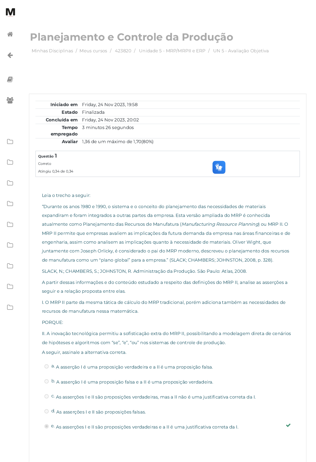 <p>24/11/2023, 20:04 UN 5 - Avaliação Objetiva: Revisão da tentativa</p><p>https://avap.multivix.edu.br/mod/quiz/review.php?attempt=4493610&cmid=1538374 1/5</p><p>Minhas Disciplinas / Meus cursos / 423820 / Unidade 5 - MRP/MRPII e ERP / UN 5 - Avaliação Objetiva</p><p>Planejamento e Controle da Produção</p><p>Iniciado em Friday, 24 Nov 2023, 19:58</p><p>Estado Finalizada</p><p>Concluída em Friday, 24 Nov 2023, 20:02</p><p>Tempo</p><p>empregado</p><p>3 minutos 26 segundos</p><p>Avaliar 1,36 de um máximo de 1,70(80%)</p><p>Questão 1</p><p>Correto</p><p>Atingiu 0,34 de 0,34</p><p>Leia o trecho a seguir:</p><p>“Durante os anos 1980 e 1990, o sistema e o conceito do planejamento das necessidades de materiais</p><p>expandiram e foram integrados a outras partes da empresa. Esta versão ampliada do MRP é conhecida</p><p>atualmente como Planejamento das Recursos de Manufatura (Manufacturing Resource Planning) ou MRP II. O</p><p>MRP II permite que empresas avaliem as implicações da futura demanda da empresa nas áreas �nanceiras e de</p><p>engenharia, assim como analisem as implicações quanto à necessidade de materiais. Oliver Wight, que</p><p>juntamente com Joseph Orlicky, é considerado o pai do MRP moderno, descreveu o planejamento dos recursos</p><p>de manufatura como um "plano global” para a empresa.” (SLACK; CHAMBERS; JOHNSTON, 2008, p. 328).</p><p>SLACK, N.; CHAMBERS, S.; JOHNSTON, R. Administração da Produção. São Paulo: Atlas, 2008.</p><p>A partir dessas informações e do conteúdo estudado a respeito das de�nições do MRP II, analise as asserções a</p><p>seguir e a relação proposta entre elas.</p><p>I. O MRP II parte da mesma tática de cálculo do MRP tradicional, porém adiciona também as necessidades de</p><p>recursos de manufatura nessa matemática.</p><p>PORQUE:</p><p>II. A inovação tecnológica permitiu a so�sticação extra do MRP II, possibilitando a modelagem direta de cenários</p><p>de hipóteses e algoritmos com “se”, “e”, “ou” nos sistemas de controle de produção.</p><p>A seguir, assinale a alternativa correta.</p><p>a. A asserção I é uma proposição verdadeira e a II é uma proposição falsa.</p><p>b. A asserção I é uma proposição falsa e a II é uma proposição verdadeira.</p><p>c. As asserções I e II são proposições verdadeiras, mas a II não é uma justi�cativa correta da I.</p><p>d. As asserções I e II são proposições falsas.</p><p>e. As asserções I e II são proposições verdadeiras e a II é uma justi�cativa correta da I. </p><p></p><p></p><p></p><p></p><p></p><p></p><p></p><p></p><p></p><p></p><p></p><p></p><p></p><p></p><p>https://avap.multivix.edu.br/my/</p><p>https://avap.multivix.edu.br/course/view.php?id=24054</p><p>https://avap.multivix.edu.br/course/view.php?id=24054§ion=6</p><p>https://avap.multivix.edu.br/mod/quiz/view.php?id=1538374</p><p>https://avap.multivix.edu.br/my/</p><p>https://avap.multivix.edu.br/course/view.php?id=24054</p><p>https://avap.multivix.edu.br/user/index.php?id=24054</p><p>https://avap.multivix.edu.br/course/view.php?id=24054§ion=1</p><p>https://avap.multivix.edu.br/course/view.php?id=24054§ion=2</p><p>https://avap.multivix.edu.br/course/view.php?id=24054§ion=3</p><p>https://avap.multivix.edu.br/course/view.php?id=24054§ion=4</p><p>https://avap.multivix.edu.br/course/view.php?id=24054§ion=5</p><p>https://avap.multivix.edu.br/course/view.php?id=24054§ion=6</p><p>https://avap.multivix.edu.br/course/view.php?id=24054§ion=7</p><p>https://avap.multivix.edu.br/course/view.php?id=24054§ion=8</p><p>https://avap.multivix.edu.br/course/view.php?id=24054§ion=9</p><p>https://avap.multivix.edu.br/course/view.php?id=24054§ion=10</p><p>https://avap.multivix.edu.br/</p><p>https://avap.multivix.edu.br/</p><p>https://avap.multivix.edu.br/</p><p>https://avap.multivix.edu.br/</p><p>https://avap.multivix.edu.br/</p><p>https://avap.multivix.edu.br/</p><p>24/11/2023, 20:04 UN 5 - Avaliação Objetiva: Revisão da tentativa</p><p>https://avap.multivix.edu.br/mod/quiz/review.php?attempt=4493610&cmid=1538374 2/5</p><p>Questão 2</p><p>Correto</p><p>Atingiu 0,34 de 0,34</p><p>Leia o trecho a seguir:</p><p>O Material Requirement Planning (MRP) faz a gestão da necessidade de materiais dentro de um processo de</p><p>fabricação. Esse conceito nasceu na década de 1960 e hoje é tratado como MRP I, ou seja, gestão da fabricação</p><p>com base nos recursos de materiais necessários para atender ao plano de produção. O MRP II é um conceito</p><p>estendido ao MRP I, que signi�ca “Manufacturing Resource Planning”, que, no português, seria algo como</p><p>planejamento dos recursos necessários para executar um plano mestre de produção. Estamos falando de</p><p>operadores, máquinas, linhas de montagens ou células de produção, em que os recursos são alocados por certo</p><p>período para realizar uma determinada operação fabril (SLACK; BRANDON; JOHNSTON, 2018).</p><p>SLACK, N.; BRANDON-JONES, A.; JOHNSTON, R. Administração da produção. 8. ed. São Paulo: Atlas, 2018.</p><p>A partir da leitura do fragmento exposto e considerando os conteúdos estudados na disciplina, analise as</p><p>a�rmativas a seguir sobre visão global do MRP.</p><p>I. A chamada Bill Of Materials (BOMs) é a lista de materiais, de responsabilidade da engenharia de produto.</p><p>II. O MRP é um sistema de controle de produção que melhora o nível de e�ciência e controle dos processos.</p><p>III. O MRP usa praticamente todas as informações da empresa em termos de materiais e mão de obra para gerar</p><p>a resposta industrial da empresa.</p><p>IV. O MRP é um software que ajuda no planejamento de demandas focado na resposta industrial.</p><p>Está correto apenas o que se a�rma em:</p><p>a. I e III.</p><p>b. I, II e III.</p><p>c. II e III.</p><p>d. I, II e IV. </p><p>e. III e IV.</p><p></p><p></p><p></p><p></p><p></p><p></p><p></p><p></p><p></p><p></p><p></p><p></p><p></p><p