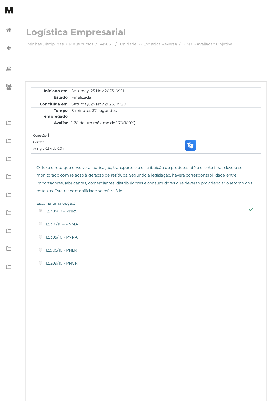 <p>25/11/2023, 09:22 UN 6 - Avaliação Objetiva: Revisão da tentativa</p><p>https://avap.multivix.edu.br/mod/quiz/review.php?attempt=4497668&cmid=1528593 1/3</p><p>Minhas Disciplinas / Meus cursos / 415856 / Unidade 6 - Logística Reversa / UN 6 - Avaliação Objetiva</p><p>Logística Empresarial</p><p>Iniciado em Saturday, 25 Nov 2023, 09:11</p><p>Estado Finalizada</p><p>Concluída em Saturday, 25 Nov 2023, 09:20</p><p>Tempo</p><p>empregado</p><p>8 minutos 37 segundos</p><p>Avaliar 1,70 de um máximo de 1,70(100%)</p><p>Questão 1</p><p>Correto</p><p>Atingiu 0,34 de 0,34</p><p>O �uxo direto que envolve a fabricação, transporte e a distribuição de produtos até o cliente �nal, deverá ser</p><p>monitorado com relação à geração de resíduos. Segundo a legislação, haverá corresponsabilidade entre</p><p>importadores, fabricantes, comerciantes, distribuidores e consumidores que deverão providenciar o retorno dos</p><p>resíduos. Esta responsabilidade se refere à lei</p><p>Escolha uma opção:</p><p>12.305/10 – PNRS </p><p>12.310/10 – PNMA</p><p>12.305/10 - PNRA</p><p>12.905/10 - PNLR</p><p>12.209/10 - PNCR</p><p></p><p></p><p></p><p></p><p></p><p></p><p></p><p></p><p></p><p></p><p></p><p></p><p></p><p></p><p>https://avap.multivix.edu.br/my/</p><p>https://avap.multivix.edu.br/course/view.php?id=23573</p><p>https://avap.multivix.edu.br/course/view.php?id=23573§ion=7</p><p>https://avap.multivix.edu.br/mod/quiz/view.php?id=1528593</p><p>https://avap.multivix.edu.br/my/</p><p>https://avap.multivix.edu.br/course/view.php?id=23573</p><p>https://avap.multivix.edu.br/user/index.php?id=23573</p><p>https://avap.multivix.edu.br/course/view.php?id=23573§ion=1</p><p>https://avap.multivix.edu.br/course/view.php?id=23573§ion=2</p><p>https://avap.multivix.edu.br/course/view.php?id=23573§ion=3</p><p>https://avap.multivix.edu.br/course/view.php?id=23573§ion=4</p><p>https://avap.multivix.edu.br/course/view.php?id=23573§ion=5</p><p>https://avap.multivix.edu.br/course/view.php?id=23573§ion=6</p><p>https://avap.multivix.edu.br/course/view.php?id=23573§ion=7</p><p>https://avap.multivix.edu.br/course/view.php?id=23573§ion=8</p><p>https://avap.multivix.edu.br/course/view.php?id=23573§ion=9</p><p>https://avap.multivix.edu.br/course/view.php?id=23573§ion=10</p><p>https://avap.multivix.edu.br/</p><p>https://avap.multivix.edu.br/</p><p>https://avap.multivix.edu.br/</p><p>https://avap.multivix.edu.br/</p><p>25/11/2023, 09:22 UN 6 - Avaliação Objetiva: Revisão da tentativa</p><p>https://avap.multivix.edu.br/mod/quiz/review.php?attempt=4497668&cmid=1528593 2/3</p><p>Questão 2</p><p>Correto</p><p>Atingiu 0,34 de 0,34</p><p>Questão 3</p><p>Correto</p><p>Atingiu 0,34 de 0,34</p><p>Atualmente, os ativos intangíveis podem ser medidos pelos valores de ações de empresas sustentáveis, que</p><p>alcançam 12% em comparação com empresas que não possuem esse valor intangível, segundo o DS 400 – Dow</p><p>Jones Sustainability e S&P 500 (índices de bolsa de valores com empresas sustentáveis e convencionais,</p><p>respectivamente). O ativo intangível nada mais é que:</p><p>Escolha uma opção:</p><p>a oferta de serviços de empresas que divulgam projetos para o meio ambiente</p><p>os direitos autorais relativos a temas de sustentabilidade</p><p>um benefício para a sociedade, reduzindo o impacto negativo para o meio ambiente. </p><p>a venda de ações de empresas sustentáveis</p><p>empresas centenárias com programas de reciclagem de materiais</p><p>Os negócios sustentáveis exigem operações responsáveis em termos ambientais e sociais, sendo fundamental</p><p>na implementação das práticas de sustentabilidade na empresa. Podemos dizer que a empresa terá mais</p><p>abrangência e in�uência sustentável interna e externamente por meio do processo</p><p>Escolha uma opção:</p><p>de atendimento ao cliente.</p><p>de seleção de fornecedores.</p><p>da cadeia de suprimentos. </p><p>de produção.</p><p>de atuação no mercado internacional.</p><p></p><p></p><p></p><p></p><p></p><p></p><p></p><p></p><p></p><p></p><p></p><p></p><p></p><p></p><p>https://avap.multivix.edu.br/my/</p><p>https://avap.multivix.edu.br/course/view.php?id=23573</p><p>https://avap.multivix.edu.br/user/index.php?id=23573</p><p>https://avap.multivix.edu.br/course/view.php?id=23573§ion=1</p><p>https://avap.multivix.edu.br/course/view.php?id=23573§ion=2</p><p>https://avap.multivix.edu.br/course/view.php?id=23573§ion=3</p><p>https://avap.multivix.edu.br/course/view.php?id=23573§ion=4</p><p>https://avap.multivix.edu.br/course/view.php?id=23573§ion=5</p><p>https://avap.multivix.edu.br/course/view.php?id=23573§ion=6</p><p>https://avap.multivix.edu.br/course/view.php?id=23573§ion=7</p><p>https://avap.multivix.edu.br/course/view.php?id=23573§ion=8</p><p>https://avap.multivix.edu.br/course/view.php?id=23573§ion=9</p><p>https://avap.multivix.edu.br/course/view.php?id=23573§ion=10</p><p>https://avap.multivix.edu.br/</p><p>https://avap.multivix.edu.br/</p><p>https://avap.multivix.edu.br/</p><p>https://avap.multivix.edu.br/</p><p>25/11/2023, 09:22 UN 6 - Avaliação Objetiva: Revisão da tentativa</p><p>https://avap.multivix.edu.br/mod/quiz/review.php?attempt=4497668&cmid=1528593 3/3</p><p>Questão 4</p><p>Correto</p><p>Atingiu 0,34 de 0,34</p><p>Questão 5</p><p>Correto</p><p>Atingiu 0,34 de 0,34</p><p>John Elkington, além de escritor, é fundador e diretor da consultoria SustainAbility, uma das maiores referências</p><p>empresariais atuais de negócios sustentáveis. Ele é criador do conceito Triple botton line, também chamado de</p><p>Tripé da Sustentabilidade no Brasil. O tripé da sustentabilidade é baseado nos princípios de</p><p>Escolha uma opção:</p><p>investimento, lucro e planeta.</p><p>fabricação, transporte e sustentabilidade</p><p>pessoas, planeta e lucro </p><p>planeta, fabricação e pessoas</p><p>Produção, lucro e atendimento</p><p>As cadeias de suprimentos devem ter ações ambienta