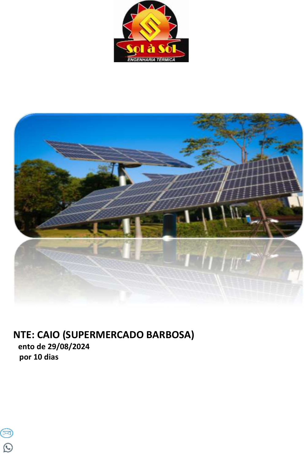 <p>PROJETO DE INSTALAÇÃO - ENERGIA SOLAR</p><p>FOTOVOLTAICA</p><p>CLIENTE: CAIO (SUPERMERCADO BARBOSA)</p><p>Orçamento de 29/08/2024</p><p>Válido por 10 dias</p><p>Eng.° Anderson Thiago Pontes Stefanelli</p><p>Comercial: Renato / Miguel</p><p>contato@solasol.com.br</p><p>(14) 99156-5386 / (14) 99681-7293</p><p>1. APRESENTAÇÃO</p><p>Energia solar é um ótimo investimento, pois valoriza o imóvel</p><p>proporciona uma economia significativa na</p><p>sua conta de energia elétrica.</p><p>Além disso, o sistema fotovoltaico se baseia em um</p><p>modelo de crescimento sustentável, pois contribui para</p><p>mitigação do aquecimento global por meio da geração</p><p>de energia limpa e renovável, que busca reduzir a emissão de</p><p>gases do efeito estufa.</p><p>Só quem é líder pode oferecer ao cliente tantos</p><p>referenciais:</p><p>• soluções completas e personalizadas com o menor custo</p><p>• excelência em serviço;</p><p>• alta tecnologia para projetos de todos os portes.</p><p>2. QUEM SOMOS</p><p>A Sol a Sol é pioneira no setor de energia fotovoltaica.</p><p>Desde 2009, oferece soluções completas e personalizadas em</p><p>produtos e serviços de alta tecnologia, para projetos de</p><p>energia solar e térmica de todos os portes.</p><p>A empresa já conquistou uma parcela significativa do</p><p>mercado, pois só quem é líder pode oferecer ao cliente tantos</p><p>diferenciais:</p><p> Rápida instalação;</p><p> Rápido retorno do investimento aplicado no sistema</p><p>solar fotovoltaico;</p><p> Profissionais formados e certificados, com</p><p>cumprimento às normas técnicas (ABNT) e normas de segurança (NR);</p><p> Projetos instalados em segmentos residenciais, comerciais e industriais, em 8 estados</p><p>brasileiros e 41 cidades;</p><p> Proporcionando uma redução satisfatória no valor da conta de energia elétrica;</p><p> Realizando a satisfação de conforto térmico e economia em mais de 1.200 clientes, 60.000</p><p>metros de coletores instalados.</p><p>A empresa possui um serviço de atendimento qualificado, com atendentes que estão disponíveis</p><p>para receber informações e sugestões, a fim de solucionar possíveis falhas.</p><p>A equipe de engenharia garante qualidade superior em projetos de todos os portes e um ótimo</p><p>custo-benefício. Cada projeto Sol à Sol é personalizado conforme as necessidades de cada cliente,</p><p>sempre pensando no máximo de conforto e economia.</p><p>3. PRINCIPAIS FORNECEDORES</p><p>MÓDULOS SOLARES</p><p>Os fabricantes dos módulos solares são referências no mercado nacional e internacional. Possuem alta</p><p>qualidade, tecnologia, confiabilidade e são certificados pelo INMETRO com selo nota “A”.</p><p>Garantia:</p><p> 25 anos de até 80% da eficiência.</p><p>3.2 INVERSORES</p><p>As marcas utilizadas pela empresa são líderes em tecnologia no mercado, seus equipamentos são testados</p><p>e aprovados, para aplicação no comércio brasileiro.</p><p>1. MÓDULO SOLAR</p><p>O MÓDULO SOLAR (também conhecido como placa solar/fotovoltaica) é</p><p>composto por vários conjuntos de células fotovoltaicas, capazes de absorver a</p><p>energia solar, captando a luz do sol incidente e transformando essa energia</p><p>solar em energia elétrica.</p><p>2. INVERSOR SOLAR</p><p>A corrente elétrica gerada pelos módulos solares é do tipo: corrente contínua</p><p>(sinal elétrico CC). O INVERSOR SOLAR converte essa corrente elétrica</p><p>contínua (sinal elétrico CC) em corrente elétrica alternada (sinal elétrico CA),</p><p>permitindo o uso dessa energia por qualquer aparelho ligado à rede elétrica.</p><p>3. QUADRO DE LUZ</p><p>A energia elétrica convertida, sai do inversor solar e vai para o QUADRO DE</p><p>LUZ, onde é distribuída para ser utilizada, de forma totalmente segura.</p><p>4. RELÓGIO DE LUZ (BI-DIRECIONAL)</p><p>O excedente da energia elétrica produzida pelo sistema solar fotovoltaico é</p><p>enviado para a rede elétrica pública. O novo RELÓGIO DE LUZ (BI-</p><p>DIRECIONAL) irá contabilizar este excedente produzido e em troca,</p><p>disponibilizara créditos para consumo de energia elétrica. Dessa forma,</p><p>quando necessário utilizar a energia elétrica da rede pública, essa energia</p><p>extra que você gerou será deduzida.</p><p>Garantia:</p><p> Até 12 Anos (Podendo variar de acordo com a marca)</p><p>4. FUNCIONAMENTO DO SISTEMA</p><p>5.PROJETOS REALIZADOS</p><p>HVA – JAU/SP AUTO POSTO CONTINENTAL, JAU/SP</p><p>PADARIA SANTO ANTONIO – JAU JURITI FUMOS – JAU/SP</p><p>FRIGO CENTRAL – SP SUPERMERCADO LEANDRIN – JAU/SP</p><p>SUPERMERCADO SALINAS – IBITINGA/SP ACADEMIA MARATHON – BAURU/SP</p><p>FRIGO CENTRAL – SP AUTO POSTO ANA PREMIER – BAURU/SP</p><p>AUTO POSTO ALAMEDA – BAURU/SP CEMITERIO JARDIN DOS LIRIOS – BAURU/SP</p><p>CDU UNIMED – BAURU/SP CENTRO DE CIRURGIA PLÁSTICA - JAÚ/SP</p><p>8</p><p>6.DIMENSIONAMENTO DO SISTEMA – UC</p><p>O dimensionamento do sistema foi baseado na área disponível para instalação dos</p><p>módulos fotovoltaicos e na previsão do consumo de energia.</p><p>5.1 SISTEMA DE GERAÇÃO FOTOVOLTAICA DE ENERGIA ELÉTRICA</p><p>Potência do sistema: 68,75 kWp Média de geração mensal: 8.250 kWh</p><p>Modelo dos módulos: BYD /TRINASOLAR /</p><p>SUNNOVA/GCL/CANADIAN</p><p>Estruturas de fixação: Alumínio</p><p>Modelo do inversor:</p><p>FRONIUS/SAJ/HOPEWIND/GOODWE/</p><p>DEYE/SOLIS/KSTAR</p><p>Quantidade de inversores: 01 unidade</p><p>125 MÓDULOS DE 550W</p><p>Angulação do sistema 22°</p><p>Geração de energia</p><p>A geração de energia elétrica deste dimensionamento para a região da cidade, baseados</p><p>em dados do CRESESB é a seguinte:</p><p> Geração média mensal de: 8.250 kWh;</p><p>8.250 kWh</p><p>4.125 kWh</p><p>9</p><p>7.ORÇAMENTO PARA O SISTEMA DIMENSIONADO</p><p>Orçamento para o sistema de geração fotovoltaica de energia elétrica apresentado,</p><p>com a média de geração mensal de 8.25