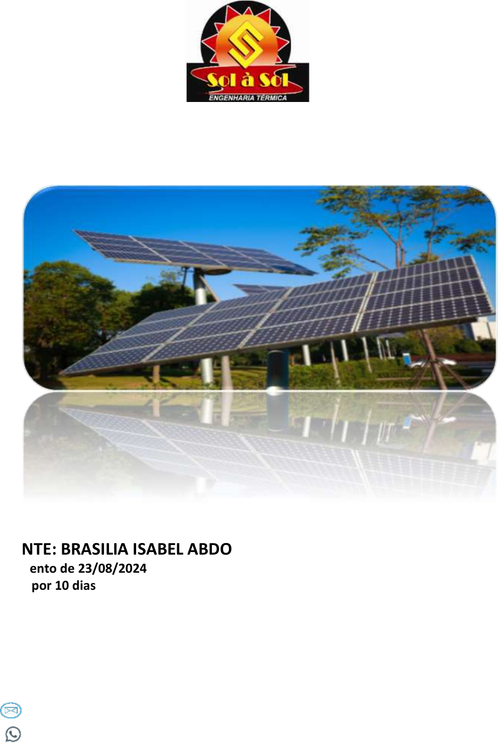 <p>PROJETO DE INSTALAÇÃO - ENERGIA SOLAR</p><p>FOTOVOLTAICA</p><p>CLIENTE: BRASILIA ISABEL ABDO</p><p>Orçamento de 23/08/2024</p><p>Válido por 10 dias</p><p>Eng.° Anderson Thiago Pontes Stefanelli</p><p>Comercial: Renato Camargo / Miguel</p><p>contato@solasol.com.br</p><p>(14) 99156-5386 / (14) 99681-7293</p><p>1. APRESENTAÇÃO</p><p>Energia solar é um ótimo investimento, pois valoriza o imóvel</p><p>proporciona uma economia significativa na</p><p>sua conta de energia elétrica.</p><p>Além disso, o sistema fotovoltaico se baseia em um</p><p>modelo de crescimento sustentável, pois contribui para</p><p>mitigação do aquecimento global por meio da geração</p><p>de energia limpa e renovável, que busca reduzir a emissão de</p><p>gases do efeito estufa.</p><p>Só quem é líder pode oferecer ao cliente tantos</p><p>referenciais:</p><p>• soluções completas e personalizadas com o menor custo</p><p>• excelência em serviço;</p><p>• alta tecnologia para projetos de todos os portes.</p><p>2. QUEM SOMOS</p><p>A Sol a Sol é pioneira no setor de energia fotovoltaica.</p><p>Desde 2009, oferece soluções completas e personalizadas em</p><p>produtos e serviços de alta tecnologia, para projetos de</p><p>energia solar e térmica de todos os portes.</p><p>A empresa já conquistou uma parcela significativa do</p><p>mercado, pois só quem é líder pode oferecer ao cliente tantos</p><p>diferenciais:</p><p> Rápida instalação;</p><p> Rápido retorno do investimento aplicado no sistema</p><p>solar fotovoltaico;</p><p> Profissionais formados e certificados, com</p><p>cumprimento às normas técnicas (ABNT) e normas de segurança (NR);</p><p> Projetos instalados em segmentos residenciais, comerciais e industriais, em 8 estados</p><p>brasileiros e 41 cidades;</p><p> Proporcionando uma redução satisfatória no valor da conta de energia elétrica;</p><p> Realizando a satisfação de conforto térmico e economia em mais de 1.200 clientes, 60.000</p><p>metros de coletores instalados.</p><p>A empresa possui um serviço de atendimento qualificado, com atendentes que estão disponíveis</p><p>para receber informações e sugestões, a fim de solucionar possíveis falhas.</p><p>A equipe de engenharia garante qualidade superior em projetos de todos os portes e um ótimo</p><p>custo-benefício. Cada projeto Sol à Sol é personalizado conforme as necessidades de cada cliente,</p><p>sempre pensando no máximo de conforto e economia.</p><p>3. PRINCIPAIS FORNECEDORES</p><p>MÓDULOS SOLARES</p><p>Os fabricantes dos módulos solares são referências no mercado nacional e internacional. Possuem alta</p><p>qualidade, tecnologia, confiabilidade e são certificados pelo INMETRO com selo nota “A”.</p><p>Garantia:</p><p> 25 anos de até 80% da eficiência.</p><p>3.2 INVERSORES</p><p>As marcas utilizadas pela empresa são líderes em tecnologia no mercado, seus equipamentos são testados</p><p>e aprovados, para aplicação no comércio brasileiro.</p><p>1. MÓDULO SOLAR</p><p>O MÓDULO SOLAR (também conhecido como placa solar/fotovoltaica) é</p><p>composto por vários conjuntos de células fotovoltaicas, capazes de absorver a</p><p>energia solar, captando a luz do sol incidente e transformando essa energia</p><p>solar em energia elétrica.</p><p>2. INVERSOR SOLAR</p><p>A corrente elétrica gerada pelos módulos solares é do tipo: corrente contínua</p><p>(sinal elétrico CC). O INVERSOR SOLAR converte essa corrente elétrica</p><p>contínua (sinal elétrico CC) em corrente elétrica alternada (sinal elétrico CA),</p><p>permitindo o uso dessa energia por qualquer aparelho ligado à rede elétrica.</p><p>3. QUADRO DE LUZ</p><p>A energia elétrica convertida, sai do inversor solar e vai para o QUADRO DE</p><p>LUZ, onde é distribuída para ser utilizada, de forma totalmente segura.</p><p>4. RELÓGIO DE LUZ (BI-DIRECIONAL)</p><p>O excedente da energia elétrica produzida pelo sistema solar fotovoltaico é</p><p>enviado para a rede elétrica pública. O novo RELÓGIO DE LUZ (BI-</p><p>DIRECIONAL) irá contabilizar este excedente produzido e em troca,</p><p>disponibilizara créditos para consumo de energia elétrica. Dessa forma,</p><p>quando necessário utilizar a energia elétrica da rede pública, essa energia</p><p>extra que você gerou será deduzida.</p><p>Garantia:</p><p> Até 12 Anos (Podendo variar de acordo com a marca)</p><p>4. FUNCIONAMENTO DO SISTEMA</p><p>5.PROJETOS REALIZADOS</p><p>HVA – JAU/SP AUTO POSTO CONTINENTAL, JAU/SP</p><p>PADARIA SANTO ANTONIO – JAU JURITI FUMOS – JAU/SP</p><p>FRIGO CENTRAL – SP SUPERMERCADO LEANDRIN – JAU/SP</p><p>SUPERMERCADO SALINAS – IBITINGA/SP ACADEMIA MARATHON – BAURU/SP</p><p>FRIGO CENTRAL – SP AUTO POSTO ANA PREMIER – BAURU/SP</p><p>AUTO POSTO ALAMEDA – BAURU/SP CEMITERIO JARDIN DOS LIRIOS – BAURU/SP</p><p>CDU UNIMED – BAURU/SP CENTRO DE CIRURGIA PLÁSTICA - JAÚ/SP</p><p>8</p><p>6.DIMENSIONAMENTO DO SISTEMA – UC</p><p>O dimensionamento do sistema foi baseado na área disponível para instalação dos</p><p>módulos fotovoltaicos e na previsão do consumo de energia.</p><p>5.1 SISTEMA DE GERAÇÃO FOTOVOLTAICA DE ENERGIA ELÉTRICA</p><p>Potência do sistema: 3,3 kWp Média de geração mensal: 396 kWh</p><p>Modelo dos módulos: BYD /TRINASOLAR /</p><p>SUNNOVA/GCL/CANADIAN</p><p>Estruturas de fixação: Alumínio</p><p>Modelo do inversor:</p><p>FRONIUS/SAJ/HOPEWIND/GOODWE/</p><p>DEYE/SOLIS/KSTAR</p><p>Quantidade de inversores: 01 unidade</p><p>06 MÓDULOS DE 550W</p><p>Angulação do sistema 22°</p><p>Geração de energia</p><p>A geração de energia elétrica deste dimensionamento para a região da cidade, baseados</p><p>em dados do CRESESB é a seguinte:</p><p> Geração média mensal de: 396 kWh;</p><p>396 kWh</p><p>198 kWh</p><p>9</p><p>7.ORÇAMENTO PARA O SISTEMA DIMENSIONADO</p><p>Orçamento para o sistema de geração fotovoltaica de energia elétrica apresentado,</p><p>com a média de geração mensal de 396 kWh.</p><p