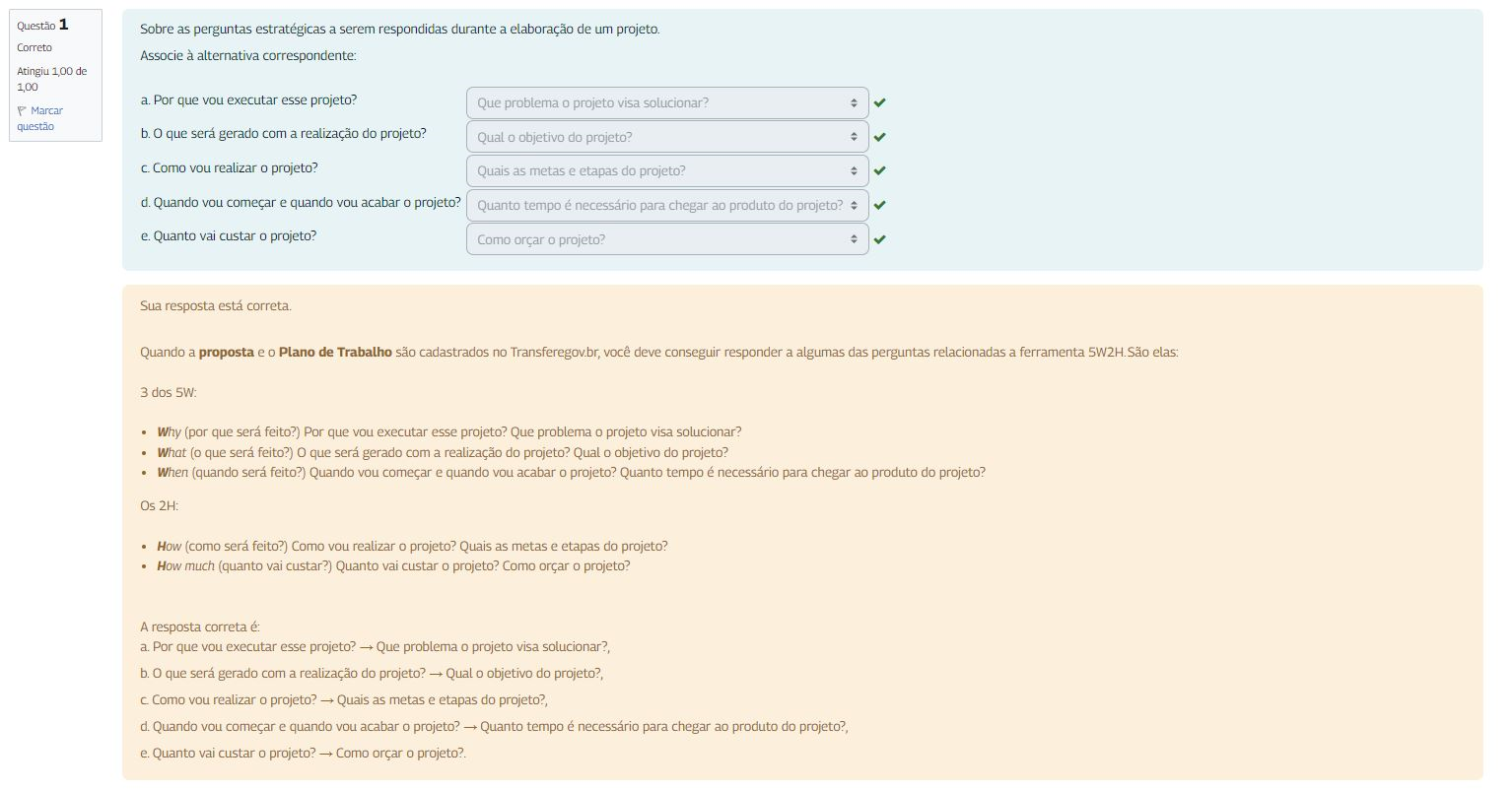 <p>Questão 1 Sobre as perguntas estratégicas a serem respondidas durante a elaboração de um projeto. Correto Associe à alternativa correspondente: de 1,00 a. Por que executar esse projeto? Que problema projeto visa solucionar? Marcar questão que será gerado com a realização do projeto? Qual objetivo do projeto? Como you realizar projeto? Quais as metas e etapas do projeto? d. Quando começar e quando you acabar o projeto? Quanto tempo é necessário para chegar ao produto do projeto? e Quanto vai custar projeto? Como orçar projeto? : Sua resposta está correta. Quando a proposta e o Plano de Trabalho são cadastrados no você deve conseguir responder a algumas das perguntas relacionadas a ferramenta 5W2H.São 3 dos 5W Why (por que será feito?) Por que executar esse projeto? Que problema projeto visa solucionar? What (o que será feito?) que será gerado com a realização do projeto? Qual objetivo do projeto? When (quando será feito?) Quando começar e quando acabar projeto? Quanto tempo é necessário para chegar ao produto do projeto? Os 2H: How (como será feito?) Como realizar projeto? Quais as metas e etapas do projeto? How much (quanto vai custar?) Quanto vai custar projeto? Como orçar projeto? A resposta correta é a. Por que executar esse projeto? Que problema projeto visa solucionar? b. o que será gerado com a realização do projeto? Qual objetivo do projeto? C Como realizar projeto? - Quais as metas e etapas do projeto? Quando começar e quando acabar projeto? Quanto tempo é necessário para chegar ao produto do Quanto vai custar projeto? Como orçar projeto?</p>