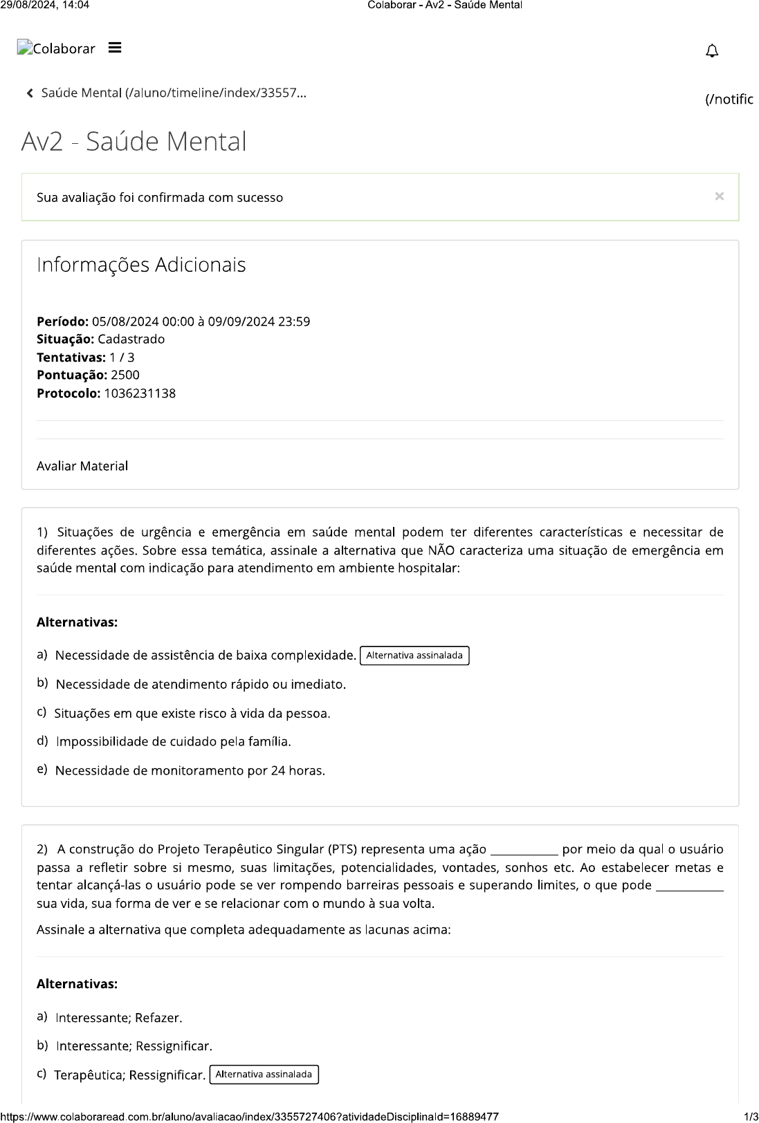 <p>29/08/2024, 14:04 Colaborar - Av2 Saúde Mental Colaborar = < Saúde Mental (/notific Av2 - Saúde Mental Sua avaliação foi confirmada com sucesso Informações Adicionais Período: 05/08/2024 00:00 à 09/09/2024 23:59 Situação: Cadastrado Tentativas: 1/3 Pontuação: 2500 Protocolo: 1036231138 Material 1) Situações de urgência e emergência em saúde mental podem ter diferentes características e necessitar de diferentes ações. Sobre essa temática, assinale a alternativa que NÃO caracteriza uma situação de emergência em saúde mental com indicação para atendimento em ambiente hospitalar: Alternativas: a) Necessidade de assistência de baixa complexidade. Alternativa assinalada b) Necessidade de atendimento rápido ou imediato. c) Situações em que existe risco à vida da pessoa. d) Impossibilidade de cuidado pela família. e) Necessidade de monitoramento por 24 horas. 2) A construção do Projeto Terapêutico Singular (PTS) representa uma ação por meio da qual o usuário passa a refletir sobre si mesmo, suas limitações, potencialidades, vontades, sonhos etc. Ao estabelecer metas e tentar alcançá-las o usuário pode se ver rompendo barreiras pessoais e superando limites, o que pode sua vida, sua forma de ver e se relacionar com o mundo à sua volta. Assinale a alternativa que completa adequadamente as lacunas acima: Alternativas: a) Interessante; Refazer. b) Interessante; Ressignificar. c) Terapêutica; Ressignificar. Alternativa assinalada 1/3</p><p>29/08/2024, 14:04 Colaborar - Av2 Saúde Mental d) Interessante; Mudar. e) Terapêutica; Refazer. 3) Um dos diagnósticos mais comuns na infância é o Neste transtorno pode ser observado alterações na atenção e/ou no comportamento, produzindo significativo prejuízo social à criança. Importante registrar que os sintomas devem estar presentes antes dos 12 anos de idade, segundo critérios diagnósticos do DSM-5. Assinale a resposta correta: Alternativas: a) Transtorno de déficit de atenção. b) Transtorno depressivo. c) Transtorno de conduta. d) Transtorno de déficit de atenção e hiperatividade. Alternativa assinalada e) Transtorno da conduta e da hiperatividade. 4) Quando a contenção física é necessária, deve-se: Manter a região de acesso venoso livre nos membros superiores. Monitorar constantemente o nível de consciência da pessoa em contenção. Sempre administrar medicação de efeito sedativo. Manter decúbito dorsal e cabeceira abaixada. Manter a pessoa em contenção até que se torne cooperativa. Assinale a alternativa que contenha a sequência correta: Alternativas: a) Alternativa assinalada 5) O uso excessivo de substâncias, tanto legais quanto ilegais, tem mostrado um aumento contínuo, influenciado principalmente pelo estilo de vida atual. A respeito das questões relacionadas a esse uso excessivo, analise as afirmações a seguir e marque com V (verdadeiro) ou F (falso). O uso de substâncias aparece como uma fuga em um "espaço" sem frustrações, limites, dor ou ansiedade. O uso de substâncias é visto como um meio para alcançar prazer instantâneo. O uso de substâncias proporciona uma ilusão de controle total ao usuário, que pensa que jamais se tornará dependente. Assinale a alternativa que mostra a sequência correta: 2/3</p><p>29/08/2024, 14:04 Colaborar - Av2 - Saúde Mental Alternativas: a) V-V-V. Alternativa assinalada b) F-V-F. c) V-F-V. d) F-V-V. e) 3/3</p>