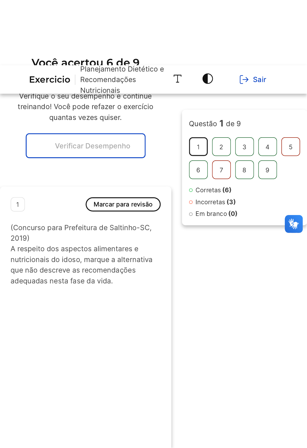 <p>Você acertou 6 de 9</p><p>questões</p><p>Verifique o seu desempenho e continue</p><p>treinando! Você pode refazer o exercício</p><p>quantas vezes quiser.</p><p>Verificar Desempenho</p><p>1 Marcar para revisão</p><p>�Concurso para Prefeitura de Saltinho-SC,</p><p>2019�</p><p>A respeito dos aspectos alimentares e</p><p>nutricionais do idoso, marque a alternativa</p><p>que não descreve as recomendações</p><p>adequadas nesta fase da vida.</p><p>Questão 1 de 9</p><p>Corretas �6�</p><p>Incorretas �3�</p><p>Em branco �0�</p><p>1 2 3 4 5</p><p>6 7 8 9</p><p>Exercicio</p><p>Planejamento Dietético e</p><p>Recomendações</p><p>Nutricionais</p><p>Sair</p><p>A</p><p>B</p><p>C</p><p>Sugere-se o consumo,</p><p>aproximado, de 0,4</p><p>g/kg/peso/refeição de proteína de</p><p>alto valor biológico (rica em</p><p>leucina) distribuídas em no mínimo</p><p>3 refeições/dia para melhorar o</p><p>estímulo à síntese proteica</p><p>muscular.</p><p>Suplementos proteicos não devem</p><p>ser recomendados, mesmo quando</p><p>o idoso apresentar dificuldades na</p><p>ingestão de alimentos sólidos e</p><p>ingestão alimentar insatisfatória,</p><p>visto que os últimos estudos não</p><p>apresentaram ganhos em relação à</p><p>massa e à força muscular.</p><p>As necessidades de carboidratos e</p><p>lipídios não são alteradas com a</p><p>idade, devendo seguir as</p><p>recomendações estabelecidas</p><p>pelas DRI e ficar atento com a</p><p>qualidade dos alimentos que são</p><p>fontes desses nutrientes.</p><p>D</p><p>E</p><p>A RDA da vitamina D aumenta para</p><p>idosos de ambos os sexos com a</p><p>idade superior a 70 anos.</p><p>Para melhorar a aceitação</p><p>alimentar do idoso, é relevante</p><p>estimular a realização das</p><p>refeições em local agradável e de</p><p>preferência em companhia,</p><p>estando atento à apresentação do</p><p>prato e à temperatura de consumo</p><p>dos alimentos.</p><p>Resposta incorreta</p><p>Opa! A alternativa correta é a</p><p>letra B. Confira o gabarito</p><p>comentado!</p><p>Gabarito Comentado</p><p>A alternativa B é incorreta porque, na</p><p>verdade, o uso de suplementos</p><p>proteicos pode ser benéfico para</p><p>idosos que têm dificuldade em</p><p>consumir alimentos sólidos ou que não</p><p>conseguem atingir suas necessidades</p><p>nutricionais apenas com a dieta. Isso</p><p>pode ocorrer por diversas razões, como</p><p>a anorexia associada ao</p><p>envelhecimento ou a perda sensorial</p><p>causada por medicamentos. Portanto,</p><p>em tais cenários, os suplementos</p><p>nutricionais, que podem ser</p><p>hipercalóricos, hiperproteicos ou</p><p>multivitamínicos, podem ser uma</p><p>ferramenta útil para garantir uma oferta</p><p>nutricional qualitativa.</p><p>A</p><p>B</p><p>C</p><p>D</p><p>E</p><p>2 Marcar para revisão</p><p>�VUNESP, 2015 � adaptada)</p><p>Na prescrição da alimentação do idoso,</p><p>devem-se levar em consideração os</p><p>minerais de maior importância. Um destes</p><p>minerais é o cálcio.</p><p>Marque a alternativa que apresenta outro</p><p>mineral de importância para o organismo</p><p>humano:</p><p>Zinco.</p><p>Sódio.</p><p>Iodo.</p><p>Ferro.</p><p>Magnésio.</p><p>Resposta correta</p><p>Parabéns, você selecionou a</p><p>alternativa correta. Confira o</p><p>gabarito comentado!</p><p>Gabarito Comentado</p><p>Embora a biodisponibilidade de todos</p><p>os micronutrientes mencionados seja</p><p>reduzida, diversos tipos de anemia são</p><p>comumente observados em idosos,</p><p>com destaque para a anemia ferropriva.</p><p>Esta condição é um fator importante</p><p>A</p><p>B</p><p>C</p><p>que aumenta a morbidade e</p><p>mortalidade neste ciclo da vida.</p><p>Portanto, o ferro é um mineral de</p><p>grande importância para o organismo</p><p>humano, especialmente para os idosos,</p><p>pois ajuda a prevenir a anemia e</p><p>contribui para o bom funcionamento do</p><p>organismo.</p><p>3 Marcar para revisão</p><p>�Concurso para Prefeitura de Ervália-MG,</p><p>2019�</p><p>Ao planejar um cardápio com 1 800 kcal</p><p>para um indivíduo de 65 anos de idade,</p><p>eutrófico, com 90 kg e 1,85 m, deve-se</p><p>considerar a distribuição calórica de 20% de</p><p>proteína, 50% de carboidratos e 30% de</p><p>lipídios.</p><p>Assinale a alternativa que apresenta a</p><p>quantidade em gramas de proteínas,</p><p>carboidratos e lipídios, respectivamente,</p><p>desse cardápio.</p><p>40 g, 125 g e 70 g.</p><p>60 g, 150 g e 90 g.</p><p>90 g, 225 g e 60 g.</p><p>D</p><p>E</p><p>125 g, 60 g e 80 g.</p><p>150g, 90g e 120g.</p><p>Resposta correta</p><p>Parabéns, você selecionou a</p><p>alternativa correta. Confira o</p><p>gabarito comentado!</p><p>Gabarito Comentado</p><p>A questão envolve o cálculo da</p><p>quantidade de macronutrientes</p><p>(proteínas, carboidratos e lipídios) em</p><p>um cardápio de 1800 kcal,</p><p>considerando as proporções de 20%,</p><p>50% e 30%, respectivamente. Para</p><p>calcular a quantidade em gramas, é</p><p>necessário saber que cada grama de</p><p>proteína e carboidrato fornece 4 kcal,</p><p>enquanto cada grama de lipídio fornece</p><p>9 kcal. Assim, temos: para as proteínas,</p><p>20% de 1800 kcal resulta em 360 kcal,</p><p>que dividido por 4 kcal/g, resulta em 90</p><p>g; para os carboidratos, 50% de 1800</p><p>kcal resulta em 900 kcal, que dividido</p><p>por 4 kcal/g, resulta em 225 g; e para</p><p>os lipídios, 30% de 1800 kcal resulta em</p><p>540 kcal, que dividido por 9 kcal/g,</p><p>resulta em 60 g. Portanto, a alternativa</p><p>correta é a C� 90 g de proteínas, 225 g</p><p>de carboidratos e 60 g de lipídios.</p><p>4 Marcar para revisão</p><p>A</p><p>B</p><p>C</p><p>D</p><p>E</p><p>�Concurso IFTO, 2016 � adaptada)</p><p>O envelhecimento é um processo natural</p><p>com diversas alterações clínicas,</p><p>antropométricas e bioquímicas.</p><p>Em relação ao planejamento dietético para o</p><p>grupo Idoso, assinale a alter