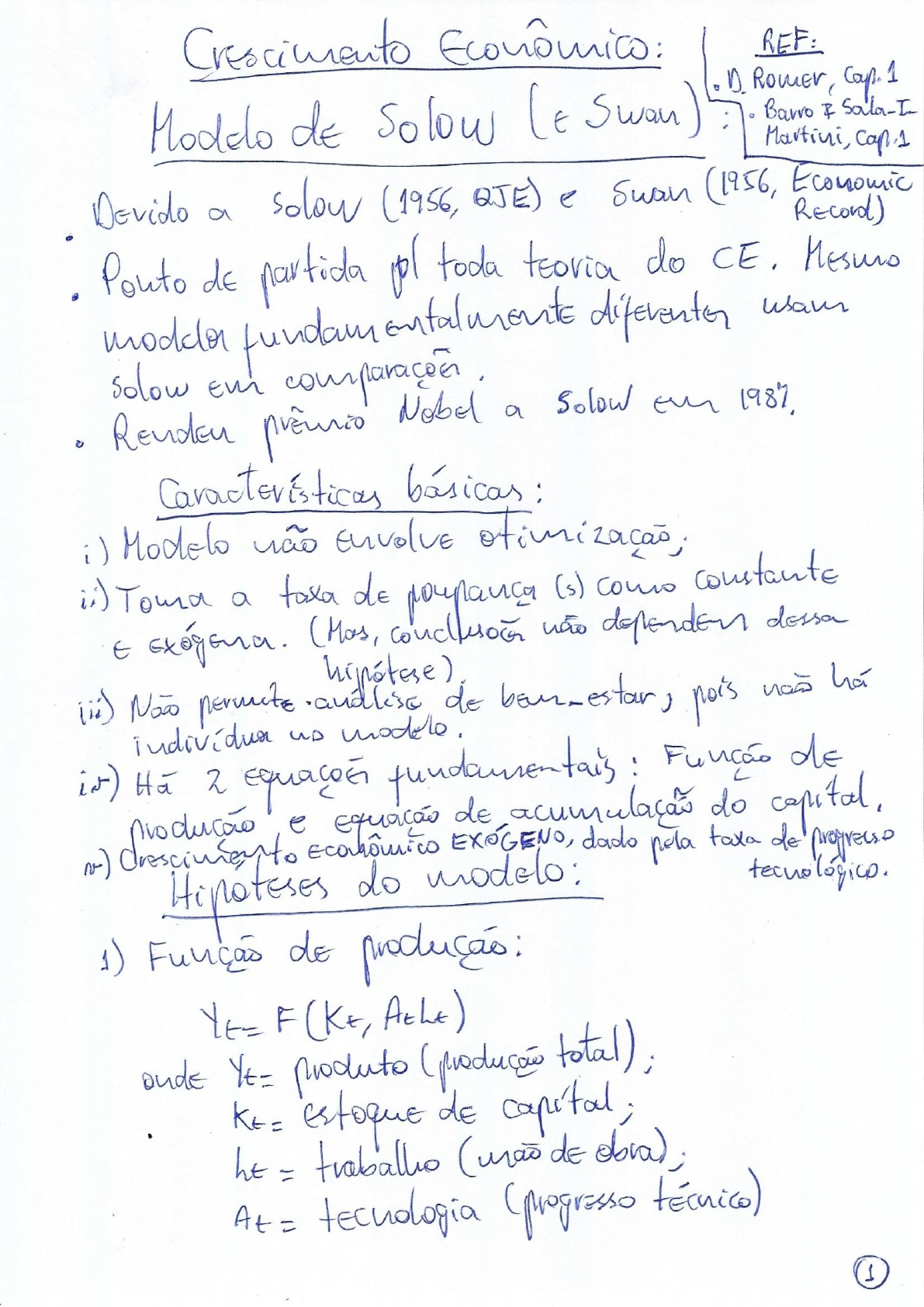 <p>REF: D. 1 Modelo de Solow (E Barro Martini, Devido a solow (1956, QJE) e Swan (1956, Economic Record) Ponto partida toda do fundam entalment diferenter solow Nobel a Solow 1987, i) Modelo Envolve ii) Toma a (s) constante E (Mas, dependen dessa iii) Now de pois individual Ha 2 : Funcas de e do to EXOGENO, dado pela taxa de do 1) Funcas dE YE= F(Kx, produto total) i = estoque he = (was dE At = tecnologia 1</p><p>indicando que a 2) constantes C Athx) Fazendo a de RCE a YE = = 1) Atht Atht = / yt= YE capital " 4( " 3) A de flo) >0 de kt E LO dE f(k) taxas decrescenter concava max).</p><p>Nota: = = F Kt 1 Take = f lim lim (kt) = 0 kt Tomando Essas conjuntamente, Exemplo: Cobb-Douglas YE= D Rx 4) de (models tempo continuo) Defina It devivada t Xt 1) CVESC. populacional ii) At = tx progresso tecnologico At Isto implica que: = e = it= = ut = uht. dt e At taxas de iii) Kt= It = investimento. 3</p><p>de SE(0,1) E a que Dinamica do E - dinamica do capital, pois as de e At saw Em unidades de - ske = Ah AeLt Athe observe que: = = = de dt (Atht)2 2 = - Kt AtLt = Kt - + n] ou kt = + Substituindo Atht (ntg) kt= - kt= sf(Re) - (utges) Rt 4</p><p>Essa E a do modelo de solow. A depends = investimento for Rt = investimento kt no nivel atual, do capital Graficam RE Em que = 5) kt e =0.0 investimento Defina que > k"> kt = de A economia um unico no 5</p><p>No crescimento = Atht, Kt = = Rt Kt = n. kt=D, Kt = Kt Yt YE Alain disso, = e = n. 0 crescimento Economics Defina YE = = YE - n Yt Yt = Rt = e = , kt No crescimento balanceads, a taxa do per trabalhador ( per 6</p><p>do progresso Aumento de rivel kt e was gever sobre que continua igual a of no balanceado, Consumo: E definido, Solow, como que sobra Ct = = de Atht Ct= Seja consumo for efetivo no Nesse * que k* (s, act 2k* - as as as as maximiza nivel de 0 que</p><p>Ct as = da E igual a da veta do ESSE do E chamado de kx fora que: a) > act as >0 e L (ufgts) as E GR L no isso, observe Eur kt =0 e - O= - - (negt = = = S 8</p><p>( consumo E JCE as = O, Nesse f GR )= s) - NOTA: C kt GR GR que: > 25 (RE) > GR ). oh até atrugir * GR LO, isto implica que modelo E ineficiente, aumentar S Rt. GR E aumentar consumo ate que SE atinja de's" : Considere as (1) (2) que RE= de = (utges) = f (RE) Eq. (1). as Temor que achar . a as = / usando as as 9</p><p>= - as as - Multiplique ambor or lador for = as Substitua : * as - S. = = / 1- - E a do capital, avaliada Reflete a total 10</p><p>capital sob crescimento mercado E de = Isto que: 1/3 2 1% Lo as Elasticidade do d 1- 1/3 Grandes tem no balanceado. Velocidade saber SE algum RE = e ke= Rt. Tomando de Tay torno k(k) 2k Usando k dado = - (negts) k* - 11</p><p>pois = k* S= k* R=O. = - 1] S) Substituindo k ] Resolvendo de - (htgs t e Nota: Tx - Xt= Xo total produz converge a taxa que converge mesua e = 6% e gtd) = 4% 4% da distancia até por = 0.5 t 12 2</p><p>- No a 0,69 17 0,04 Leva navor da distanciorate Taxa 13</p>