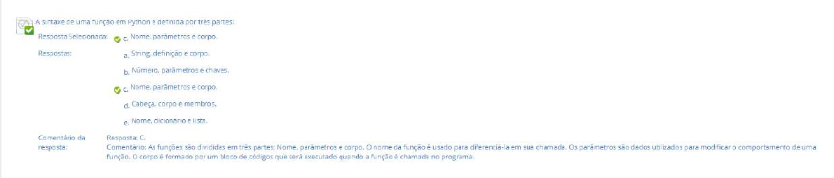 <p>A sintaxe de uma função em Python definida por três partes: Resposta Nome e corpo. Respostas: a. definição e corpo. b. e Nome e corpo. d. corpo e e Nome, e lista. Comentário da Resposta: resposta: Comentário: As funções são divididas em Nome e corpo. a nome da função é usado para diferencia-la em sua Os são dados utilizados para modificar comportamento de uma função. corpo é formado por um de códigos que será executado quando a função é chamada no programa.</p><p>Com relação aos Sets em Python, qual é resultado do programa abaixo? conjunto = {"fusca", "gol", "brasilia"} print("gol" in conjunto) Resposta Selecionada: b. True Respostas: a. False b. True C. fusca d. gol e. brasilia Comentário da resposta: Resposta: B. Comentário: operador in procura dentro do set conjunto a string "gol", retornando True caso pertença ao conjunto, ou False caso não pertença.</p><p>Com relação a Tuplas, qual a saida do código abaixo? 2.3 t2 (1,2,3) ==t2) Resposta Selecionada: True b. (1.2.3) True d. False e. Erro de compilação Comentário da Resposta: resposta: Comentário: operador -- compara operando do lado esquerdo com operando do lado direito t2 e retorna verdadeiro (True) no caso deles serem iguals ou falsos (False) caso AS tuplas são válidas na declaração de e portanto, a saída é True.</p><p>que diferencia a estrutura de dados lista da estrutura de dados conjunto? Resposta Selecionada: d. A lista pode ter elementos repetidos ec conjunto não. Respostas: a. o conjunto pode ter elementos adicionados a qualquer momento, enquanto que a após definida, não permite a adição ou a remoção de b. A lista pode ter mais elementos que A lista é multidimensional e o conjunto não. A lista pode ter elementos repetidos e o conjunto e. Nenhuma Comentário da Resposta: D. resposta: Comentário: O que define a quantidade de elementos dos conjuntos e das listas é tamanho da do Tanto as listas quando os conjuntos podem ser divididos em várias A diferença que lista pode ter elementos enquanto que conjunto. seguindo a definição de conjunto na não permite elementos</p><p>Qual resultado do programa abaixo? Resposta Comentário da Resposta: A é de duas a primeira tem o lista A segunda tem o 1 a lista Para se referir à lista escrevemos a[0] e para se referir à lista escrevemos No contexto do a referência é para a segunda a[1] e para primeiro elemento</p><p>PERGUNTA 1 Um programador precisou criar uma função de nome "fcn_01", de modo que a mesma devesse receber 3 valores numéricos (a serem recebidos nas variáveis "a", "b" e "C", nesta ordem), de modo que va dessas variáveis sejam, respectivamente, 20 e 30. Qual deve ser a declaração (definição) da função, e para que serve valor default"? O a. Declaração: def fcn_01 "valor default" define o valor das variáveis caso a chamada da função não os contenha. b. Declaração: fcn_01 "valor default faz com que as "variáveis" se tornem "constantes". C. Declaração: def fcn_01 (a, b, c): "valor default" é o valor enviado na chamada da função. d. Declaração: "valor default faz com que as "variáveis" se tornem "constantes". e. Declaração: fcn_01 "valor define valor das variáveis caso a chamada da função não os contenha. PERGUNTA 2 Analisando o código a seguir, o que será impresso na tela do console? "PaLaVrA" for n in range(len(x)): # dica: # parâmetro na função print faz com que, a cada; # ... o valor seja impresso na mesma linha, e não; # em linhas diferentes. a. b. palavra. ARVALAP d. e. arvalap.</p><p>PERGUNTA 3 De acordo com código a seguir, qual é o valor da ordem da matriz "mat" e qual é o texto que será impresso na tela do console (com a função print)? import numpy as np mat = np.array([ [[2, 14, 8, 1], [17, 4, 13, 9]], [[10, 5, 11, 18], [26, 19, 23, 16]], [[15, 6, 27, 3], [12, 20, 0, 21]], ]) print(mat[1, 0, 3] * 2) a. Ordem da matriz = e será impresso: [2,0,6]. b. Ordem da matriz = 2x3x4, e será impresso: 18. Ordem da matriz = e será impresso: 36. d. Ordem da matriz = 3x2x4, e será impresso: [2, 0. 6]. e. Ordem da matriz = 3x2x4, e será impresso: 36. PERGUNTA 4 Analisando as variáveis criadas a seguir ed2 e ed3), qual é tipo da estrutura de dados que cada uma delas representa (respectivamente)? ed1 = (3, 7, 1, 0, 2, 8, 5) ed2 = {3, 7. 1, 0, 2, 8, 5} ed3 = [3, 7, 1, 0, 2, 8, 5] a. Representam: conjunto (ou set), tupla e lista. b. Representam: tupla, conjunto (ou set) e lista. Representam: lista, conjunto (ou set) e tupla. d. Representam: tupla, lista e conjunto (ou set). e. Representam: lista, conjunto (ou set) e lista.</p><p>Pergunta 1 0.25 em 0.25 ponto dicionário em Python é uma coleção de elementos ordenada e e muito utilizado para guardar o conteúdo de arquivos JSON ou na para o Os dicionarios são indexados e a procura por um item é bem Assinale a opção que melhor descreve os dicionários em Python 3.7: Resposta Coleções de e valor a. Mapas de variáveis b. Lista de ordenados que permite a repetição de Coleções de tens-chave e valor d. de itens sem e. de indexados sem Comentário da C resposta: os coleções de e valor, Python pode ter elementos não mas de qualquer além de permitir as repetições de seus</p><p>Python módulos para tratar de conexões com diversos banco de dados no A manipulação dos dados é felta através de um conector, que, no caso do é que pode ser instalado pelo programa pip. Uma vez e no programa Python é possível ao banco de os comandos SOL que é a linguagem entendida por bancos de dados Qual é comando para executar uma QUERY para trazer todos os dados da tabela universidade em Python? Resposta Selecionada: e. cursorexecute(SELECT * FROM Respostas: a. * FROM b. * FROM * FROM d. FROM e Comentário da Resposta: E resposta: objeto da classe cursor deve executar método que recebe uma string com comando SQL comando correto é 0 métodos</p><p>Pergunta 3 0 em 0.25 pontos que são 05 dicionários em linguagens de programação? R