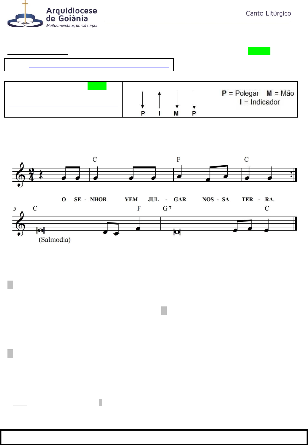<p>TERÇA-FEIRA DA 21ª SEMANA DO TEMPO COMUM (Ano par)</p><p>Salmo Responsorial – Sl 95 (96) – O SENHOR VEM JULGAR NOSSA TERRA (Tom: C)</p><p>RITMO: Balanço (I)</p><p>Como tocar esse Ritmo no Violão? Movimentos - MÃO DIREITA</p><p>http://www.youtube.com/watch?v=_T6f_CCV2ds</p><p>Sl 95 (96), 10.11-12a.12b-13 (R. 13b)</p><p>Melodia: André Zamur (Refrão) e Estrofe (D.R.)</p><p>C F C</p><p>O SENHOR VEM JULGAR NOSSA TERRA. (BIS)</p><p>C</p><p>1. Publicai entre as nações: “Reina o Senhor!” +</p><p>F</p><p>Ele firmou o universo inabalável,</p><p>G7 C</p><p>e os povos ele julga com justiça.</p><p>C</p><p>2. O céu se rejubile e exulte a terra, +</p><p>F</p><p>aplauda o mar com o que vive em suas águas;</p><p>G7 C</p><p>os campos com seus frutos rejubilem.</p><p>C</p><p>3. E exultem as florestas e as matas +</p><p>F</p><p>na presença do Senhor, pois ele vem,</p><p>G7 C</p><p>porque vem para julgar a terra inteira.</p><p>C F</p><p>Governará o mundo todo com justiça,</p><p>G7 C</p><p>e os povos julgará com lealdade.</p><p>Obs.: Observem o sinal gráfico + nas 3 estrofes. Ele indica que não há cadência final, de modo que você só</p><p>finalizará a melodia no próximo verso.</p><p>Áudio: https://www.youtube.com/watch?v=NXoiM2rMnxY</p><p>Obs.: Melodia do refrão acima conforme gravação da faixa 5 - CD/Apostila: Salmos e Aclamações – Ano B – Vol. I (nov-10)</p><p>http://www.youtube.com/watch?v=_T6f_CCV2ds</p><p>https://www.youtube.com/watch?v=NXoiM2rMnxY</p>