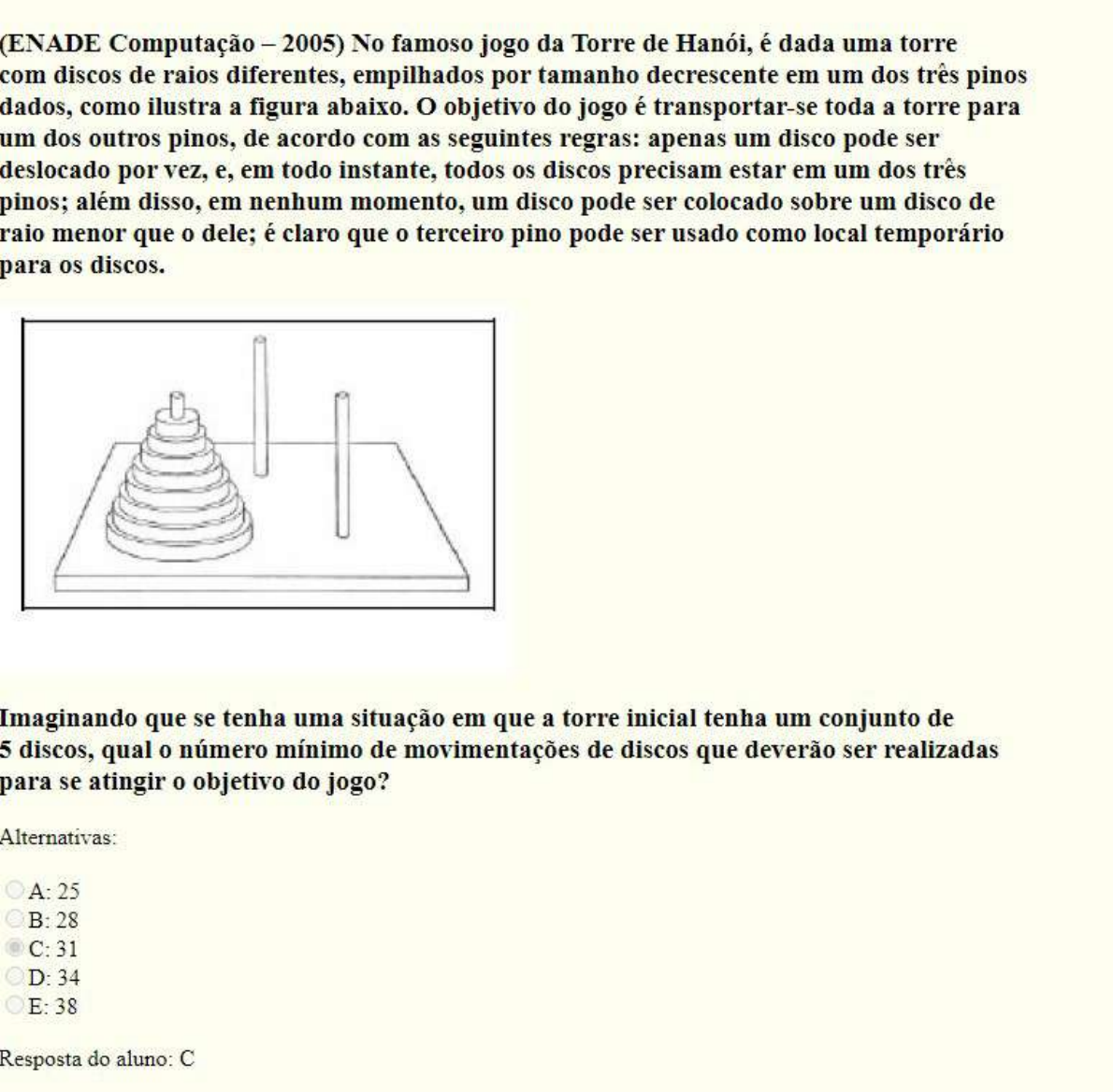 <p>(ENADE Computação - 2005) No famoso jogo da Torre de Hanói, é dada uma torre com discos de raios diferentes, empilhados por tamanho decrescente em um dos três pinos dados, como ilustra a figura abaixo. objetivo do jogo é transportar-se toda a torre para um dos outros pinos, de acordo com as seguintes regras: apenas um disco pode ser deslocado por vez, e, em todo instante, todos os discos precisam estar em um dos três pinos; além disso, em nenhum momento, um disco pode ser colocado sobre um disco de raio menor que o dele; é claro que o terceiro pino pode ser usado como local temporário para os discos. Imaginando que se tenha uma situação em que a torre inicial tenha um conjunto de 5 discos, qual o número mínimo de movimentações de discos que deverão ser realizadas para se atingir o objetivo do jogo? Alternativas: A: 25 B: 28 C: 31 D: 34 E: 38 Resposta do aluno: C</p><p>Relativo a um Tipo Abstrato de Dados (TAD), assinale a alternativa incorreta: Abstraida qualquer linguagem de um TAD pode ser visto como um modelo matemático que encapsula um modelo de dados um conjunto de procedimentos que atuam com exclusividade sobre os dados encapsulados Qualquer processamento a realizado sobre os dados encapsulados em um TAD pode ser executado por intermédio de procedimentos externos, ou seja, por meio de procedimentos definidos externamente ao modelo matemático do TAD implementação de cada TAD deve porções bem definidas no programa: uma para a definição das estruturas de dados e outra para a definição do conjunto de algoritmos D: Qualquer processamento a ser realizado sobre os dados encapsulados em um TAD só poderá ser executado por intermédio dos procedimentos definidos no modelo matemático do TAD E: Uma coleção de tais como: inserir, suprimir e encapsuladas junto com uma estrutura passiva, como um dicionário (conjunto de verbetes). pode ser considerada um TAD Resposta do B Justificativa(s) do</p><p>Dado o seguinte algoritmo: Inteiro Calculo(Inteiro A) Se A for igual a um Então Retorna um Senão Retorna A multiplica Calculo(A menos um) Fim Se Fim Calculo Está função é: Alternativas: A: Uma função não recursiva que retorna A elevado ao quadrado B: Uma função recursiva que retorna fatorial de A C: Uma função recursiva que retorna A elevado a A D: Uma função não recursiva que retorna A elevado a A E: Uma função não recursiva que retorna fatorial de A Resposta do aluno: B Justificativa(s) do aluno:</p><p>A lista encadeada onde o último elemento inserido é obrigatoriamente o primeiro a ser removido é: Alternativas: A: Vetor B: Fila C: Pilha D: Lista circular E: Lista duplamente encadeada Resposta do aluno: C Justificativa(s) do aluno:</p><p>e estrutura dados adoro de o resultado da impressão da árvore apresentada, utilizando a ordem de atravessamento infixa, será? Alternativas: A: eu adoro estrutura de dados e arquivo B: eu adoro estrutura de arquivo e dados C: dados arquivo eu adoro estrutura de e D: arquivo eu e estrutura adoro dados de E: eu arquivo adoro estrutura e de dados Resposta do aluno: E Justificativa(s) do aluno:</p><p>A B C Apresentada a arvore acima qual forma de atravessamento resultará na expressão a+b*c: Alternativas: A: prefixa B: posfixa C: alterfixa D: infixa E: recursixa Resposta do aluno: D Justificativa(s) do aluno:</p><p>(POSCOMP2005) Arvores podem ser usadas para guardar e recupérar informações com número de a altura da Quais das seguintes figuras representam de altura balanceada ou do tipo AVL Velski e Landis: (I) (II) (III) (IV) A: Somente são AVL B: AVL C: Somente (III) são AVL D: Somente (II) (III) são AVL são AVL Resposta do C do</p><p>Considere: I. Estrutura de dados linear e estática, composta por um número finito de elementos de um determinado tipo de dados. II. É linear e dinâmica quando encadeada; apresenta um campo para conter o dado a ser armazenado e outro campo para apontar para próximo elemento. III. É tipicamente uma representação de vértices ligados por arestas que eventualmente, podem ser direcionadas por meio de setas. IV. Os elementos associados a cada nó são habitual- mente chamados de filhos desses nós, podendo existir nós sem filhos. Em relação às estruturas de dados, é correto afirmar que os itens I, II, III e IV estão associados, respectivamente, a Alternativas: A: lista, fila, pilha e vetor. B: fila, vetor, grafo e C: vetor, lista, grafo e D: lista, fila, grafos e tabela de hashing. E: fila. árvore e tabela de Resposta do aluno: C Justificativa(s) do aluno:</p>