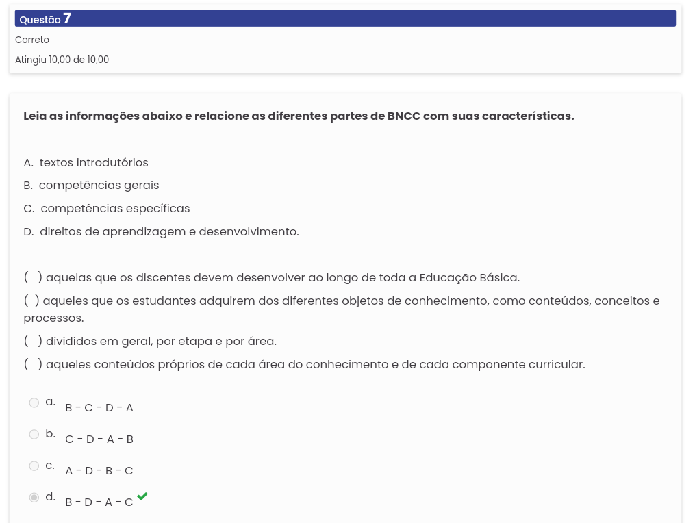 <p>Questão 7 Correto Atingiu 10,00 de 10,00 Leia as informações e relacione as diferentes partes de BNCC com sugs A. textos introdutórios B. competências gerais C. competências específicas D. direitos de aprendizagem e desenvolvimento aquelas que os discentes devem desenvolver longo de toda a Educação Básica. ( ) aqueles que os estudantes adquirem dos diferentes objetos de conhecimento, como conteúdos, conceitos e processos. divididos em geral, por etapa e por ( ) aqueles conteúdos próprios de cada área do conhecimento e de cada componente a. b. C. A-D-B-C d. B-D-A-C</p>