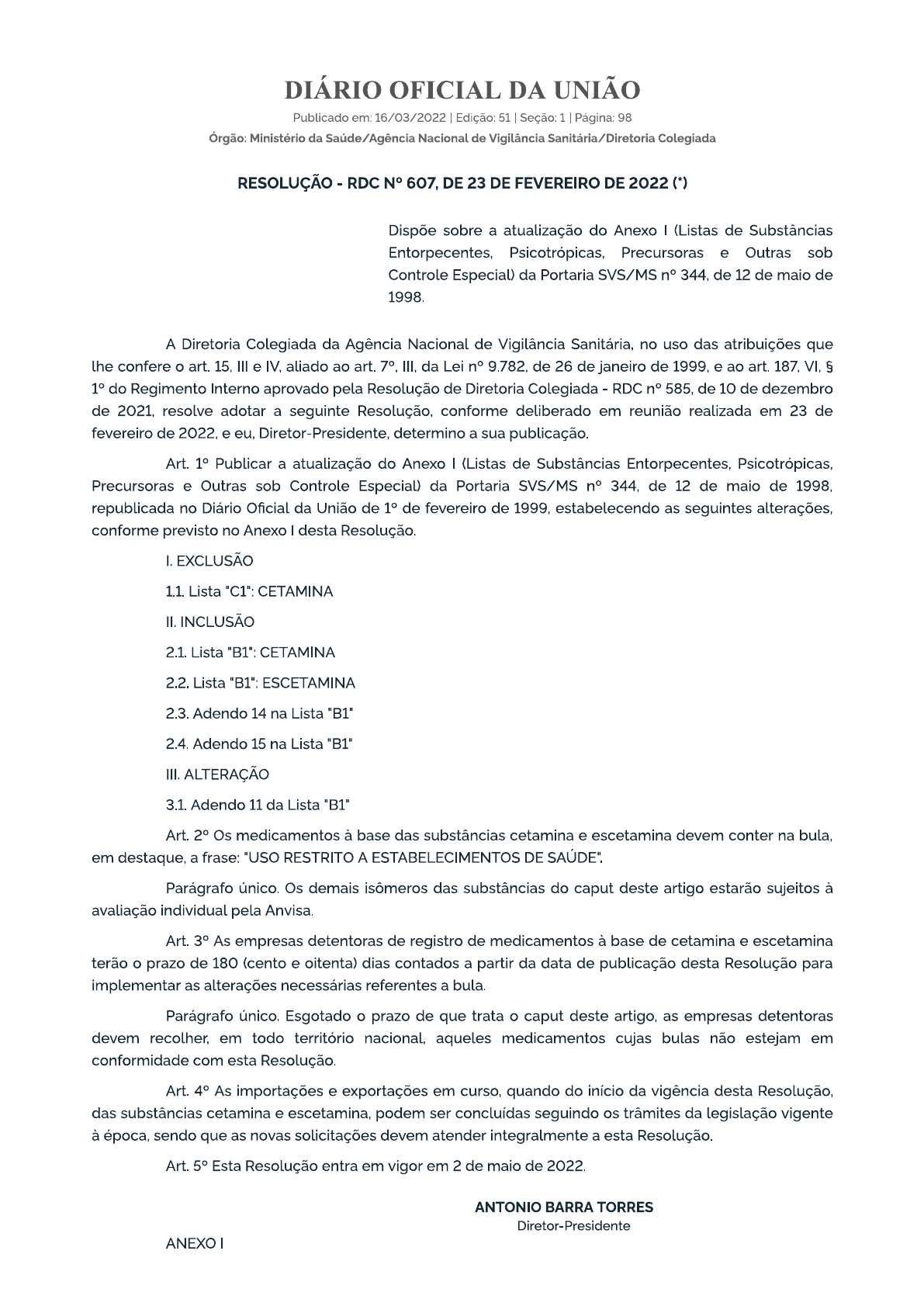<p>DIÁRIO OFICIAL DA Publicado em: 16/03/2022 Edição: 51 Seção: 1 Página: 98 Órgão: Ministério da Saúde/Agência Nacional de Vigilância Sanitária/Diretoria Colegiada RESOLUÇÃO - RDC N° 607, DE 23 DE FEVEREIRO DE 2022 (*) Dispõe sobre a atualização do Anexo (Listas de Substâncias Entorpecentes, Psicotrópicas, Precursoras e Outras sob Controle Especial) da Portaria SVS/MS n° 344, de 12 de maio de 1998. A Diretoria Colegiada da Agência Nacional de Vigilância Sanitária, no uso das atribuições que lhe confere o art. 15, III e IV, aliado ao art. III, da Lei n° 9.782, de 26 de janeiro de 1999, e ao art. 187, VI. § 1° do Regimento Interno aprovado pela Resolução de Diretoria Colegiada RDC n° 585, de 10 de dezembro de 2021, resolve adotar a seguinte Resolução, conforme deliberado em reunião realizada em 23 de fevereiro de 2022, e eu, Diretor-Presidente, determino a sua publicação. Art. 1° Publicar a atualização do Anexo (Listas de Substâncias Entorpecentes, Psicotrópicas, Precursoras e Outras sob Controle Especial) da Portaria SVS/MS n° 344, de 12 de maio de republicada no Diário Oficial da União de 1° de fevereiro de 1999, estabelecendo as seguintes alterações, conforme previsto no Anexo desta Resolução. I. EXCLUSÃO 1.1. Lista "C1": CETAMINA II. INCLUSÃO 2.1. Lista "B1": CETAMINA 2.2. Lista "B1": ESCETAMINA 2.3. Adendo 14 na Lista "B1" 2.4. Adendo 15 na Lista "B1" III. ALTERAÇÃO 3.1. Adendo 11 da Lista "B1" Art. 2° Os medicamentos à base das substâncias cetamina e escetamina devem conter na bula, em destaque, a frase: "USO RESTRITO A ESTABELECIMENTOS DE SAÚDE" Parágrafo Os demais isômeros das substâncias do caput deste artigo estarão sujeitos à avaliação individual pela Anvisa. Art. 3° As empresas detentoras de registro de medicamentos à base de cetamina e escetamina terão prazo de 180 (cento e oitenta) dias contados a partir da data de publicação desta Resolução para implementar as alterações necessárias referentes a bula. Parágrafo único. Esgotado o prazo de que trata caput deste artigo, as empresas detentoras devem recolher, em todo território nacional, aqueles medicamentos cujas bulas não estejam em conformidade com esta Resolução. Art. 4° As importações e exportações em curso, quando do início da vigência desta Resolução, das substâncias cetamina e escetamina, podem ser concluídas seguindo os trâmites da legislação vigente à época, sendo que as novas solicitações devem atender integralmente a esta Resolução. Art. 5° Esta Resolução entra em vigor em 2 de maio de 2022. ANTONIO BARRA TORRES Diretor-Presidente ANEXO</p><p>MINISTÉRIO DA SAÚDE AGÊNCIA NACIONAL DE VIGILÂNCIA SANITÁRIA GERÊNCIA-GERAL DE MONITORAMENTO DE PRODUTOS SUJEITOS À VIGILÂNCIA SANITÁRIA ATUALIZAÇÃO N. 79 LISTAS DA PORTARIA SVS/MS 344 DE 12 DE MAIO DE 1998 (DOU DE 1/2/99) LISTA A1 LISTA DAS SUBSTÂNCIAS ENTORPECENTES (Sujeitas à Notificação de Receita "A") 1-ACETILMETADOL 2-ALFACETILMETADOL 3-ALFAMEPRODINA 4-ALFAMETADOL 5-ALFAPRODINA 6-ALFENTANILA 7-ALILPRODINA 8-ANILERIDINA 9-BEZITRAMIDA 10-BENZETIDINA 11-BENZILMORFINA 12-BENZOILMORFINA 13-BETACETILMETADOL 14-BETAMEPRODINA 15-BETAMETADOL 16-BETAPRODINA 17-BUPRENOREINA 18-BUTORFANOL 19-CLONITAZENO 20-CODOXIMA 21-CONCENTRADO DE PALHA DE DORMIDEIRA 22-DEXTROMORAMIDA 23-DIAMPROMIDA 24-DIETILTIAMBUTENO 25-DIFENOXILATO 26-DIFENOXINA 27-DIIDROMORFINA 28-DIMEFEPTANOL (METADOL) 29-DIMENOXADOL 30-DIMETILTIAMBUTENO 31-DIOXAFETILA 32-DIPIPANONA 33-DROTEBANOL</p><p>34-ETILMETILTIAMBUTENO 35-ETONITAZENO 36-ETOXERIDINA 37-FENADOXONA 38-FENAMPROMIDA 39-FENAZOCINA 41-FENOPERIDINA 42-FENTANILA 43-FURETIDINA 44-HIDROCODONA 46-HIDROMORFONA 47-HIDROXIPETIDINA 48-INTERMEDIÁRIO DA METADONA 49-INTERMEDIÁRIO DA MORAMIDA (ÁCIDO 50-INTERMEDIÁRIO "A" DA PETIDINA (4 CIANO-1-METIL-4-FENILPIPERIDINA) 51-INTERMEDIÁRIO "B" DA PETIDINA ETÍLICO DO ÁCIDO 4-FENILPIPERIDINA-4- CARBOXILÍCO) 52-INTERMEDIÁRIO "C" DA PETIDINA 53-ISOMETADONA 54-LEVOFENACILMORFANO 55-LEVOMETORFANO 56-LEVOMORAMIDA 57-LEVORFANOL 58-METADONA 59-METAZOCINA 61-METILDIIDROMORFINA 62-METOPONA 63-MIROFINA 64-MORFERIDINA 65-MORFINA 66-MORINAMIDA 67-NICOMORFINA 68-NORACIMETADOL 69-NORLEVORFANOL 71-NORMORFINA 72-NORPIPANONA</p><p>73-N-OXICODEÍNA 74-N-OXIMORFINA 75-ÓPIO 76-ORIPAVINA 77-OXICODONA 78-OXIMORFONA 79-PETIDINA 80-PIMINODINA 81-PIRITRAMIDA 82-PROEPTAZINA 83-PROPERIDINA 84-RACEMETORFANO 85-RACEMORAMIDA 86-RACEMORFANO 87-REMIFENTANILA 88-SUFENTANILA 89-TAPENTADOL 90-TEBACONA 91-TEBAÍNA 92-TILIDINA 93-TRIMEPERIDINA ADENDO: 1) ficam também sob controle: 1.1. os sais, éteres, ésteres e isômeros (exceto os isômeros dextrometorfano, (+)3-metoxi-N- metilmorfinan, e o Dextrorfano, (+) 3-hidroxi-N-metilmorfinan), das substâncias enumeradas acima, sempre que seja possível a sua existência; 1.2. os sais de éteres, ésteres e isômeros (exceto os isômeros dextrometorfano, (+)3-metoxi-N- metilmorfinan, e o Dextrorfano, (+) 3-hidroxi-N-metilmorfinan), das substâncias enumeradas acima, sempre que seja possível a sua existência. 2) preparações à base de DIFENOXILATO, contendo por unidade posológica, não mais que 2,5 miligramas de DIFENOXILATO calculado como base, e uma quantidade de Sulfato de Atropina equivalente a, pelo menos, 1,0% da quantidade de DIFENOXILATO, ficam sujeitas a prescrição da Receita de Controle Especial, em 2 (duas) vias e os dizeres de rotulagem e bula devem apresentar a seguinte frase: "VENDA SOB PRESCRIÇÃO MÉDICA PODE SER VENDIDO COM RETENÇÃO DA RECEITA". 3) preparações à base de ÓPIO, contendo até 5 miligramas de morfina anidra por mililitros, ou seja, até 50 miligramas de ÓPIO, ficam sujeitas a prescrição da RECEITA DE CONTROLE ESPECIAL, em 2 (duas) vias e os dizeres de rotulagem e bula devem apresentar a seguinte frase: "VENDA SOB PRESCRIÇÃO MÉDICA SÓ PODE SER VENDIDO COM RETENÇÃO DA RECEITA". 4) fica proibida a comercialização e manipulação de todos os med
