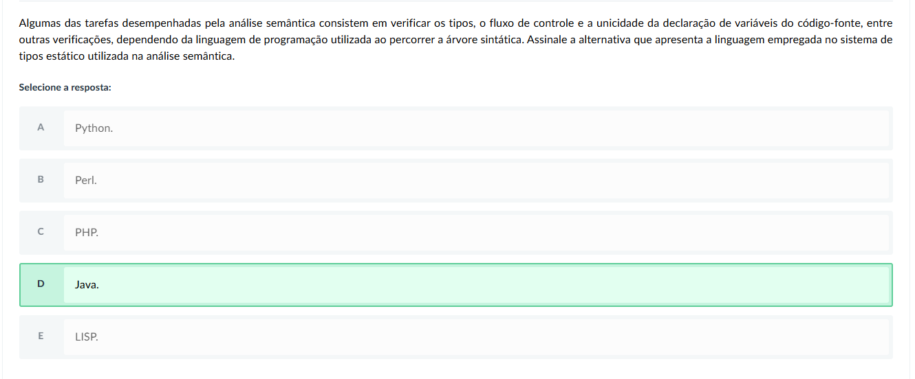 <p>Algumas das tarefas desempenhadas pela análise semântica consistem em verificar os tipos, o fluxo de controle e a unicidade da declaração de variáveis do código-fonte, entre outras verificações, dependendo da linguagem de programação utilizada ao percorrer a árvore sintática. Assinale a alternativa que apresenta a linguagem empregada no sistema de tipos estático utilizada na análise semântica. Selecione a resposta: A Python. B Perl. C PHP. D Java. E LISP.</p>