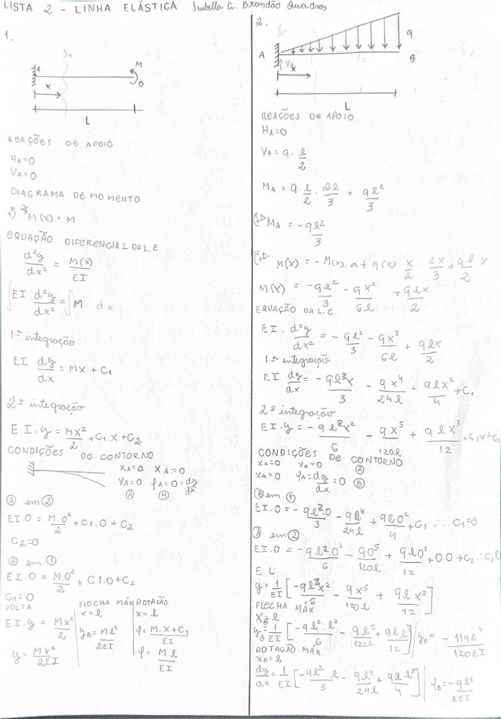 <p>LISTA 2 - LINHA ELÁSTICA a 2. 9 Sk A B M x De L HA=O APOIO VA=O DIAGRAMA = = M 3 = M(x) M(x) = dx2 EI = - EI = M dx2 EQUAÇÃO 3 2 dzy = 3 EI dy = MX + C1 be 2 dx EI - - ax 3 24l - + 2 oe CONTORNO De 6 CONTORNO 120l 12 XA=O A PA=O=dy XA=O =0 B dx A B B em A em 2 EIO = 2 + = A em 2 9 EI.O = - 905 + + 0.0 B em 1 6 E 120l 12 EI.O = + 2 C1=0 g=1 EI [ 6 VOLTA MAX MAX 12 Mx2 = BEI [ 2 YB= EI 6 120l 2EI ROTAGAO MAX 12 120EI 2EI EI dy= ax EIL 3 24l 4</p><p>3. M M HB=0 A B A VB=P C a + L APO10 DIAGRAMA be VB=2M 2M L M (X1)=0 DIAGRAMA De MOMENTO = dx2 EI.dy +C3 2 EQ L.E dx EI. CONDICOES 2 dx2 CONTORNO l SUBST. (B) = dx +C3 +C3 +C4 = - + CONDICOES 3e 2 C1= PX2 6 X4=0 CONTORNO 2 2 XB=l YB=0 B + A 2 6 - + L.E em 2 EI - pb3 2 EI 2 3 EQ L.E y= EI [ 3e 2 6 EI y=1 EI + Me 8 2 EI [ Mez Me 1 24 8 12 24 24 ROTAÇÃO dy EI [ -Mxe e MX - 6 EI 1 Ml 4 2 Me</p>