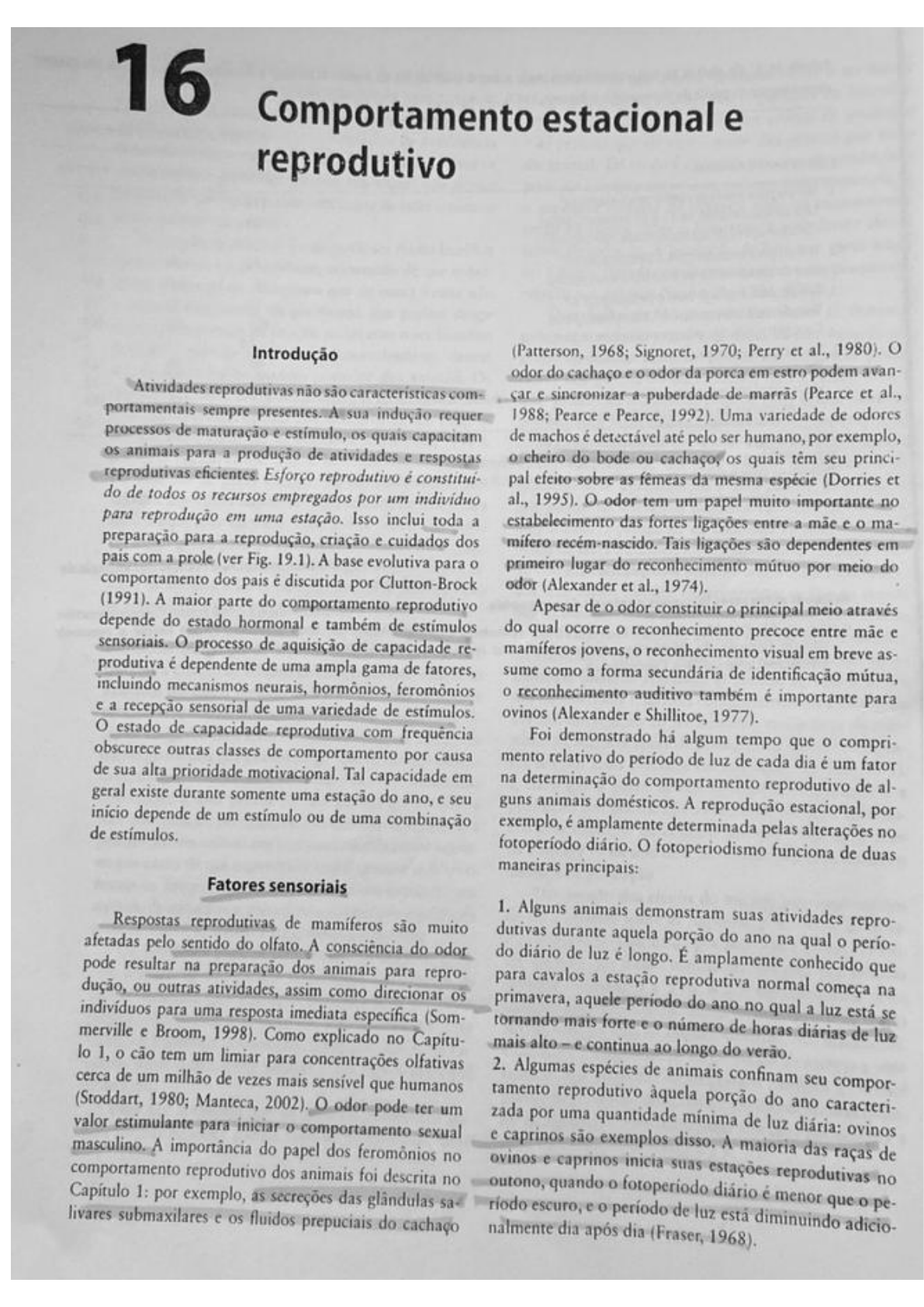 <p>16 Comportamento estacional e reprodutivo Introdução (Patterson, 1968; Signoret, 1970; Perry et al., 1980). odor do cachaço e odor da porca em estro podem avan- Atividades reprodutivas não são com- car e sincronizar a puberdade de (Pearce et al., portamentais sempre presentes. indução requer 1988; Pearce Pearce, 1992). Uma variedade de odores processos de maturação e os quais capacitam de machos é detectável até pelo ser humano, por exemplo, os animais para a produção de atividades e respostas do bode ou cachaço, os quais têm seu princi- reprodutivas Esforço reprodutivo é constitui- pal efeito sobre as femeas da mesma espécie (Dorries et do de todos os recursos empregados por um individuo al., 1995). odor tem um papel muito importante no para reprodução em uma estação. Isso inclui toda a estabelecimento das fortes ligações entre a mãe ma- preparação para a reprodução, criação e cuidados dos mifero Tais ligações são dependentes em pais com a prole (ver Fig. 19.1). A base evolutiva para o primeiro lugar do reconhecimento por meio do comportamento dos pais é discutida por Clutton-Brock odor (Alexander et al., (1991). A maior parte do comportamento reprodutivo Apesar de odor constituir o principal meio através depende do estado hormonal e também de estimulos do qual ocorre reconhecimento precoce entre e o processo de aquisição de capacidade re- mamiferos jovens, o reconhecimento visual em breve as- produtiva é dependente de uma ampla gama de fatores, sume como a forma secundária de identificação incluindo mecanismos neurais, hormônios, feromônios o reconhecimento auditivo também é importante para e a recepção sensorial de uma variedade de ovinos (Alexander e Shillitoe, o estado de capacidade reprodutiva com Foi demonstrado há algum tempo que compri- obscurece outras classes de comportamento por causa mento relativo do período de luz de cada dia é um fator de sua alta prioridade Tal capacidade em geral existe durante somente uma estação do ano, e seu na determinação do comportamento reprodutivo de al- depende de um estímulo ou de uma combinação guns animais A reprodução estacional, de exemplo, alterações por no é amplamente determinada pelas o fotoperiodismo funciona de duas maneiras principais: Fatores sensoriais Respostas reprodutivas de mamiferos são muito 1. Alguns animais demonstram suas atividades repro- afetadas pelo sentido do olfato. A consciência do odor dutivas durante aquela porção do ano na qual pode resultar na preparação dos animais para repro- do diário de luz é longo. É amplamente conhecido que dução, ou outras atividades, assim como direcionar os para cavalos a estação reprodutiva normal começa na indivíduos para uma resposta imediata específica (Som- primavera, aquele período do ano no qual a luz está se merville e Broom, 1998). Como explicado no tornando mais forte e número de horas diárias de luz lo 1, tem um limiar para concentrações olfativas mais alto e continua ao longo do cerca de um milhão de vezes mais que humanos 2. Algumas espécies de animais confinam seu compor- (Stoddart, 1980; Manteca, 2002). o odor pode um tamento reprodutivo àquela porção do ano caracteri- valor estimulante para iniciar o comportamento sexual zada por uma quantidade mínima de luz diária: ovinos masculino. A importância do papel dos feromônios no e caprinos são exemplos A maioria das de comportamento reprodutivo dos animais foi descrita no ovinos e caprinos inicia suas estações reprodutivas raças Capítulo 1: por exemplo, as secreções das glândulas sa quando fotoperiodo diário é menor que no livares submaxilares e os fluidos prepuciais do riodo escuro, e período de luz diminuindo adicio- o pe- nalmente dia após dia (Fraser, 1968).</p><p>Comportamento estacional e reprodutivo 141 Com certeza estímulo de luz natural para aqueles animais domésticos que apresentam reprodução estacio- idade precoce. Os processos de comportamento sexual nal um estímulo complexo, envolvendo as quantidades dependem de estímulo por estrógeno na e testos- absolutas de luz e escuridão, assim como as quantidades terona no macho. o comportamento reprodutivo, que relativas de luz a cada dia. Apesar de serem graduais, as varia entre as espécies, está associado com cortejo, a alterações de diárias são importantes para o monta a ação de coito nos machos, e cortejo, a solici- início da também é evidente que a natureza tação e a aceitação do coito pelas Durante de- fixa do é importante, por exemplo, animais senvolvimento, há períodos para a determina- de reprodução estacional mantêm suas atividades repro- ção do comportamento A diferenciação sexual, por exemplo, em ovelhas é determinada durante a fase dutivas enquanto houver uma quantidade adequada de fetal da vida. luz ou Quando fotoperiodo não oferecer um Os mecanismos neuromusculares para a maioria dos estímulo adequado para animal, desenvolve-se um pe- riodo refratário durante o qual desempenho reprodutivo componentes do comportamento sexual estão presentes fica paralisado. e gatos machos são sexualmente ati- em ambos os sexos. Dada a estimulação apropriada, vos durante ano Cadelas têm maior propensão de comportamento heterossexual típico pode aparecer. tipo de comportamento sexual exibido é resultado do entrar em cio durante a primavera que durante o Gatas com frequência entram em cio quando os dias são grau de estímulo hormonal ou de outro tipo aplicado para eliciá-lo (Hurnick et al., 1975). Em animais de com- mais longos no período por volta do equinócio da prima- panhia, a variação na magnitude dos efeitos da castração vera. Martas e raposas são estritamente estacionais é Se os animais são castrados, de forma que e entram no cio na primavera (Sjaastad et al., 2003). Estímulos visuais com frequência são combinados se elimina a produção de testosterona, 80% dos gatos cessam sua capacidade de ejacular, 