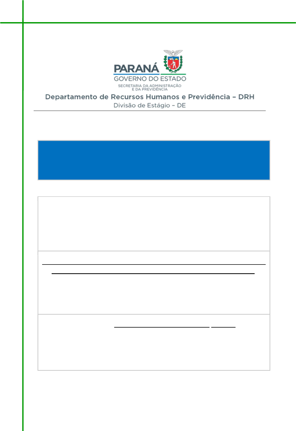 <p>1</p><p>EDITAL ESTÁGIO OBRIGATÓRIO. ESTE EDITAL NÃO É</p><p>DESTINADO PARA OS CURSOS DE LICENCIATURA</p><p>O lançamento de oferta de vagas de estágio obrigatório (não remunerado), será</p><p>realizada pelos órgãos a partir da apresentação dos documentos constantes no</p><p>presente edital pelos estudantes às unidades de recursos humanos constantes</p><p>na relação de órgãos/contratantes anexada no presente edital.</p><p>AS OFERTAS DE VAGAS DE ESTÁGIO OBRIGATÓRIO PARA LICENCIANDOS, SÃO</p><p>ADMINISTRADOS PELA SECRETARIA DE ESTADO DA EDUCAÇÃO – SEED,</p><p>DE ACORDO COM O CONTIDO NO ARTIGO 19 DO DECRETO ESTADUAL</p><p>5.283/2020 E A RESOLUÇÃO Nº 1.306/2022/GS/SEED (DISPONÍVEL NO SITE</p><p>https://professor.escoladigital.pr.gov.br/estagio_obrigatorio)</p><p>De acordo com o contido no § 1º do Art. 15, do Decreto Estadual nº 5283/2020, “ É vedado</p><p>aos órgãos da Administração Pública e às entidades autárquicas e fundacionais integrantes</p><p>do Poder Executivo Estadual, incluindo as Instituições Estaduais de Ensino Superior - IEES,</p><p>firmarem, de modo concomitante, o Termo de Compromisso de Estágio não obrigatório e</p><p>Termo de Compromisso de Estágio obrigatório com o mesmo estudante. ”</p><p>2</p><p>INFORMAÇÕES IMPORTANTES</p><p>Para realização do estágio curricular obrigatório (não remunerado), é</p><p>necessário que o curso do estudante preencha os requisitos e que ele esteja</p><p>matriculado no semestre/período que tenha esta previsão. Atividade prática,</p><p>optativa, extracurricular ou complementar que não esteja definida como estágio</p><p>obrigatório no projeto, não poderá ser aceita para evitar a caracterização de</p><p>vínculo empregatício.</p><p>1.REQUISITOS PARA ESTUDANTES</p><p>Para realização do Estágio Obrigatório, além do contido no Art. 2º, § 1º da Lei</p><p>Federal nº 11.788/2008 e no Decreto Estadual nº 5283/2020, os estudantes deverão</p><p>preencher os seguintes requisitos:</p><p>1.1. Para que o estudante possa fazer seu cadastro para estagiar nos Órgãos e</p><p>Entidades da Administração Pública Estadual Direta e Indireta, é obrigatório que sua</p><p>Instituição de Ensino esteja com o Termo de Convênio firmado com o Governo do</p><p>Estado do Paraná por meio da Central de Estágio, ativo de acordo com a Lei Federal</p><p>nº 11.788/2008 e o Artigos 34 e 36, do Decreto Estadual nº 5283/2020</p><p>1.2. É obrigatório que o seu cadastro esteja atualizado no site da Central de Estágio</p><p>(www.centraldeestagio.pr.gov.br> aba Estudante > Cadastro do Estudante);</p><p>1.3. É importante que antes da participação, para os estudantes que já possuem</p><p>cadastro na Central de Estágio que mantenham seus dados cadastrais atualizados</p><p>antes de candidatar-se nas ofertas de vagas de estágio.</p><p>1.4. A atualização do cadastro do estudante deverá ser realizada necessariamente</p><p>antes de candidatar-se na vaga evitando que seu nome seja excluído da lista de</p><p>inscritos;</p><p>1.5. O estudante deverá apresentar a intenção de vagas de estágio obrigatório (não</p><p>remunerado) para UNIDADE DE RECURSOS HUMANOS do órgão onde o estagiário</p><p>selecionou para fazer estágio. Vaga esta que será lançada no site:</p><p>www.centraldeestagio.pr.gov.br> Estágio OBRIGATÓRIO > Ofertas de Vaga ></p><p>Pesquisar o curso > Candidatar-se);</p><p>3</p><p>1.6. Para que o estudante possa fazer seu cadastro para estagiar nos Órgãos e</p><p>Entidades da Administração Pública Estadual Direta e Indireta, é obrigatório que sua</p><p>Instituição de Ensino esteja com o Termo de Convênio firmado com o Governo do</p><p>Estado do Paraná por meio da Central de Estágio, ativo de acordo com a Lei Federal</p><p>nº 11.788/2008 e o Artigos 34 e 36, do Decreto Estadual nº 5283/2020.</p><p>1.7. É obrigatório que o seu cadastro esteja atualizado no site da Central de Estágio</p><p>(www.centraldeestagio.pr.gov.br> aba Estudante > Cadastro do Estudante);</p><p>1.8. É importante que antes da participação, para os estudantes que já possuem</p><p>cadastro na Central de Estágio que mantenham seus dados cadastrais atualizados</p><p>antes de candidatar-se nas ofertas de vagas de estágio.</p><p>1.9. A atualização do cadastro do estudante deverá ser realizada necessariamente</p><p>antes de candidatar-se na vaga evitando que seu nome seja excluído da lista de</p><p>inscritos;</p><p>1.10. Após o lançamento da oferta de vaga de estágio obrigatório proposta pelo</p><p>estudante, ao órgão contratante, deverá o mesmo acessar site:</p><p>www.centraldeestagio.pr.gov.br> Estágio OBRIGATÓRIO > Ofertas de Vaga ></p><p>Pesquisar o curso > Candidatar-se);</p><p>DOCUMENTO RESPONSÁVEL</p><p>Cópia do RG e CPF do estudante Estudante</p><p>Cópia da Apólice de Seguro de Vida Instituição de Ensino</p><p>Declaração de matrícula do estudante Instituição de Ensino</p><p>Grade Curricular do curso Instituição de Ensino</p><p>Formulário de solicitação de Estágio Obrigatório Instituição de Ensino OU Estudante</p><p>Termo de Ciência assinado Estudante</p><p>Termo de Compromisso de Estágio –TCE GRHS/URH selecionada para estagiar</p><p>2. REQUISITOS PARA AS INSTITUIÇÕES DE ENSINO</p><p>2.1 Possuir Termo de Convênio firmado com o Governo do Estado do Paraná,</p><p>por intermédio da Secretaria de Estado da Administração e da Previdência, o qual</p><p>tem a validade de 24 (vinte e quatro) meses, a partir da data de assinatura, de</p><p>acordo com o Art. 11 da Lei Federal 11.788/08 e os Artigos. 34 e 36, do Decreto</p><p>Estadual nº 5283/2020. Cabendo exclusivamente a cada instituição de ensino</p><p>renovar os Termos de Convênio quando expirar a vigência;</p><p>2.2 De acordo Art. 9º, inciso IV da Lei Federal nº 11.788/2008, não é</p><p>permitido aos estudantes a contratação de empresa especializada para</p><p>formulação do contrato d