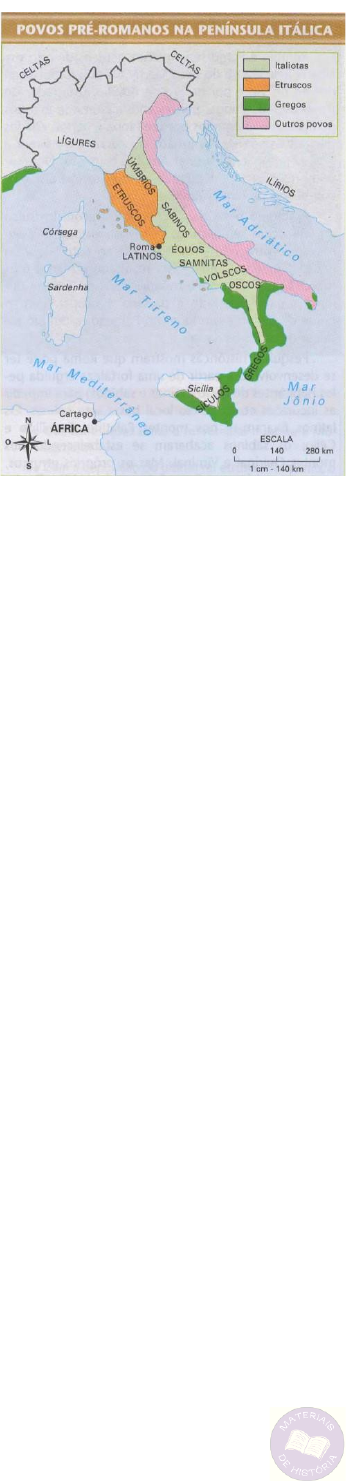 <p>www.materiaisdehistoria.com.br</p><p>Resumo sobre Roma Antiga</p><p>1. Localização: Península Itálica</p><p>2. Origens de Roma:</p><p>• Lendária: Mito de Rômulo e Remo: Segundo a tradição, os netos</p><p>de Enéias, rei de Tróia, foram criados por uma loba e vieram a</p><p>fundar a cidade de Roma, sendo Rômulo o primeiro rei Romano.</p><p>• Histórica: Fortaleza de italiotas contra o avanço de povos Etruscos.</p><p>3. Períodos da História Romana:</p><p>• Monarquia (753-509 a.C.) - República (509-27 a.C.) - Império (27</p><p>a.C. - 476 a.C.)</p><p>4. A Monarquia Romana (753-509 a.C.)</p><p>• Poucas informações e documentos históricos</p><p>• Seis reis após Rômulo</p><p>• O rei governava e concentrava poderes, mas consultava o Senado</p><p>(conselho de patrícios).</p><p>• Classes da sociedade romana:</p><p>o Patrícios: Elite, nascidos nas famílias mais nobres.</p><p>Proprietários de terras e de escravos. “Patrício” significa</p><p>“aquele que tem pai”, em referência à origem nobre.</p><p>o Clientes: Viviam juntos aos patrícios e deviam favores a eles.</p><p>o Plebeus: População livre e pobre de Roma. Eram obrigados a trabalhar, pagar impostos e servir como</p><p>base do exército romano.</p><p>o Escravos: Eram propriedade de outra pessoa, geralmente patrícios. Não eram cidadãos. Eram</p><p>capturados em guerras, por nascerem filhos de escravos ou por dívidas.</p><p>• Queda da Monarquia: O último rei de Roma (Tarquínio) foi deposto após tentar reduzir a influência dos</p><p>Patrícios no governo. Após ser deposto, há a formação da República Romana em 509 a.C.</p><p>5. A República Romana (509-27 a.C.)</p><p>• República significa “Coisa Pública” ('res' = coisa; 'pública' = pública). Apesar de o nome valorizar o “público”, na</p><p>prática, a política privilegiava os Patrícios.</p><p>• Principais cargos públicos:</p><p>• Senado: Autoridade máxima na República. Composto por trezentos patrícios, decidiam leis e</p><p>questões importantes da política externa e interna.</p><p>• Magistrados: Cargos públicos eletivos. Exemplos:</p><p>• Cônsules – presidiam o senado e as assembleias.</p><p>• Pretores – justiça.</p><p>• Questores – tesouro público.</p><p>• Censores – contagem e alistamento da população.</p><p>• Assembleias: Reunião de cidadãos que elegia cargos e opinava sobre as leis. A mais importante era</p><p>a Assembleia Centuriata, comandada pelos patrícios.</p><p>• Característica da Sociedade Romana: Patriarcal - tudo girava em torno do Pater Familias (pai, o “chefe” de</p><p>família”). Mulheres não eram consideradas cidadãs, embora tivessem condições melhores que em Atenas.</p><p>• O período republicano foi marcado por conflitos entre Patrícios e Plebeus. Foram fundamentais para conquista</p><p>de direitos da Plebe. Alguns eventos importantes:</p><p>• Revolta do Monte Sagrado (494 a.C.): Plebeus abandonam a cidade de Roma numa espécie de</p><p>greve. Conquistam o cargo de Tribuno da Plebe, representante dos plebeus no Senado.</p><p>• Outras conquistas:</p><p>Figura 1: Fonte: ARRUDA, José Jobson. Toda a</p><p>História. São Paulo: Editora Ática, 2006. p. 65</p><p>www.materiaisdehistoria.com.br</p><p>• 450 a.C.: Lei das Doze Tábuas: As leis romanas passaram a ser escritas e todos poderiam</p><p>consulta-las.</p><p>• 445 a.C. Lei Canuléia: Permitia o casamento entre Patrício e Plebeu.</p><p>• Durante a República, ocorre a expansão territorial</p><p>romana:</p><p>• Roma domina primeiro a Península Itálica,</p><p>garantindo abastecimento da cidade.</p><p>• Em seguida, avança para o Mediterrâneo nas</p><p>chamadas Guerras Púnicas (264 – 201 a.C.), disputada entre</p><p>romanos e cartagineses. Ao todo são três Guerras Púnicas, que</p><p>terminam com a vitória de Roma e seu domínio no Mediterrâneo.</p><p>• Com o domínio do Mediterrâneo, a expansão se</p><p>acelera com o transporte marítimo. Atinge o Norte da África, a</p><p>Grécia, a Ásia Menor e a Península Ibérica.</p><p>• Consequência da expansão: Surgimento da classe</p><p>dos cavaleiros, comerciantes enriquecidos que compravam títulos</p><p>de nobreza.</p><p>• Crise da República:</p><p>• Rápidas vitórias militares fazem com que muitos</p><p>escravos entrem no mundo Romano. Trabalham nas fazendas dos</p><p>Patrícios.</p><p>• Ao mesmo tempo, a concentração de terras se</p><p>agrava. Terras conquistadas eram repassadas a generais patrícios.</p><p>• Grandes propriedades patrícias trabalhadas por</p><p>escravos geram uma concorrência desleal, falindo pequenos os</p><p>agricultores plebeus. Estes começam a protestar por direitos nas</p><p>cidades romanas.</p><p>• Ocorrência de revoltas de escravos (Ex. Spartacus).</p><p>• Proposta de Solução para a Crise:</p><p>• Tibério e Caio Graco – Reforma Agrária. Não é aceita pelos patrícios poderosos e são assassinados.</p><p>• Revoltas dos plebeus e escravos levam à formação do Primeiro Triunvirato, governo formado por generais</p><p>populares.</p><p>• 1º Triunvirato: César, Pompeu e Crasso. César acaba se tornando Ditador Vitalício e sofre um</p><p>atentado dos senadores, preocupados em perder o poder para o general.</p><p>• 2º Triunvirato: Marco Antônio, Otávio e Lépido. Disputas internas, resulta na coroação de Otávio</p><p>como Imperador dos Romanos.</p><p>6. O Império Romano</p><p>• Poder político: Imperador de Roma controla o poder político. Pode declarar guerras, criar e aprovar leis por si</p><p>só e concentra as atribuições dos magistrados.</p><p>• Características do período Imperial de Roma:</p><p>• Pax Romana: Período de paz interna no Império, em contraste às crises da República.</p><p>• Política do Pão e Circo – Distribuição de pão e organização de espetáculos para desmobilizar os</p><p>Plebeus dos protestos.</p><p>• C